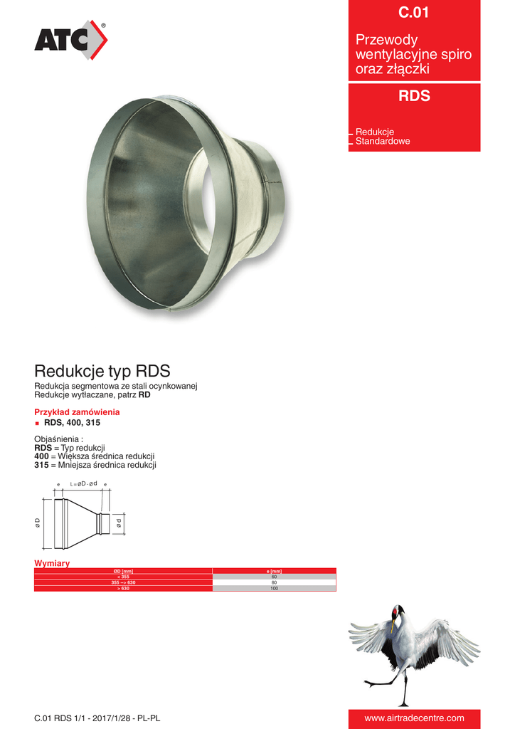 C.01 Przewody wentylacyjne spiro oraz złączki RDS Redukcje Standardowe Redukcje typ RDS Redukcja segmentowa ze stali ocynkowanej Redukcje wytłaczane, patrz RD Przykład zamówienia ¾ RDS, 400, 315 Objaśnienia : RDS = Typ redukcji 400 = Większa średnica redukcji 315 = Mniejsza średnica redukcji d d D D Wymiary ØD [mm] < 355 355 --> 630 > 630 C.01 RDS 1/1 - 2017/1/28 - PL-PL e [mm] 60 80 100 www.airtradecentre.com