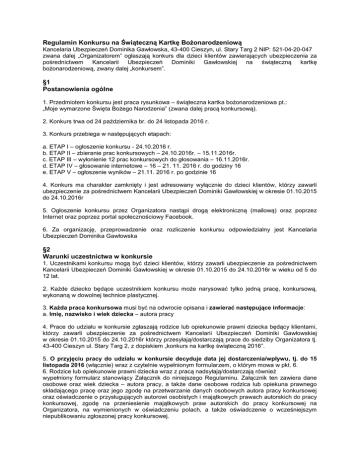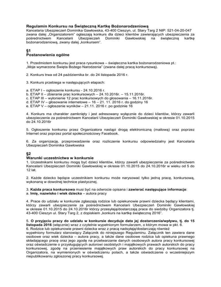 Regulamin Konkursu na Świąteczną Kartkę Bożonarodzeniową Kancelaria Ubezpieczeń Dominika Gawłowska, 43-400 Cieszyn, ul. Stary Targ 2 NIP: 521-04-20-047 zwana dalej „Organizatorem” ogłaszają konkurs dla dzieci klientów zawierających ubezpieczenia za pośrednictwem Kancelarii Ubezpieczeń Dominiki Gawłowskiej na świąteczną kartkę bożonarodzeniową, zwany dalej „konkursem”. §1 Postanowienia ogólne 1. Przedmiotem konkursu jest praca rysunkowa – świąteczna kartka bożonarodzeniowa pt.: „Moje wymarzone Święta Bożego Narodzenia” (zwana dalej pracą konkursową). 2. Konkurs trwa od 24 października br. do 24 listopada 2016 r. 3. Konkurs przebiega w następujących etapach: a. ETAP I – ogłoszenie konkursu - 24.10.2016 r. b. ETAP II – zbieranie prac konkursowych – 24.10.2016r. – 15.11.2016r. c. ETAP III – wyłonienie 12 prac konkursowych do głosowania – 16.11.2016r. d. ETAP IV – głosowanie internetowe – 16 – 21. 11. 2016 r. do godziny 16 e. ETAP V – ogłoszenie wyników – 21.11. 2016 r. po godzinie 16 4. Konkurs ma charakter zamknięty i jest adresowany wyłącznie do dzieci klientów, którzy zawarli ubezpieczenie za pośrednictwem Kancelarii Ubezpieczeń Dominiki Gawłowskiej w okresie 01.10.2015 do 24.10.2016r 5. Ogłoszenie konkursu przez Organizatora nastąpi drogą elektroniczną (mailową) oraz poprzez Internet oraz poprzez portal społecznościowy Facebook. 6. Za organizację, przeprowadzenie oraz rozliczenie konkursu odpowiedzialny jest Kancelaria Ubezpieczeń Dominika Gawłowska §2 Warunki uczestnictwa w konkursie 1. Uczestnikami konkursu mogą być dzieci klientów, którzy zawarli ubezpieczenie za pośrednictwem Kancelarii Ubezpieczeń Dominiki Gawłowskiej w okresie 01.10.2015 do 24.10.2016r w wieku od 5 do 12 lat. 2. Każde dziecko będące uczestnikiem konkursu może narysować tylko jedną pracę, konkursową, wykonaną w dowolnej technice plastycznej. 3. Każda praca konkursowa musi być na odwrocie opisana i zawierać następujące informacje: a. Imię, nazwisko i wiek dziecka – autora pracy 4. Prace do udziału w konkursie zgłaszają rodzice lub opiekunowie prawni dziecka będący klientami, którzy zawarli ubezpieczenie za pośrednictwem Kancelarii Ubezpieczeń Dominiki Gawłowskiej w okresie 01.10.2015 do 24.10.2016r którzy przesyłają/dostarczają prace do siedziby Organizatora tj. 43-400 Cieszyn ul. Stary Targ 2, z dopiskiem „konkurs na kartkę świąteczną 2016”. 5. O przyjęciu pracy do udziału w konkursie decyduje data jej dostarczenia/wpływu, tj. do 15 listopada 2016 (włącznie) wraz z czytelnie wypełnionym formularzem, o którym mowa w pkt. 6. 6. Rodzice lub opiekunowie prawni dziecka wraz z pracą nadsyłają/dostarczają również wypełniony formularz stanowiący Załącznik do niniejszego Regulaminu. Załącznik ten zawiera dane osobowe oraz wiek dziecka – autora pracy, a także dane osobowe rodzica lub opiekuna prawnego składającego pracę oraz jego zgodę na przetwarzanie danych osobowych autora pracy konkursowej oraz oświadczenie o przysługujących autorowi osobistych i majątkowych prawach autorskich do pracy konkursowej, zgodę na przeniesienie majątkowych praw autorskich do pracy konkursowej na Organizatora, na wymienionych w oświadczeniu polach, a także oświadczenie o wcześniejszym niepublikowaniu zgłoszonej pracy konkursowej. 7. Brak wypełnionego i podpisanego formularza przez rodzica lub opiekuna prawnego autora pracy konkursowej skutkuje niedopuszczeniem danej pracy do udziału w konkursie. 8. Prace konkursowe przesłane do niniejszego konkursu nie podlegają zwrotowi. §3 Zasady konkursu 1. Organizator powołuje Kapitułę/Jury składające się 4 osób w składzie: Dominika Gawłowska – właściciel Kancelarii Ubezpieczeń Dominika Gawłowska Teresa Tolasz – Doradca Klienta Kancelarii Ubezpieczeń Dominika Gawłowska Joanna Lipa - Doradca Klienta Kancelarii Ubezpieczeń Dominika Gawłowska Sylwia Widzyk- Doradca Klienta Kancelarii Ubezpieczeń Dominika Gawłowska 2. Wszystkie prace konkursowe będą oceniane wg kryterium oryginalności pomysłów i jak najlepszego oddania w pracy tematu konkursu, czyli „wymarzonych Świąt Bożego Narodzenia”. 3. W III etapie konkursu Kapituła/Jury, po zapoznaniu się ze wszystkimi pracami, wyłania 12 prac konkursowych, które będą reprezentowały 4. W IV etapie 12 prac wybranych przez Kapitułę konkursu zostanie poddanych internetowemu głosowaniu 5. W wyniku głosowania wyłonione zostaną 3 zwycięskie prace, na podstawie największej liczby uzyskanych głosów/polubień. W przypadku uzyskania takiej samej liczby głosów przez klika prac – decyzję o wygranych podejmie Kapituła/Jury. 6. Zwycięskie prace (po niezbędnej obróbce graficznej) zostaną przekazane do druku i/lub będą podstawą do stworzenia kartki elektronicznej i staną się automatycznie oficjalnymi kartkami bożonarodzeniowymi marki Kancelaria Ubezpieczeń Dominika Gawłowska 7. Nazwiska laureatów konkursu zostaną opublikowane w Internecie do publicznej wiadomości niezwłocznie po rozstrzygnięciu konkursu. §4 Nagrody 1. Trzech zwycięzców konkursu otrzyma równorzędne nagrody finansowe, każda w wysokości 166,66zł brutto (słownie: trzysta trzydzieści trzy złote 00/100), tj. 150 zł netto. 2. Fundatorami nagród brutto jest Kancelaria Ubezpieczeń Dominika Gawłowska. 3. Laureat otrzyma nagrodę netto. Nagrody netto zostaną przekazane laureatom nie później niż do 15 grudnia 2016. §5 Postanowienia końcowe 1. Niniejszy Regulamin jest jedynym dokumentem określającym zasady konkursu. 2. Zgłoszenie do konkursu pracy konkursowej jest jednoznaczne z akceptacją warunków niniejszego Regulaminu. 3. Organizatorowi przysługuje wyłączne prawo do: a. gromadzenia i przechowywania prac konkursowych nadsyłanych na Konkurs, b. wyłonienia zdobywców nagród w oparciu o zasady określone w niniejszym Regulaminie. 4. Organizator nie odpo