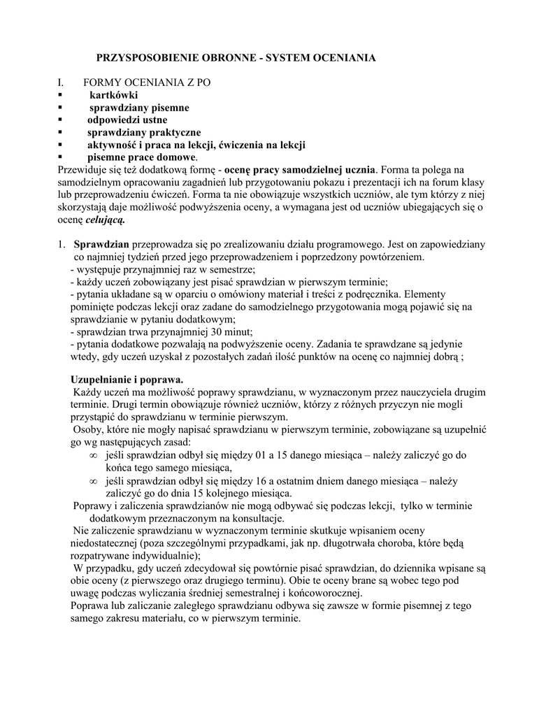 PRZYSPOSOBIENIE OBRONNE - SYSTEM OCENIANIA I. FORMY OCENIANIA Z PO kartkówki sprawdziany pisemne odpowiedzi ustne sprawdziany praktyczne aktywność i praca na lekcji, ćwiczenia na lekcji pisemne prace domowe. Przewiduje się teŜ dodatkową formę - ocenę pracy samodzielnej ucznia. Forma ta polega na samodzielnym opracowaniu zagadnień lub przygotowaniu pokazu i prezentacji ich na forum klasy lub przeprowadzeniu ćwiczeń. Forma ta nie obowiązuje wszystkich uczniów, ale tym którzy z niej skorzystają daje moŜliwość podwyŜszenia oceny, a wymagana jest od uczniów ubiegających się o ocenę celującą. 1. Sprawdzian przeprowadza się po zrealizowaniu działu programowego. Jest on zapowiedziany co najmniej tydzień przed jego przeprowadzeniem i poprzedzony powtórzeniem. - występuje przynajmniej raz w semestrze; - kaŜdy uczeń zobowiązany jest pisać sprawdzian w pierwszym terminie; - pytania układane są w oparciu o omówiony materiał i treści z podręcznika. Elementy pominięte podczas lekcji oraz zadane do samodzielnego przygotowania mogą pojawić się na sprawdzianie w pytaniu dodatkowym; - sprawdzian trwa przynajmniej 30 minut; - pytania dodatkowe pozwalają na podwyŜszenie oceny. Zadania te sprawdzane są jedynie wtedy, gdy uczeń uzyskał z pozostałych zadań ilość punktów na ocenę co najmniej dobrą ; Uzupełnianie i poprawa. KaŜdy uczeń ma moŜliwość poprawy sprawdzianu, w wyznaczonym przez nauczyciela drugim terminie. Drugi termin obowiązuje równieŜ uczniów, którzy z róŜnych przyczyn nie mogli przystąpić do sprawdzianu w terminie pierwszym. Osoby, które nie mogły napisać sprawdzianu w pierwszym terminie, zobowiązane są uzupełnić go wg następujących zasad: • jeśli sprawdzian odbył się między 01 a 15 danego miesiąca – naleŜy zaliczyć go do końca tego samego miesiąca, • jeśli sprawdzian odbył się między 16 a ostatnim dniem danego miesiąca – naleŜy zaliczyć go do dnia 15 kolejnego miesiąca. Poprawy i zaliczenia sprawdzianów nie mogą odbywać się podczas lekcji, tylko w terminie dodatkowym przeznaczonym na konsultacje. Nie zaliczenie sprawdzianu w wyznaczonym terminie skutkuje wpisaniem oceny niedostatecznej (poza szczególnymi przypadkami, jak np. długotrwała choroba, które będą rozpatrywane indywidualnie); W przypadku, gdy uczeń zdecydował się powtórnie pisać sprawdzian, do dziennika wpisane są obie oceny (z pierwszego oraz drugiego terminu). Obie te oceny brane są wobec tego pod uwagę podczas wyliczania średniej semestralnej i końcoworocznej. Poprawa lub zaliczanie zaległego sprawdzianu odbywa się zawsze w formie pisemnej z tego samego zakresu materiału, co w pierwszym terminie. 2. Kartkówki są pisemną formą sprawdzenia wiadomości i mogą obejmować: • ostatnie trzy tematy lekcyjne – zapowiadana; • materiał będący przedmiotem pracy domowej; • zagadnienia z lekcji bieŜącej (tzw. mini kartkówka); Czas trwania kartkówki: do 15 minut (na początku lub pod koniec lekcji); Zaliczanie zaległych i ewentualne poprawy kartkówek odbywają się na tych samych zasadach, jak w przypadku sprawdzianów (patrz: UZUPEŁNIANIE I POPRAWA). Praca domowa powinna być wykonana i oddana w ustalonym terminie. Niewykonanie lub nieoddanie pracy w terminie powoduje otrzymanie oceny niedostatecznej. 3. Uczeń ma prawo do zgłoszenia nieprzygotowania, jeden raz w semestrze. Dotyczy to wyłącznie odpowiedzi ustnych i prac domowych. Nie dotyczy zapowiedzianych sprawdzianów, kartkówek i prac których termin oddania został wcześniej ustalony. Zgłoszenie nieprzygotowania nie zwalnia ucznia z udziału w lekcji bieŜącej. Zgłoszenie nieprzygotowania następuje zawsze na początku lekcji osobiście przez ucznia. Osoba, która (bez wyraźnego powodu) spóźnia się na lekcję, nie moŜe zgłosić nieprzygotowania. Nie moŜna równieŜ zgłosić nieprzygotowania za osobę nieobecną na początku lekcji; Prowadzenie zeszytu przedmiotowego jest obowiązkowe i ma wpływ na ocenę semestralną i końcową. 4. Podczas oceniania kartkówek i sprawdzianów stosuje się następujące progi procentowe: • 0%-39%- ocena niedostateczna • 40%-54%- ocena dopuszczająca • 55%-74%- ocena dostateczna • 75%- 89%- ocena dobra • 90%-100%- ocena bardzo dobra Ocena semestralna (roczna) obliczana jest ze średniej waŜonej, przy czym obowiązują następujące wagi: • sprawdzian pisemny i praktyczny - waga 3 • kartkówka, odpowiedź ustna, referat - waga 2 • praca domowa, aktywność, ćwiczenia na lekcji - waga 1 • ocena z pierwszego semestru przy ustalaniu oceny rocznej – waga 4 Dla ocen semestralnych i końcoworocznych ustala się następujące progi: • średnia ocen od 1,65 – ocena dopuszczająca • średnia ocen od 2,65 – ocena dostateczna • średnia ocen od 3,65 – ocena dobra • średnia ocen od 4,7 – ocena bardzo dobra • jeŜeli średnia ocen z pierwszego semestru będzie równa lub wyŜsza niŜ 1,65, lecz niŜsza niŜ 1,70 – wpisana zostaje ocena -2 (do średniej liczona jako 1,75); • jeŜeli średnia ocen z pierwszego semestru będzie równa lub wyŜsza niŜ 1,70, lecz niŜsza niŜ 2,50 – wpisana zostaje ocena 2 (do średniej liczona jako 2); • jeŜeli średnia ocen z pierwszego semestru będzie równa lub wyŜsza niŜ 2,50, lecz niŜsza niŜ 2,65 – wpisana zostaje ocena +2 (do średniej liczona jako 2,5); • analogiczne przedziały: dla -3 [2,65; 2,70), dla 3 [2,70; 3,50), dla +3: [3,50; 3,65); • dla -4 [3,65; 3,70), dla 4 [3,70; 4,55), dla +4: [4,55; 4,70); • dla -5 [4,70; 4,75), dla 4 [4,75; 4,95), dla +4: [4,95; 5,00). II. Kryteria oceniania. Osiągnięcia ucznia określa się wg kategorii: A zapamiętanie wiadomości B zrozumienie wiadomości C stosowanie wiadomości w sytuacjach typowych D stosowanie wiadomości w sytuacjach nietypowych Do oceny wyników przyjmuje się kryteria określone wyŜej wymienionymi kategoriami. Ocenę dopuszczającą otrzymuje ucze