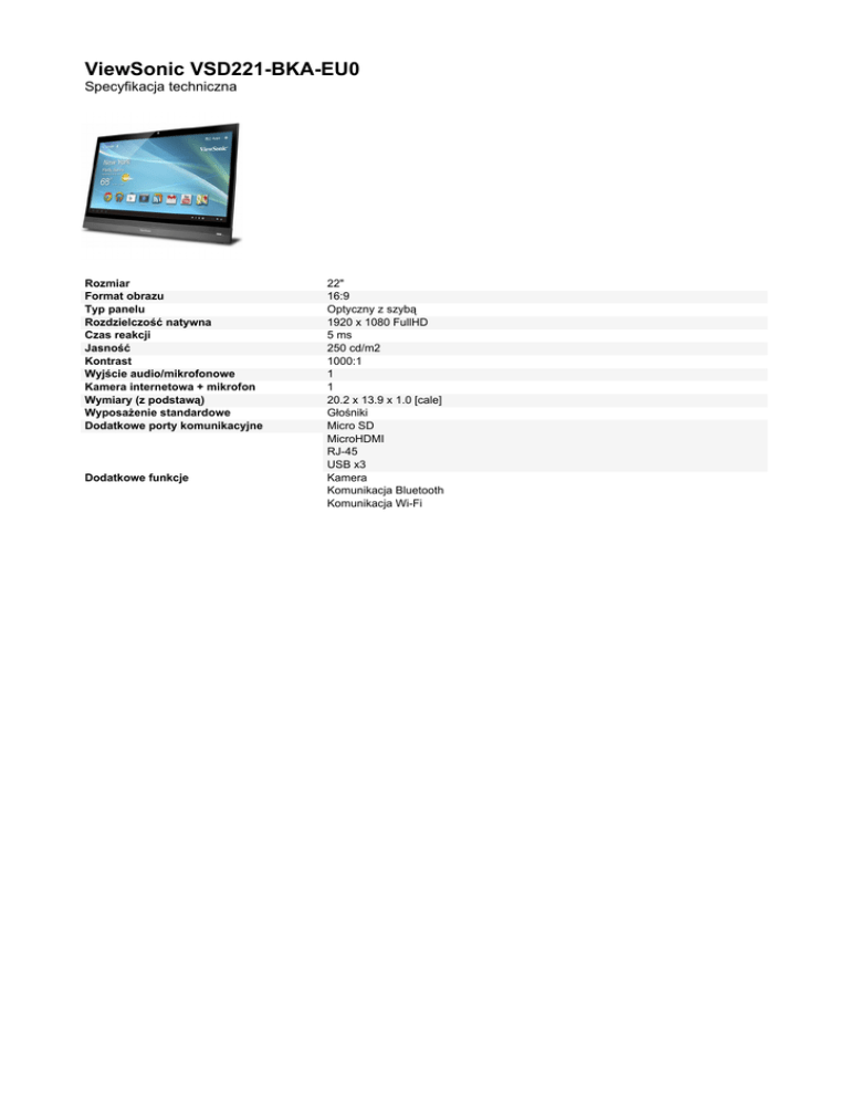 ViewSonic VSD221-BKA-EU0 Specyfikacja techniczna Rozmiar Format obrazu Typ panelu Rozdzielczość natywna Czas reakcji Jasność Kontrast Wyjście audio/mikrofonowe Kamera internetowa + mikrofon Wymiary (z podstawą) Wyposażenie standardowe Dodatkowe porty komunikacyjne Dodatkowe funkcje 22" 16:9 Optyczny z szybą 1920 x 1080 FullHD 5 ms 250 cd/m2 1000:1 1 1 20.2 x 13.9 x 1.0 [cale] Głośniki Micro SD MicroHDMI RJ-45 USB x3 Kamera Komunikacja Bluetooth Komunikacja Wi-Fi