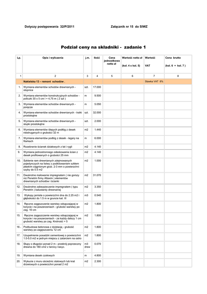Dotyczy postępowania 32/P/2011 Załącznik nr 15 do SIWZ Podział ceny na składniki - zadanie 1 Lp. 1 Opis i wyliczenia j.m. 2 3 Ilość 4 Nakielska 13 – remont schodów . Cena Wartość netto zł jednostkowa netto zł (kol. 4 x kol. 5) 5 6 Wartość Cena brutto VAT (kol. 6 + kol. 7 ) 7 Stawka VAT 8% 1. Wymiana elementów schodów drewnianych stopnice szt. 17.000 2. Wymiana elementów konstrukcyjnych schodów policzki 30 x 5 cm l = 4,75 m ( 2 szt ) m 9.500 3. Wymiana elementów schodów drewnianych poręcze m 5.050 4. Wymiana elementów schodów drewnianych - tralki prostokątne szt. 32.000 5. Wymiana elementów schodów drewnianych słupki prostokątne szt. 2.000 6. Wymiana elementów ślepych podłóg z desek niestruganych o grubości 32 m m2 1.440 7. Wymiana elementów podłóg z desek - legary na filarkach m 6.000 8. Rozebranie ścianek działowych z łat i rygli m2 4.140 9. Wymiana jednostronnego odeskowania ścian z desek profilowanych o grubości 25 mm m2 4.140 10. Szklenie ram drewnianych zdejmowanych pojedynczych na listwy z podkitowaniem szkłem płaskim ciągnionym grub. 2-3 mm o powierzchni szyby do 0.5 m2 m2 1.000 11. Dwukrotne malowanie impregnatem ( nie gorszy niz Penetrin firmy Altaxim ) elementów drewnianych schodów i ścianki m2 31.070 12. Dwukrotne zabezpieczenie impregnatem ( typu Penetrin ) balustardy drewnainej m2 3.350 13. Wykopy jamiste o powierzchni dna do 2.25 m2 i głębokości do 1.5 m w gruncie kat. III m3 0.540 14. Ręczne zagęszczenie warstwy odsączającej w korycie i na poszerzeniach - grubość warstwy po zag. 10 cm m2 1.800 15. Ręczne zagęszczenie warstwy odsączającej w korycie i na poszerzeniach - za każdy dalszy 1 cm grubość warstwy po zag. Krotność = 5 m2 1.800 16 . Podbudowa betonowa z dylatacją - grubość warstwy po zagęszczeniu 12 cm m2 1.800 17. Uzupełnienie posadzki cementowej o powierzchni 1.0-5.0 m2 w jednym miejscu z zatarciem na ostro m2 1.800 18. Słupy o długości ponad 2 m - przekrój poprzeczny drewna do 180 cm2 z tarcicy nasyc. m3 drew . 0.070 19. Wymiana desek czołowych m 4.800 20. Wykucie z muru ościeżnic stalowych lub krat drzwiowych o powierzchni ponad 2 m2 m2 2.300 8 Lp. Opis i wyliczenia 21 Wykonanie klapy zamknięcia wejscia do piwnicy j.m. Ilość m2 2.300 22. Wywiezienie gruzu spryzmowanego samochodami skrzyniowymi na odległość do 1 km m3 1.000 23. Wywiezienie gruzu spryzmowanego samochodami skrzyniowymi - za każdy następny 1 km Krotność = 20 m3 1.000 24. Utylizacja odpadów m3 1.000 Cena Wartość netto zł jednostkowa netto zł (kol. 4 x kol. 5) Wartość Cena brutto VAT (kol. 6 + kol. 7 ) Cena BRUTTO OFERTY - suma pozycji 1-24 kolumny 8 ( którą należy przenieść do pkt 1 Formularza Ofertowego ) Uwaga : Ceny jednostkowe netto pozycji przedmiarowych ujęte w zestawieniu cen jednostkowych, stanowić będą podstawę do określenia obniżki wynagrodzenia Wykonawcy z tytułu zaniechania ( rezygnacji) wykonania części prac na żądanie Zamawiającego i powinny uwzględniać sumę kosztów bezpośredniej robocizny, materiał i pracy sprzętu oraz kosztów pośrednich i zysku, wyliczoną na jednostkę przedmiarową robót podstawowych . ................................................................................................. ( podpisy osób/osoby wskazanych w dokumencie, uprawnionej / uprawnionych do występowania w obrocie prawnym, reprezentowania wykonawcy i składania oświadczeń woli w jego imieniu )