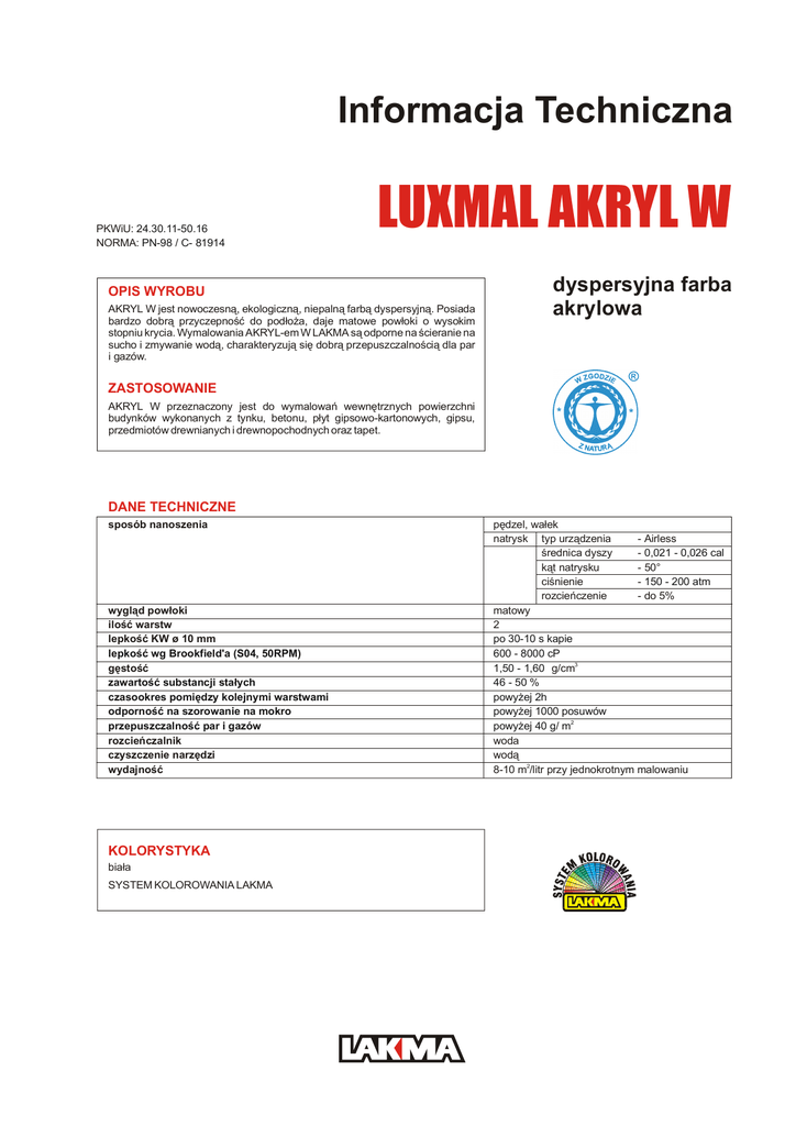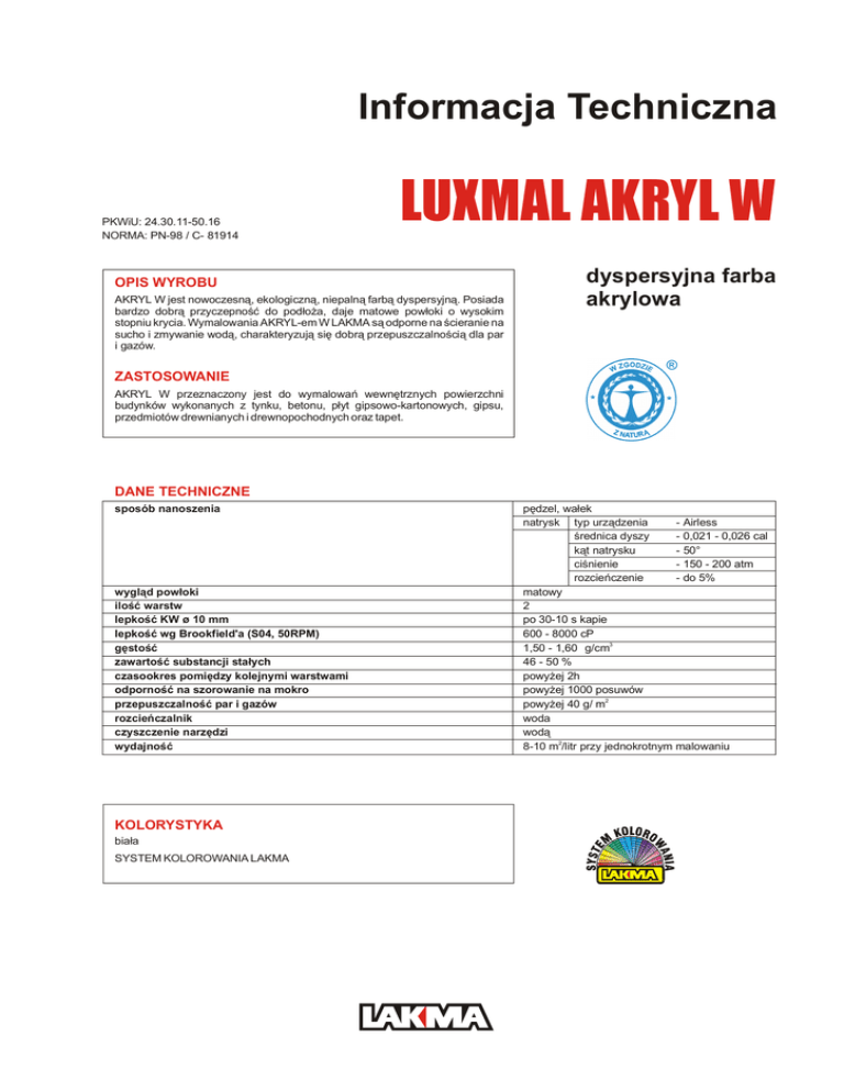 Informacja Techniczna PKWiU: 24.30.11-50.16 NORMA: PN-98 / C- 81914 LUXMAL AKRYL W OPIS WYROBU AKRYL W jest nowoczesną, ekologiczną, niepalną farbą dyspersyjną. Posiada bardzo dobrą przyczepność do podłoŜa, daje matowe powłoki o wysokim stopniu krycia. Wymalowania AKRYL-em W LAKMA są odporne na ścieranie na sucho i zmywanie wodą, charakteryzują się dobrą przepuszczalnością dla par i gazów. ZASTOSOWANIE dyspersyjna farba akrylowa ® AKRYL W przeznaczony jest do wymalowań wewnętrznych powierzchni budynków wykonanych z tynku, betonu, płyt gipsowo-kartonowych, gipsu, przedmiotów drewnianych i drewnopochodnych oraz tapet. DANE TECHNICZNE sposób nanoszenia wygląd powłoki ilość warstw lepkość KW ø 10 mm lepkość wg Brookfield'a (S04, 50RPM) gęstość zawartość substancji stałych czasookres pomiędzy kolejnymi warstwami odporność na szorowanie na mokro przepuszczalność par i gazów rozcieńczalnik czyszczenie narzędzi wydajność KOLORYSTYKA biała SYSTEM KOLOROWANIA LAKMA pędzel, wałek natrysk typ urządzenia - Airless średnica dyszy - 0,021 - 0,026 cal kąt natrysku - 50° ciśnienie - 150 - 200 atm rozcieńczenie - do 5% matowy 2 po 30-10 s kapie 600 - 8000 cP 3 1,50 - 1,60 g/cm 46 - 50 % powyŜej 2h powyŜej 1000 posuwów powyŜej 40 g/ m2 woda wodą 8-10 m2/litr przy jednokrotnym malowaniu SPOSÓB STOSOWANIA PodłoŜe musi być suche, czyste, pozbawione luźno związanych elementów. Stare podłoŜe zmywając wodą z dodatkiem detergentu. Usunąć luźno związane z podłoŜem kruszywa i tynki Powierzchnie wcześniej zabezpieczone farbą olejną lub ftalową o dobrej przyczepności do podłoŜa wystarczy przeszlifować i odpylić. Powłoki farb klejowych naleŜy usunąć. Uzupełnić ubytki i rysy. Nowe podłoŜa na bazie cementu moŜna malować po upływie 28 dni sezonowania. Surowe podłoŜe o wysokiej chłonności naleŜy zagruntować gruntem AKRYL G LAKMA lub LUXMAL -grunt drobnocząsteczkowy. LUXMAL AKRYL W naleŜy przed rozpoczęciem prac dokładnie wymieszać. Kolejną warstwę moŜna nakładać po upływie min. 2 godz. Prace malarskie naleŜy wykonywać przy temperaturach powietrza i podłoŜa od + 5°C do +30°C. Bezpośrednio po zakończeniu prac narzędzia umyć wodą. SKŁADOWANIE 12 miesięcy od daty produkcji. Wyrób przechowywać w zamkniętych opakowaniach w temp. od +5°C do +35°C. OPAKOWANIA 3l, 5l, 10l, 20l W systemie kolorowania 2.5l, 5l, 9l BHP i P.PoŜ. Wyrób niepalny. Podczas prac stosować podstawowe zasady BHP. ATESTY Ocena Higieniczna nr B-25/94 wydana przez Państwowy Zakład Higieniczny w Warszawie. LAKMA S.A. 43-400 Cieszyn, ul. Frysztacka 173, Dział SprzedaŜy: tel(033) 8521688, fax (033) 85 10 255 LAKMA S.A. nie odpowiada za jakość wymalowań w przypadku nieprzestrzegania powyŜszych zaleceń.