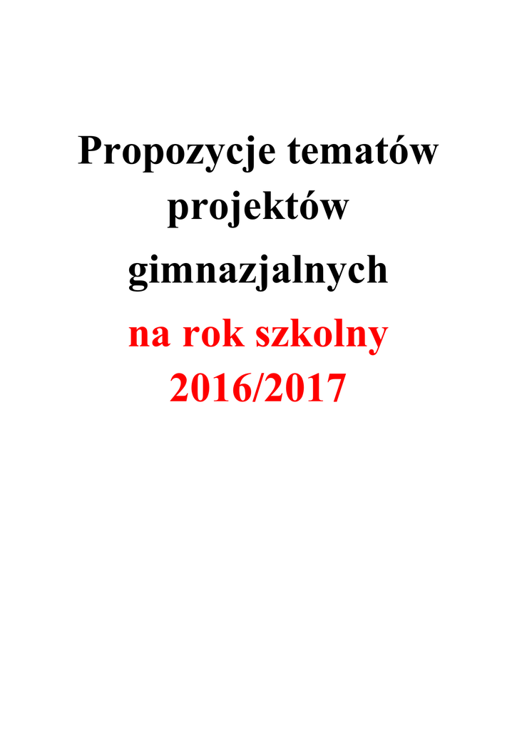 Propozycje tematów projektów gimnazjalnych na rok szkolny 2016/2017 Lp. Nazwisko i imię nauczyciela Temat 1. Bialic Lucyna Jaką rolę pełnią imprezy okolicznościowe w budowaniu tradycji szkoły? Udział w programie artystycznym z okazji zakończenia roku szkolnego 2. Bożek Anna Możliwości rozwoju turystyki w województwie podkarpackim 3. Brudny Jolanta Historia akrobatyki sportowej w klubie ZKS Stal Rzeszów. 4. Byjoś Dorota Wyjaśnij, dlaczego sport może być pasją człowieka? 5. Dworak Dorota 1. Jaki pisarz anglojęzyczny wzbudził twoje zainteresowanie? 2. Którą z postaci w historii Stanów Zjednoczonych chciałbyś poznać i dlaczego? 6. Jaroś Josef Pikor Lucyna Obchodzimy 170. rocznicę objawienia Matki Bożej w francuskim La Salette. Dlaczego Dębowiec nazywany jest „Polskim La Salette”? 7. Fijołek Ewelina Historia akrobatyki sportowej w klubie ZKS Stal Rzeszów. 8. Józefczyk Barbara Jakie zastosowanie mają sole w naszym życiu? Omów na wybranych przykładach 9. Korab Anna Dlaczego czasy Polski Ludowej to życie bez wolności? 10 Kowal Piotr Czy bieganie może być sposobem na życie? 11. Kowalczyk Jolanta 1. Jakie są podobieństwa i różnice w systemie edukacji w Polsce i w Niemczech? 2. Na czym polega fenomen niemieckiej piłki nożnej? 12. Muryas Magdalena Nasza szkoła w statystykach 13. Muszyńska-Dral Agnieszka Porosty wskaźnikiem zanieczyszczenia środowiska. 14. Musiał Grzegorz Czy sportowy tryb życia wpływa na sukces młodego piłkarza? 15. Pajer Barbara 16. Pastuła-Szeląg Brygida Badanie zanieczyszczenia powietrza w różnych miejscach Rzeszowa ` 1.Jacy pisarze francuscy są znani na całym świecie? 2. Sławni Polacy we Francji. Kogo znamy? 17. Peregończyk Wojciech Jak zachować bezpieczeństwo w sieci? 18 Podpora Jacek Droga do największych siatkarskich sukcesów klubowych i reprezentacyjnych w Polsce i na świecie absolwentów naszej szkoły. Jak podążać ich ścieżką i jak wielki to wysiłek? 19. Prokop Natasza Jak na przestrzeni wieków mówiono o miłości? 20. Rozlach Ewa Podróże w wyobraźni, czyli wycieczka turystyczno-krajoznawcza do Niemiec 21. Seroka Maciej Czy polska piłka nożna powinna gonić zachód? Różnice kulturowe i obyczajowe związane z rywalizacją w meczach derbowych w Polsce i Europie Zachodniej 22. Słabczyńska Dorota 1. Co mnie fascynuje w wybranym kraju anglojęzycznym? 2. Czy kobiety wywarły wpływ na historię Wielkiej Brytanii? 23. Supel Barbara Ocena wpływu organizmów prokariotycznych na życie i ewolucję biosfery 24. Wąsacz Bogdan 1. Na czym polegała demokracja szlachecka? 2. Jakie zadania realizuje samorząd naszego miasta? Omów na wybranych przykładach 25. Wisz Grzegorz Z kart historii polskiej i rzeszowskiej siatkówki. Czy mamy się na kim wzorować? 26. Woźniak-Sowa Helena Jak stosujemy prawa fizyki w życiu codziennym? 27. Zieliński Rafał Jakie zagrożenia płyną z Internetu?