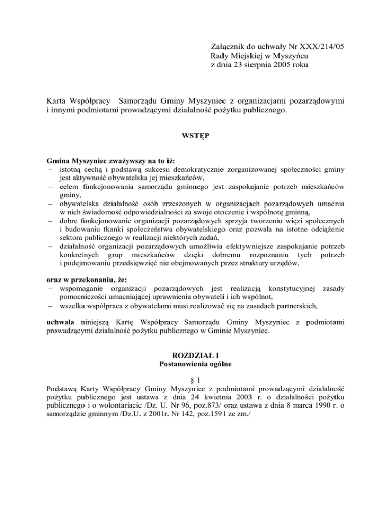 Załącznik do uchwały Nr XXX/214/05 Rady Miejskiej w Myszyńcu z dnia 23 sierpnia 2005 roku Karta Współpracy Samorządu Gminy Myszyniec z organizacjami pozarządowymi i innymi podmiotami prowadzącymi działalność pożytku publicznego. WSTĘP Gmina Myszyniec zważywszy na to iż: − istotną cechą i podstawą sukcesu demokratycznie zorganizowanej społeczności gminy jest aktywność obywatelska jej mieszkańców, − celem funkcjonowania samorządu gminnego jest zaspokajanie potrzeb mieszkańców gminy, − obywatelska działalność osób zrzeszonych w organizacjach pozarządowych umacnia w nich świadomość odpowiedzialności za swoje otoczenie i wspólnotę gminną, − dobre funkcjonowanie organizacji pozarządowych sprzyja tworzeniu więzi społecznych i budowaniu tkanki społeczeństwa obywatelskiego oraz pozwala na istotne odciążenie sektora publicznego w realizacji niektórych zadań, − działalność organizacji pozarządowych umożliwia efektywniejsze zaspokajanie potrzeb konkretnych grup mieszkańców dzięki dobremu rozpoznaniu tych potrzeb i podejmowaniu przedsięwzięć nie obejmowanych przez struktury urzędów, oraz w przekonaniu, że: − wspomaganie organizacji pozarządowych jest realizacją konstytucyjnej zasady pomocniczości umacniającej uprawnienia obywateli i ich wspólnot, − wszelka współpraca z obywatelami musi realizować się na zasadach partnerskich, uchwala niniejszą Kartę Współpracy Samorządu Gminy Myszyniec z podmiotami prowadzącymi działalność pożytku publicznego w Gminie Myszyniec. ROZDZIAŁ I Postanowienia ogólne §1 Podstawą Karty Współpracy Gminy Myszyniec z podmiotami prowadzącymi działalność pożytku publicznego jest ustawa z dnia 24 kwietnia 2003 r. o działalności pożytku publicznego i o wolontariacie /Dz. U. Nr 96, poz.873/ oraz ustawa z dnia 8 marca 1990 r. o samorządzie gminnym /Dz.U. z 2001r. Nr 142, poz.1591 ze zm./ §2 Ilekroć w Karcie jest mowa o: − ustawie – rozumie się przez to ustawę z dnia 24 kwietnia 2003 r. o działalności pożytku publicznego i o wolontariacie /Dz. U. Nr 96, poz. 873/; − samorządzie lub gminie– rozumie się przez to Gminę Myszyniec; − burmistrzu – rozumie się przez to Burmistrza Myszyńca − podmiotach Karty – rozumie się przez to organizacje pozarządowe prowadzące działalność pożytku publicznego, które realizują cele publiczne związane z wykonywaniem zadań gminy oraz inne podmioty prowadzące działalność pożytku publicznego, o których mowa w art. 3 ustawy; − dotacji – rozumie się przez to dotację w rozumieniu art. 69 ust. 4 pkt 1 ustawy z 26 listopada 1998 r. o finansach publicznych /t. j. Dz. U. z 2003 r. Nr 15, poz. 148, ze zm./; − konkursie – rozumie się przez to otwarty konkurs ofert, o którym mowa w art. 11, ust. 2 i w art.13 ustawy o działalności pożytku publicznego i wolontariacie. §3 Partnerami w realizacji zapisów Karty mogą być organizacje pozarządowe prowadzące działalność pożytku publicznego, które realizują cele publiczne związane z wykonywaniem zadań samorządu gminnego oraz inne podmioty prowadzące działalność pożytku publicznego, o których mowa w art. 3 ustawy. Obszary współpracy §4 Współpraca samorządu z podmiotami Karty dotyczy zadań określonych w art. 4 ustawy z dnia 24 kwietnia 2003 r. o działalności pożytku publicznego i o wolontariacie /Dz. U. Nr 96, poz. 873 z późn. zm./, a w szczególności zadań w dziedzinie: − pomocy społecznej, w tym pomocy rodzinom i osobom w trudnej sytuacji życiowej oraz wyrównywania szans tych rodzin i osób, − podtrzymania tradycji narodowej, pielęgnowania polskości oraz rozwoju świadomości narodowej, obywatelskiej i kulturowej, − działalności na rzecz mniejszości narodowych, − działań na rzecz osób niepełnosprawnych, − promocji zatrudnienia i aktywizacji zawodowej osób pozostających bez pracy i zagrożonych zwolnieniem z pracy oraz działalność wspomagająca rozwój gospodarczy, w tym rozwój przedsiębiorczości, − upowszechniania i ochrony praw kobiet oraz działalności na rzecz równych praw kobiet i mężczyzn, − działalności wspomagającej rozwój wspólnot i społeczności lokalnych, − edukacji, oświaty i wychowania, − krajoznawstwa oraz wypoczynku dzieci i młodzieży, − kultury, sztuki, ochrony dóbr kultury i tradycji, − upowszechniania kultury fizycznej i sportu, − ekologii i ochrony dziedzictwa kulturowego i przyrodniczego, − promocji zdrowia oraz przeciwdziałania patologiom społecznym, − upowszechniania i ochrony wolności i praw człowieka oraz swobód obywatelskich, a także działań wspomagających rozwój demokracji, − działań na rzecz integracji europejskiej oraz rozwijania kontaktów i współpracy między społeczeństwami, − promocji i organizacji wolontariatu, − wspomagania technicznego, szkoleniowego, informacyjnego lub finansowego w zakresie określonym w punktach wcześniej wymienionych. ROZDZIAŁ II Kierunki współpracy §1 1. Samorząd Gminy Myszyniec przyjmuje, że realizacja niektórych zadań powinna dokonywać się przez współpracę z podmiotami Karty, które w związku z tym będą otrzymywały na ich realizację pomoc, w tym także finansową, z budżetu gminy. 2. Strategicznym celem współpracy jest objęcie nią możliwie najszerszych obszarów aktywności obywatelskiej mieszkańców gminy. Przedmiot współpracy §2 Przedmiotem współpracy Samorządu z podmiotami Karty jest: - realizacja zadań gminy określonych w Strategii Rozwoju Gminy i ustawach; - podwyższanie efektywności działań kierowanych do mieszkańców gminy; - tworzenie systemowych rozwiązań ważnych problemów społecznych; - określanie potrzeb społecznych i sposobu ich zaspokajania; - konsultowanie aktów prawa lokalnego. Zasady współpracy §3 Współpraca Samorządu z podmiotami Karty odbywa się na zasadach pomocniczości, suwerenności stron, partnerstwa, efektywno