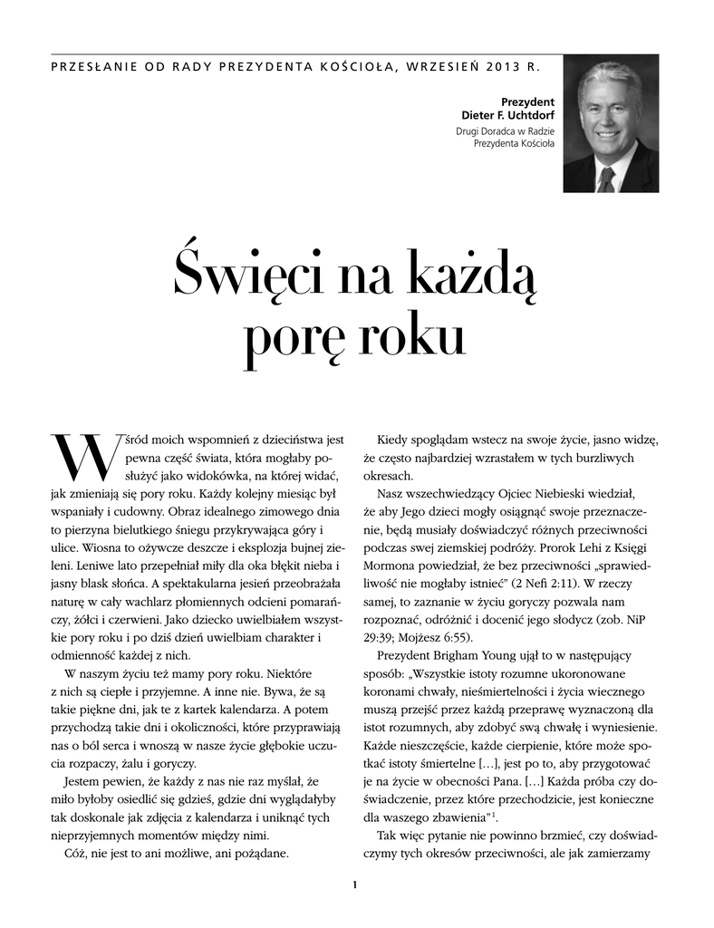 P R Z E S Ł A N I E O D R A D Y P R E Z Y D E N TA K O Ś C I O Ł A , W R Z E S I E Ń 2 0 1 3 R . Prezydent Dieter F. Uchtdorf Drugi Doradca w Radzie Prezydenta Kościoła Święci na każdą porę roku W śród moich wspomnień z dzieciństwa jest pewna część świata, która mogłaby po służyć jako widokówka, na której widać, jak zmieniają się pory roku. Każdy kolejny miesiąc był wspaniały i cudowny. Obraz idealnego zimowego dnia to pierzyna bielutkiego śniegu przykrywająca góry i ulice. Wiosna to ożywcze deszcze i eksplozja bujnej zie leni. Leniwe lato przepełniał miły dla oka błękit nieba i jasny blask słońca. A spektakularna jesień przeobrażała naturę w cały wachlarz płomiennych odcieni pomarań czy, żółci i czerwieni. Jako dziecko uwielbiałem wszyst kie pory roku i po dziś dzień uwielbiam charakter i odmienność każdej z nich. W naszym życiu też mamy pory roku. Niektóre z nich są ciepłe i przyjemne. A inne nie. Bywa, że są takie piękne dni, jak te z kartek kalendarza. A potem przychodzą takie dni i okoliczności, które przyprawiają nas o ból serca i wnoszą w nasze życie głębokie uczu cia rozpaczy, żalu i goryczy. Jestem pewien, że każdy z nas nie raz myślał, że miło byłoby osiedlić się gdzieś, gdzie dni wyglądałyby tak doskonale jak zdjęcia z kalendarza i uniknąć tych nieprzyjemnych momentów między nimi. Cóż, nie jest to ani możliwe, ani pożądane. Kiedy spoglądam wstecz na swoje życie, jasno widzę, że często najbardziej wzrastałem w tych burzliwych okresach. Nasz wszechwiedzący Ojciec Niebieski wiedział, że aby Jego dzieci mogły osiągnąć swoje przeznacze nie, będą musiały doświadczyć różnych przeciwności podczas swej ziemskiej podróży. Prorok Lehi z Księgi Mormona powiedział, że bez przeciwności „sprawied liwość nie mogłaby istnieć” (2 Nefi 2:11). W rzeczy samej, to zaznanie w życiu goryczy pozwala nam rozpoznać, odróżnić i docenić jego słodycz (zob. NiP 29:39; Mojżesz 6:55). Prezydent Brigham Young ujął to w następujący sposób: „Wszystkie istoty rozumne ukoronowane koronami chwały, nieśmiertelności i życia wiecznego muszą przejść przez każdą przeprawę wyznaczoną dla istot rozumnych, aby zdobyć swą chwałę i wyniesienie. Każde nieszczęście, każde cierpienie, które może spo tkać istoty śmiertelne […], jest po to, aby przygotować je na życie w obecności Pana. […] Każda próba czy do świadczenie, przez które przechodzicie, jest konieczne dla waszego zbawienia” 1. Tak więc pytanie nie powinno brzmieć, czy doświad czymy tych okresów przeciwności, ale jak zamierzamy 1 przetrwać te burze. Naszą wielką szansą pośród zmie niających się pór roku życia jest wierne trzymanie się słowa Boga, gdyż Jego rada ma nie tylko pomóc nam przetrwać życiowe burze, ale również pomóc ich uniknąć. Nasz Ojciec Niebieski przekazał nam poprzez proroków Swe słowo — cenną wiedzę przeznaczoną do tego, aby prowadzić nas przez wszystkie wyzwania i trudne okresy, jakie mamy w życiu, w kierunku niewy mownej radości i cudownego blasku życia wiecznego. Ważnym elementem naszych życiowych doświadczeń jest odkrycie w sobie siły, odwagi i prawości, by podą żać za prawdą i sprawiedliwością mimo wciąż pojawia jących się przeciwności. Ci, którzy weszli w wody chrztu i przyjęli dar Ducha Świętego, wyruszyli w drogę, którą podążają uczniowie Chrystusa, i otrzymali przykazanie, by wytrwale i wier nie kroczyć śladami Zbawiciela. Zbawiciel nauczał, że słońce wschodzi „nad złymi i dobrymi i deszcz pada na sprawiedliwych i niesprawied liwych” (Ew. Mateusza 5:45). Czasami trudno jest nam zrozumieć, dlaczego w życiu zdarzają się rzeczy trudne, a czasem wręcz niesprawiedliwe. Ale jako naśladowcy Chrystusa ufamy, że jeśli będziemy „[szukać] pilnie, [mod lić] się zawsze i [wierzyć] […], wszystko będzie działać razem dla [naszego] dobra, jeżeli żyć [będziemy] świąto bliwie” (NiP 90:24; kursywa dodana). Jako członkowie Jego Kościoła, jako święci, wszyscy służymy z radością i ochotą bez względu na pogodę i porę roku. Kiedy tak czynimy, nasze serca wypełnią się świętą wiarą, uzdrawiającą nadzieją i niebiańską miłością. Mimo to nadal będziemy musieli przejść przez te wszystkie pory roku — zarówno te przyjemne, jak i bolesne. Bez względu jednak na porę roku my — naśla dowcy Chrystusa — będziemy pokładać w Nim nadzieję i będziemy kroczyć w kierunku Jego światła. Mówiąc w skrócie, jesteśmy świętymi Boga, zde terminowanymi, by uczyć się od Niego i kochać Jego i naszych bliźnich. Jesteśmy pielgrzymami na świętej drodze, którą kroczą naśladowcy Chrystusa i będziemy wytrwale kroczyć w stronę niebiańskiego celu. Dlatego też bądźmy świętymi wiosną, latem, jesienią i zimą. Bądźmy świętymi o każdej porze roku. NAUCZANIE NA PODSTAWIE TEGO PRZESŁANIA Rada Prezydenta Kościoła naucza: „Niektóre z największych nauk wypływają ze śpiewania hymnów” (Hymny, IX) Kiedy będziecie nauczać tego przesłania, zastanówcie się nad odśpiewaniem z nauczanymi osobami hymnu lub pieśni mówiących o pokonywaniu przeciwności: „Jak mocna postawa” (str. 7); „The Lord Is My Shepherd” (nr 108); albo „Śmiało naprzód” (str. 16). Jeśli poczujecie, że to właściwe, opowiedzcie o tym, jak burzliwy okres w waszym życiu stał się błogosławieństwem. MŁODZIEŻ Udało mi się uwolnić od uczucia smutku Juan Zhu K iedy przyjaciele z mojego okręgu — brat Chen i jego żona — zostali ochrzczeni, byłem niezmier- nie szczęśliwy. Rok po chrzcie zostali zapieczętowani w świątyni i został do nich zapieczętowany ich syn, który zmarł, zanim przystąpili do Kościoła. Niesamowicie było patrzeć, jak Chenowie wzrastali w ewangelii. Rok później brat Chen zginął w wypadku samochodowym. Zarówno w 