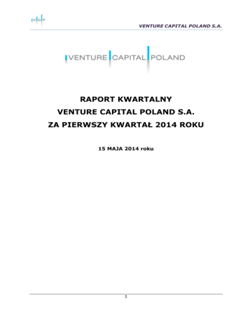 VENTURE CAPITAL POLAND S.A. RAPORT KWARTALNY VENTURE CAPITAL POLAND S.A. ZA PIERWSZY KWARTAŁ 2014 ROKU 15 MAJA 2014 roku 1 VENTURE CAPITAL POLAND S.A. RAPORT ZAWIERA: I. PODSTAWOWE INFOMACJE O SPÓŁCE 1. Dane jednostki 2. Zarząd 3. Rada Nadzorcza 4. Struktura akcjonariatu II. KWARTALNE SKRÓCONE SPRAWOZDANIE FINANSOWE ZA PIERWSZY KWARTAŁ 2014 ROKU III. INFORMACJE O ZASADACH PRZYJĘTYCH PRZY SPORZĄDZANIU RAPORTU, W TYM INFORMACJE O ZMIANACH STOSOWANYCH ZASAD (POLITYKI) RACHUNKOWOŚCI IV. ZWIĘZŁA CHARAKTERYSTYKA ISTOTNYCH DOKONAŃ LUB NIEPOWODZEŃ EMITENTA W PIERWSZYM KWARTALE 2014 R., WRAZ Z OPISEM NAJWAŻNIEJSZYCH CZYNNIKÓW I ZDARZEŃ, W SZCZEGÓLNOŚCI O NIETYPOWYM CHARAKTERZE, MAJĄCYCH WPŁYW NA OSIĄGNIĘTE WYNIKI V. STANOWISKO ZARZĄDU ODNOŚNIE MOŻLIWOŚCI ZREALIZOWANIA PUBLIKOWANYCH PROGNOZ WYNIKÓW FINANSOWYCH NA DANY ROK W ŚWIETLE WYNIKÓW ZAPREZENTOWANYCH W NINIEJSZYM RAPORCIE KWARTALNYM VI. OPIS STANU REALIZACJI DZIAŁAŃ I INWESTYCJI EMITENTA ORAZ HARMONOGRAMU ICH REALIZACJI VII. INICJATYWY NASTAWIONE NA WPROWADZENIE ROZWIĄZAŃ INNOWACYJNYCH W PRZEDSIĘBIORSTWIE VIII. OPIS ORGANIZACJI GRUPY KAPITAŁOWEJ EMITENTA, ZE WSKAZANIEM JEDNOSTEK PODLEGAJĄCYCH KONSOLIDACJI IX. INFORMACJE DOTYCZĄCE LICZBY OSÓB EMITENTA, W PRZELICZENIU NA PEŁNE ETATY 2 ZATRUDNIONYCH PRZEZ VENTURE CAPITAL POLAND S.A. I. Podstawowe informacje o Spółce 1. Dane jednostki Nazwa (firma): VENTURE CAPITAL POLAND S.A. Siedziba: Warszawa Adres: ul. Polna 40 lok. 209, 00-635 Warszawa Numer KRS: 0000353979 Sąd rejestrowy: Sąd Rejonowy dla miasta stołecznego Warszawy XII Wydział Gospodarczy KRS Powstanie spółki: VENTURE CAPITAL POLAND S.A. została zawiązana w dniu 14 stycznia 2010 roku w Warszawie, repertorium A nr 180/2010. Kapitał zakładowy: 244 914,80 zł i dzieli się na 2.449.148 akcji o wartości nominalnej 0,10 zł każda Numer telefonu: +48 22 370 24 63 Numer fax: +48 22 370 25 23 Adres poczty elektronicznej: [email protected] Strona internetowa: www.vcpoland.pl Źródło: Emitent Venture Capital Poland S.A. jest spółką inwestycyjną obecną na rynku od 2010 roku. Działalność inwestycyjna spółki Venture Capital Poland S.A. koncentruje się na budowaniu portfela spółek poprzez wspieranie ich finansowo, organizacyjnie i realizacyjnie na różnych płaszczyznach działalności. Emitent finansuje rozwój spółek portfelowych oraz oferuje merytoryczne wsparcie we wczesnych etapach, ze szczególnym uwzględnieniem przekazywania know-how w zakresie zarządzania i budowy wartości przedsiębiorstwa. Emitent inwestuje w wyselekcjonowane przez Komitet Inwestycyjny podmioty niepubliczne działające w różnych branżach, ze szczególnym uwzględnieniem następujących sektorów: 3 VENTURE CAPITAL POLAND S.A. • technologie telekomunikacyjne (w tym projekty internetowe oferujące unikalne eusługi), • nowoczesnej medycyny, • rozwiązania biotechnologiczne, • energetyki odnawialnej, • projektów związanych z ochroną środowiska, • atrakcyjne projekty/podmioty działające na rynku krócej niż 3 lata. Venture Capital Poland zgodnie z przyjętą strategią inwestycyjną opiera się na zasadach prowadzenia działań inwestycyjnych, podobnie do tych na jakich opiera się działanie funduszy typu private equity/venture capital. Dlatego też jednym z kluczowych kryteriów analizy jest ocena potencjału ludzkiego spółek portfelowych oraz ich celów inwestycyjnych. Model biznesowy perspektywach Emitenta rozwoju w polega na wspieraniu przedsiębiorstwach projektów o charakteryzujących interesujących się wysokim potencjałem ludzkim i kapitałowym, realizującym ambitne przedsięwzięcia w fazie ich budowy. Emitent czerpie korzyści bezpośrednio poprzez objęcie udziałów w projekcie w jego początkowej fazie rozwoju. Proces inwestycji kończy się pozyskaniem przez Emitenta inwestora lub też partnera branżowego, zainteresowanego uczestniczeniem w już stabilnym projekcie. Emitent specjalizuje się we wspieraniu projektów we wstępnej fazie rozwoju, przede wszystkim innowacyjnych podmiotów na etapie początkowego, ale i tym samym największego i najszybszego rozwoju. Inwestycje w takie projekty charakteryzują się wysoką oczekiwaną stopą zwrotu oraz relatywnie wysokim ryzykiem, które jednak jest w części ograniczane rygorystyczną strategią doświadczeniem jego zespołu. 4 inwestycyjną Emitenta i bogatym VENTURE CAPITAL POLAND S.A. 2. Zarząd Na dzień sporządzenia niniejszego dokumentu w skład Zarządu Venture Capital Poland S.A. wchodzą: - Mariusz Ambroziak – Prezes Zarządu - Andrzej Czapski – Członek Zarządu 3. Rada Nadzorcza Na dzień sporządzenia niniejszego dokumentu w skład Rady Nadzorczej Venture Capital Poland S.A. wchodzą: - Mirosław Chmielewski – Przewodniczący Rady Nadzorczej - Marek Nowakowski – Członek Rady Nadzorczej - Michał Leszczyński – Członek Rady Nadzorczej - Sławomir Mińkowski – Członek Rady Nadzorczej - Paweł Śliwa – Członek Rady Nadzorczej 4. Struktura akcjonariatu Zgodnie z informacjami posiadanymi przez Zarząd Venture Capital Poland S.A. na dzień publikacji raportu akcjonariuszami posiadającymi powyżej 10% w ogólnej liczbie głosów na Walnym Zgromadzeniu Spółki są: l.p. Imię i Nazwisko Liczba głosów na Walnym Zgromadzeniu 1. Barbara Nagawiecka 16,44% 2. Waldemar Sałata 16,43% 3. Bogdan Paszkowski 15,58% 4. Rafał Brzezowski 15,58% 5. Wlodzimierz Wasiak 15,58% 5 VENTURE CAPITAL POLAND S.A. II. Kwartalne skrócone sprawozdanie finansowe za pierwszy kwartał 2014 roku Poniżej przedstawione zostały dane finansowe z bilansu podsumowujące sytuację finansową Emitenta w pierwszym kwartale 2014 roku. AKTYWA Stan na Stan na 31.03.2014 31.03.2013 (tys. PLN) (tys. PLN) PASYWA Kapitał (fundusz) własny A. Aktywa trwałe 8,7 12,7 A. I. Wartości niematerialne i prawne 8,7 12,7 I. 1. Koszty zakończonych prac rozwojowych II. 2. Wartość firmy III. 3. Inne wartości niematerialne i prawne 4. Zal