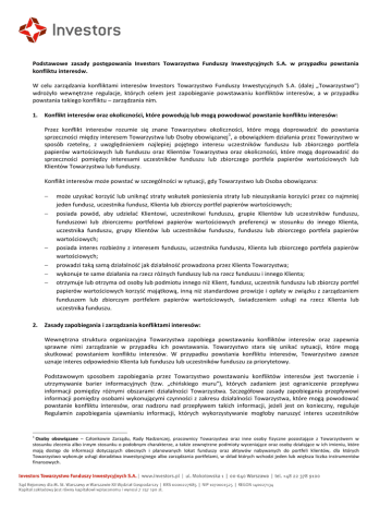 Podstawowe zasady postępowania Investors Towarzystwa Funduszy Inwestycyjnych S.A. w przypadku powstania konfliktu interesów. W celu zarządzania konfliktami interesów Investors Towarzystwo Funduszy Inwestycyjnych S.A. (dalej „Towarzystwo”) wdrożyło wewnętrzne regulacje, których celem jest zapobieganie powstawaniu konfliktów interesów, a w przypadku powstania takiego konfliktu – zarządzania nim. 1. Konflikt interesów oraz okoliczności, które powodują lub mogą powodować powstanie konfliktu interesów: Przez konflikt interesów rozumie się znane Towarzystwu okoliczności, które mogą doprowadzić do powstania 1 sprzeczności między interesem Towarzystwa lub Osoby obowiązanej , a obowiązkiem działania przez Towarzystwo w sposób rzetelny, z uwzględnieniem najlepiej pojętego interesu uczestników funduszu lub zbiorczego portfela papierów wartościowych lub funduszu oraz Klientów Towarzystwa oraz okoliczności, które mogą doprowadzić do sprzeczności pomiędzy interesami uczestników funduszu lub zbiorczego portfela papierów wartościowych lub Klientów Towarzystwa lub funduszy. Konflikt interesów może powstać w szczególności w sytuacji, gdy Towarzystwo lub Osoba obowiązana: 2. może uzyskać korzyść lub uniknąć straty wskutek poniesienia straty lub nieuzyskania korzyści przez co najmniej jeden fundusz, uczestnika fundusz, Klienta lub zbiorczy portfel papierów wartościowych; posiada powód, aby udzielać Klientowi, uczestnikowi funduszu, grupie Klientów lub uczestników funduszu, funduszowi lub zbiorczemu portfelowi papierów wartościowych preferencji w stosunku do innego Klienta, uczestnika funduszu, grupy Klientów lub uczestników funduszu, funduszu lub zbiorczego portfela papierów wartościowych; posiada interes rozbieżny z interesem funduszu, uczestnika funduszu, Klienta lub zbiorczego portfela papierów wartościowych; prowadzi taką samą działalność jak działalność prowadzona przez Klienta Towarzystwa; wykonuje te same działania na rzecz różnych funduszy lub na rzecz funduszu i innego Klienta; otrzymuje lub otrzyma od osoby lub podmiotu innego niż Klient, fundusz, uczestnik funduszu lub zbiorczy portfel papierów wartościowych korzyść majątkową, inną niż standardowe prowizje i opłaty w związku z zarządzaniem funduszem lub zbiorczym portfelem papierów wartościowych, świadczeniem usługi na rzecz Klienta lub uczestnika funduszu. Zasady zapobiegania i zarządzania konfliktami interesów: Wewnętrzna struktura organizacyjna Towarzystwa zapobiega powstawaniu konfliktów interesów oraz zapewnia sprawne nimi zarządzanie w przypadku ich powstawania. Towarzystwo stara się unikać sytuacji, które mogą skutkować powstaniem konfliktu interesów. W przypadku powstania konfliktu interesów, Towarzystwo zawsze uznaje interes odpowiednio Klienta lub funduszu lub uczestników funduszu za priorytetowy. Podstawowym sposobem zapobiegania przez Towarzystwo powstawaniu konfliktów interesów jest tworzenie i utrzymywanie barier informacyjnych (tzw. „chińskiego muru”), których zadaniem jest ograniczenie przepływu informacji pomiędzy różnymi obszarami działalności Towarzystwa. Szczegółowe zasady zapobiegania przepływowi informacji pomiędzy osobami wykonującymi czynności z zakresu działalności Towarzystwa, które mogą powodować powstanie konfliktu interesów, oraz nadzoru nad przepływem takich informacji, jeżeli jest on konieczny, reguluje Regulamin zapobiegania ujawnianiu informacji, których wykorzystywanie mogłoby naruszyć interes uczestników 1 Osoby obowiązane – Członkowie Zarządu, Rady Nadzorczej, pracownicy Towarzystwa oraz inne osoby fizyczne pozostające z Towarzystwem w stosunku zlecenia albo innym stosunku o podobnym charakterze, a także zewnętrzne podmioty wyceniające oraz osoby działające w ich imieniu, które mają dostęp do informacji dotyczących obecnych i planowanych lokat funduszy oraz aktywów nabywanych do portfeli klientów, dla których Towarzystwo wykonuje usługi doradztwa inwestycyjnego albo zarządzania portfelami, w skład których wchodzi jeden lub większa liczba instrumentów finansowych. funduszu inwestycyjnego, interes klienta lub interes nabywców papierów wartościowych będących przedmiotem oferty publicznej lub papierów wartościowych będących przedmiotem obrotu na rynku regulowanym. Ponadto, Osoby obowiązane powinny unikać wszelkich sytuacji, które mogłyby doprowadzić do powstania konfliktu interesów, jeżeli zidentyfikują ryzyko powstania konfliktu interesów, są zobowiązane poinformować o tym fakcie Inspektora Nadzoru. Osoby te są również zobowiązane do informowania Inspektora Nadzoru o każdym przypadku wystąpienia próby wywierania niekorzystnego wpływu na sposób wykonywania przez Osobę obowiązaną czynności z zakresu działalności Towarzystwa. Dla unikania konfliktu z osobistymi interesami Osób obowiązanych, w Towarzystwie wdrożone zostały odpowiednie reguły dotyczące zasad inwestowania na własny rachunek przez Osoby obowiązane. Ponadto, pracownicy Towarzystwa podlegają ustawowym zakazom odnoszącym się do manipulacji i wykorzystania informacji poufnych. W razie stwierdzenia, że prowadzona przez Towarzystwo działalność może wiązać się z istotnymi konfliktami interesów, Towarzystwo informuje o tym Klienta lub uczestnika Funduszu. Przekazanie informacji może zostać dokonane za pośrednictwem strony internetowej www.investors.pl zamiast albo obok przekazania informacji za pomocą trwałego nośnika informacji. Na żądanie uczestnika funduszu lub klienta mogą mu zostać przekazane przez Towarzystwo szczegółowe informacje o zasadach postępowania Towarzystwa w przypadku powstania konfliktu interesów. 3. Prowizje (zachęty): W związku ze świadczeniem usług w zakresie działalności pośrednictwa w przyjmowaniu i przekazywaniu zleceń dotyczących uczestnictwa w funduszach inwestycyjnych zarządzanych pr