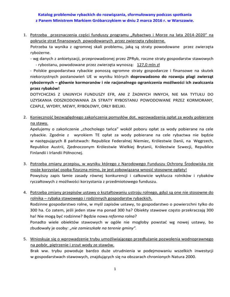 Katalog problemów rybackich do rozwiązania, sformułowany podczas spotkania z Panem Ministrem Markiem Gróbarczykiem w dniu 2 marca 2016 r. w Warszawie. 1. Potrzeba przeznaczenia części funduszy programu „Rybactwo i Morze na lata 2014-2020” na pokrycie strat finansowych powodowanych przez zwierzęta rybożerne. Potrzeba ta wynika z ogromnej skali problemu, jaką są straty powodowane przez zwierzęta rybożerne. - wg danych z ankietyzacji, przeprowadzonej przez ZPRyb, roczne straty gospodarstw stawowych - rybostanu, powodowane przez zwierzęta wynoszą: 127,0 mln zł - Polskie gospodarstwa rybackie ponoszą ogromne straty gospodarcze i finansowe na skutek niekorzystnych postanowień UE w wyniku których doprowadzono do rozwoju plagi zwierząt rybożernych – głównie kormoranów i nie racjonalnego ograniczenia możliwości ich zwalczania przez rybaków! DOTYCHCZAS Z UNIJNYCH FUNDUSZY EFR, ANI Z ŻADNYCH INNYCH, NIE MA TYTUŁU DO UZYSKANIA ODSZKODOWANIA ZA STRATY RYBOSTANU POWODOWANE PRZEZ KORMORANY, CZAPLE, WYDRY, MEWY, RYBOŁOWY, ORŁY BIELIKI. 2. Konieczność bezwzględnego zakończenia pomysłów dot. wprowadzenia opłat za wody pobierane na stawy. Apelujemy o zakończenie „chocholego tańca” wokół poboru opłat za wody pobierane na cele rybackie. Zgodnie z wyrokiem TE opłat za wody pobierane na cele rybactwa nie będzie w następujących 8 państwach: Republice Federalnej Niemiec, Królestwie Danii, na Węgrzech, Republice Austrii, Zjednoczonym Królestwie Wielkiej Brytanii, Królestwie Szwecji, Republice Finlandii i Irlandii Północnej. 3. Potrzeba zmiany przepisu, w wyniku którego z Narodowego Funduszu Ochrony Środowiska nie może korzystać osoba fizyczna mimo, że jest zobowiązana wnosić stosowne opłaty! Powyższy zapis łamie zasady równej konkurencji i całkowicie wyklucza rolników i rybaków ryczałtowych z możliwości korzystania z przedmiotowego funduszu. 4. Potrzeba zmiany przepisów ustawy o kształtowaniu ustroju rolnego, gdyż są one nie stosowne do rolnika – rybaka stawowego i rodzinnych gospodarstw rybackich. Rodzinne gospodarstwo rolne, w myśl zapisów ustawy, to gospodarstwo o powierzchni tylko do 300 ha. Co zatem, jeśli jeden staw ma ponad 300 ha? Obiekty stawowe często przekraczają 300 ha! Nie mogą być rodzinne? Będzie nowa reforma rolna? Ponadto wiele obiektów stawowych w ogóle nie mogłoby powstać wg nowej ustawy, bo zbudowały je osoby: „nie zamieszkałe na terenie gminy”. 5. Wnioskuje się o wprowadzenie trybu umożliwiającego przedłużanie pozwolenia wodnoprawnego na pobór, piętrzenie i zrzut wody ze stawów. Brak ww. trybu powoduje bardzo duże utrudnienia w podejmowaniu wszelkich inwestycji w gospodarstwach stawowych, znajdujących się na obszarach chronionych Natura 2000. 1 6. Mała opłacalność stawowej produkcji karpi, utrudniony ich zbyt przy narastającej konkurencji ryb z importu w sytuacji braku zapór celnych. 7. Nieefektywna ochrona fitosanitarna, zwłaszcza w przewozach ryb spoza Polski. Spowodowało to spustoszenia pogłowia karpi przez „zawleczoną” chorobę KHV karpi. 8. Konieczność przeprowadzenia pełnej prywatyzacji obiektów stawowych. Bardzo dużo - ok. 70 % gospodarstw stawowych ciągle jest wydzierżawianych od ANR. Zwiększa to koszty, wynikające z obowiązku płacenia wysokich czynszów dzierżawnych. Zniechęca dzierżawców do podejmowania inwestycji, w tym innowacyjnych na „nie swoim przedmiocie obiektów stawowych” a ANR nie partycypuje w finansowaniu inwestycji. Efektem tej sytuacji jest: „starzenie się obiektów stawowych”. 9. Brak możliwości dziedziczenia umów użytkowania obwodów rybackich przez osoby fizyczne rolników, prowadzące jednoosobową działalność gospodarczą oraz spółki cywilne. Powyższy problem dotyczy 64,52 % użytkowników rybackich, a więc większości użytkowników uprawnionych do rybactwa. Obecnie na podstawie „Ustawy o rybactwie śródlądowym” istnieje możliwość przedłużania umów użytkowania obwodów rybackich. Dotyczy to wszystkich użytkowników, czyli Stowarzyszeń (PZW), spółek z ograniczoną odpowiedzialnością, spółek cywilnych, osób fizycznych. Spółki z o.o. oraz stowarzyszenia jako podmioty prawne, mają niejako „ciągłość działania”. Ich umowy nie są zależne od zatrudnienia kierownictwa, więc umowy są dziedziczne. Dodatkowo np. spółki z o.o. można sprzedać, nie narażając się na rozwiązanie umowy użytkowania obwodu rybackiego, podpisaną z RZGW. Z osobami fizycznymi oraz spółkami cywilnymi sytuacja wygląda zupełnie inaczej. Gdy zabraknie (np. w wyniku zdarzenia losowego - śmierć) osoby fizycznej lub jednego z wspólników spółki cywilnej, następuje rozwiązanie umowy. Powyższe wiąże się z dużymi kłopotami osób związanych z prowadzeniem gospodarki rybackiej. Zachodzi zatem pilna potrzeba stworzenia regulacji prawnych umożliwiających: • cesję umowy użytkowania rybackiego obwodu rybackiego przez osobę fizyczną lub spółkę cywilną, • /lub/ możliwość zmiany formy prawnej – np. założenie spółki z o.o. i przepisanie na nią aktualnej umowy, • ewentualnie inne rozwiązanie prawne, które rozwiąże wyżej przedstawiony problem. 10. Wniosek o objęcie przez Pana Ministra patronatem: - Jubileuszu 100 Lecia Związku Producentów Ryb, - Święta Rybaka 2016, - I Centralnych Dożynek Rybackich, - Prezentacji Rybactwa w Sejmie RP. 2