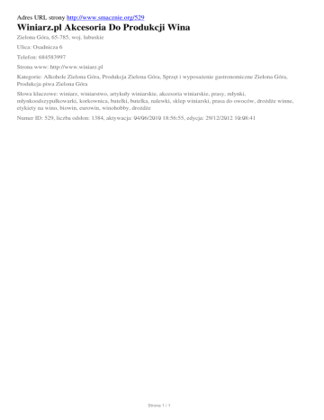 Adres URL strony http://www.smacznie.org/529 Winiarz.pl Akcesoria Do Produkcji Wina Zielona Góra, 65-785, woj. lubuskie Ulica: Osadnicza 6 Telefon: 684583997 Strona www: http://www.winiarz.pl Kategorie: Alkohole Zielona Góra, Produkcja Zielona Góra, Sprzęt i wyposażenie gastronomiczne Zielona Góra, Produkcja piwa Zielona Góra Słowa kluczowe: winiarz, winiarstwo, artykuły winiarskie, akcesoria winiarskie, prasy, młynki, młynkoodszypułkowarki, korkownica, butelki, butelka, nalewki, sklep winiarski, prasa do owoców, drożdże winne, etykiety na wino, biowin, eurowin, winohobby, drożdże Numer ID: 529, liczba odsłon: 1384, aktywacja: 04/06/2010 18:56:55, edycja: 29/12/2012 10:08:41 Strona 1 / 1