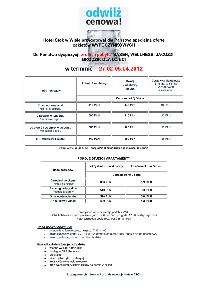 Hotel Stok w Wiśle przygotował dla Państwa specjalną ofertę pakietów WYPOCZYNKOWYCH Do Państwa dyspozycji w cenie pobytu BASEN, WELLNESS, JACUZZI, BRODZIK DLA DZIECI w terminie 27.02-05.04.2012 Pokój 2 osobowy Ilość noclegów Dostawka dla dziecka 6-16 lat w pokoju 2 osobowym z rodzicami Pokój 2 osobowy de Lux Cena za pokój / doba 2 noclegi weekend /piątek-niedziela/ 410 PLN 440 PLN 100 PLN 2 noclegi w tygodniu /niedziela-piątek/ 380 PLN 410 PLN 95 PLN od 3 do 5 noclegów w tygodniu /niedziela-piątek/ 360 PLN 400 PLN 95 PLN 6, 7 noclegów i więcej 340 PLN 390 PLN 85 PLN Dzieci w wieku: do 6 lat – bezpłatnie (bez oddzielnego miejsca do spania) POKOJE STUDIO I APARTAMENTY pokój studio max 4 osoby Apartament max 5 osób Ilość noclegów Cena za pokój / doba 2 noclegi weekend /piątek-niedziela/ 600 PLN 670 PLN 2 noclegi w tygodniu /niedziela-piątek/ 540 PLN 610 PLN 3 i więcej noclegów 520 PLN 580 PLN 7 noclegów i więcej 490 PLN 560 PLN Wszystkie ceny zawierają podatek VAT Doba hotelowa rozpoczyna się o godz. 14:00 a kończy o godz. 12:00 następnego dnia Hotel zastrzega sobie możliwość zmian cen. Cena pobytu obejmuje: śniadanie w formie bufetu w godz. 7.30-11.00 obiadokolację w godz. 7.30-11.00 /w formie bufetu od 20 os/ /napoje płatne dodatkowo / basen, wellness, jacuzzi, brodzik dla dzieci Ponadto Hotel oferuje odpłatnie: własne wyciągi narciarskie zabiegi w SPA Botanica kręgielnię bilard, piłkarzyki, cymbergaj możliwość wynajęcia rowerów możliwość wypożyczenia kijków do nordic Walking Szczegółowych informacji udziela recepcja Hotelu STOK Tel. 33 856 41 00, e-mail – [email protected] Serdecznie zapraszam