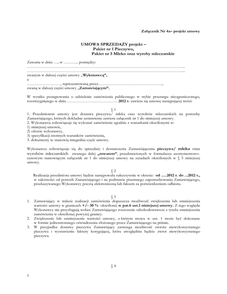 Załącznik Nr 4a– projekt umowy UMOWA SPRZEDAŻY projekt – Pakiet nr 1 Pieczywo, Pakiet nr 5 Mleko oraz wyroby mleczarskie Zawarta w dniu …, w ……….. pomiędzy: …………………………………………………………………………………………………... …………………………………………………………………………………………………... zwanym w dalszej części umowy „Wykonawcą”, a ……………………, reprezentowaną przez………………………………………., zwaną w dalszej części umowy „Zamawiającym”. W wyniku postępowania o udzielenie zamówienia publicznego w trybie przetargu nieograniczonego, rozstrzygniętego w dniu ……………………………… 2012 r. zawiera się umowę następującej treści: §1 1. Przedmiotem umowy jest dostawa pieczywa/ mleka oraz wyrobów mleczarskich na potrzeby Zamawiającego, których dokładne zestawienie zawiera załącznik nr 1 do niniejszej umowy. 2. Wykonawca zobowiązuje się wykonać zamówienie zgodnie z warunkami określonymi w: 1) niniejszej umowie, 2) ofercie wykonawcy, 3) specyfikacji istotnych warunków zamówienia, 3. dokumenty te stanowią integralna część umowy. Wykonawca zobowiązuje się do sprzedaży i dostarczenia Zamawiającemu pieczywa/ mleka oraz wyrobów mleczarskich zwanego dalej „towarem”, przedstawionych w formularzu asortymentowocenowym stanowiącym załącznik nr 1 do niniejszej umowy na zasadach określonych w § 5 niniejszej umowy. §2 Realizacja przedmiotu umowy będzie następowała sukcesywnie w okresie: od .....2012 r. do ...2012 r., w zależności od potrzeb Zamawiającego i na podstawie pisemnego zapotrzebowania Zamawiającego, przekazywanego Wykonawcy pocztą elektroniczną lub faksem za potwierdzeniem odbioru. §3 1. Zamawiający w trakcie realizacji zamówienia dopuszcza możliwość zwiększenia lub zmniejszenia wartości umowy w granicach +/- 30 % określonej w par.6 ust.1 niniejszej umowy. Z tego względu Wykonawcy nie przysługują wobec Zamawiającego roszczenie odszkodowawcze z tytułu zmniejszenia zamówienia w określonej powyżej granicy. 2. Zwiększenie lub zmniejszenie wartości umowy, o którym mowa w ust. 1 może być dokonane w formie jednostronnego oświadczenia złożonego przez Zamawiającego na piśmie. 3. W przypadku dostawy pieczywa Zamawiający zastrzega możliwość zwrotu niewykorzystanego pieczywa i wystawieniu faktury korygującej, która uwzględnia będzie zwrot niewykorzystanego pieczywa. §4 1 1. Wszystkie produkty dostarczane przez Wykonawcę winny spełniać prawem określone wymogi dla artykułów spożywczych oraz wymogi zdrowotne żywności. 2. Wykonawca zobowiązuje się dostarczać każdorazowo towar świeży, w dobrym gatunku oraz w opakowaniach dostosowanych do potrzeb zbiorowego żywienia. §5 1. Wykonawca zobowiązuje się dostarczać towar zgodnie ze złożonymi zapotrzebowaniami przez Zamawiającego i do miejsc ich wydania na adres: .............................................. 2. Dostawy towaru będą realizowane codziennie, od poniedziałku do soboty od godziny 6:00 najpóźniej do godziny 7:30 3. Każde zamówienie będzie składane w dniu poprzedzającym termin jego dostawy oraz oddzielne zamówienie na poniedziałek będzie składane w piątek. Jeżeli w trakcie trwania umowy wystąpią dni wolne od pracy, sposób zamawiania oraz realizacji dostaw będzie analogiczny do realizacji zamówień przy czym zamówienie zostanie złożone w ostatnim dniu roboczym poprzedzającym dzień wolny od pracy, i musi, co najmniej zawierać: zestawienie produktowo-ilościowe, termin i miejsce dostawy. 4. Koszty opakowania, transportu, załadunku, rozładunku do miejsca wskazanego przez Zamawiającego lub osobę przez niego wyznaczoną i ubezpieczenia ponosi Wykonawca. 1. 2. 3. 4. 5. 6. §6 Całkowita cena sprzedaży według załączonego zestawienia w formularzu ofertowym wynosi BRUTTO …………………………………………. zł (słownie: …………………………………………… zł), z zastrzeżeniem § 3 niniejszej umowy. Cena, o której mowa w ust. 1 obejmuje także koszty należytego opakowania i zabezpieczenia przedmiotu sprzedaży oraz odpowiedniego transportu do miejsca, o którym mowa w § 5 niniejszej umowy oraz wszelkie inne koszty związane z realizacja umowy. Wykonawca zobowiązuje się do nie zwiększania cen jednostkowych BRUTTO określonych, w ofercie przetargowej, przy czym w każdym czasie trwania umowy może dokonać obniżki cen jednostkowych, bez konieczności informowania Zamawiającego. Stałość cen nie dotyczy kolejnych ewentualnych zmian stawek podatku VAT, zmiany stawek celnych oraz zmiany cen urzędowych – w takich przypadkach zmiana ceny wymaga pisemnego aneksu do niniejszej umowy. Finansowanie odbywać się będzie na podstawie faktur częściowych wystawionych za zrealizowaną dostawę towaru. Nazwa i cena asortymentu na fakturze zgodna musi być z nazwą i ceną jednostkową brutto określoną w załączniku nr 1 niniejszej umowy. Podstawą wystawienia faktury będzie pisemne potwierdzenie przez Zamawiającego odbioru dostawy towaru bez zastrzeżeń. Zapłata za towar regulowana będzie przelewem na konto wskazane przez Wykonawcę w terminie do 21 dni od otrzymania prawidłowo wystawionej faktury VAT. Za datę zapłaty przyjmuje się dzień obciążenia rachunku Zamawiającego Wierzytelności związane z realizacją niniejszej umowy nie mogą być przedmiotem obrotu pomiędzy podmiotami trzecimi. §7 Każdy samochód, którym będzie dostarczana żywność musi posiadać decyzję Państwowego Inspektoratu Sanitarnego stwierdzającą spełnienie warunków do higienicznego przewozu określonych produktów. 2. Odbiór towaru będzie poprzedzony badaniem ilościowo-jakościowym i odbywać się będzie w miejscu wskazanym w § 5 niniejszej umowy. 2. W razie stwierdzenia wad ilościowych lub jakościowych w dostarczanym przez Wy