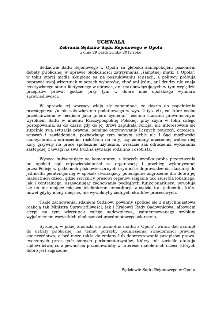 UCHWAŁA Zebrania Sędziów Sądu Rejonowego w Opolu z dnia 29 października 2012 roku Sędziowie Sądu Rejonowego w Opolu są głęboko zaniepokojeni poziomem debaty publicznej w sprawie okoliczności zatrzymania „samotnej matki z Opola”, w toku której media skupione są na poszukiwaniu sensacji, a politycy próbują poprawić swój wizerunek w oczach wyborców, choć ani jedni, ani drudzy nie znają rzeczywistego stanu faktycznego w sprawie, ani też obowiązujących w tym względzie przepisów prawa, godząc przy tym w dobre imię opolskiego wymiaru sprawiedliwości. W sprawie tej wszyscy zdają się zapominać, że doszło do popełnienia przestępstwa /a nie zobowiązania podatkowego w wys. 2 tys. zł/, za które osoba przedstawiana w mediach jako „ofiara systemu”, została skazana prawomocnym wyrokiem Sądu w imieniu Rzeczypospolitej Polskiej, przy czym w toku całego postępowania, aż do czasu gdy do jej drzwi zapukała Policja, nie interesowała się zupełnie swą sytuacją prawną, pomimo otrzymywania licznych pouczeń, orzeczeń, wezwań i zawiadomień, pozbawiając tym samym siebie ale i Sąd możliwości skorzystania z odroczenia, rozłożenia na raty, czy zamiany orzeczonej wobec niej kary grzywny na prace społecznie użyteczne, wreszcie zaś odroczenia wykonania zastępczej z uwagi na swą trudną sytuację rodzinną i osobistą. Wysoce bulwersujące są komentarze, z których wynika próba przerzucenia na opolski sąd odpowiedzialności za organizację i przebieg wykonywanej przez Policję w godzinach późnowieczornych czynności doprowadzenia skazanej do jednostki penitencjarnej w sposób stwarzający potencjalne zagrożenie dla dobra jej małoletnich dzieci, gdzie rzecznicy prasowi organów ścigania tak szczebla lokalnego, jak i centralnego, uzasadniając zachowania podległych funkcjonariuszy, powołują się na nie mające miejsca telefoniczne konsultacje z sędzią tut. jednostki, które nawet gdyby miały miejsce, nie wywołałyby żadnych skutków procesowych. Takie zachowania, zdaniem Sędziów, powinny spotkać się z natychmiastową reakcją tak Ministra Sprawiedliwości, jak i Krajowej Rady Sądownictwa, albowiem cierpi na tym wizerunek całego sądownictwa, zainteresowanego szybkim wyjaśnieniem wszystkich okoliczności przedmiotowego zdarzenia. Sytuacja, w jakiej znalazła się „samotna matka z Opola”, winna dać asumpt do debaty publicznej na temat potrzeby podniesienia świadomości prawnej społeczeństwa, a być może także do zmiany lub doprecyzowania przepisów prawa, tworzonych przez tych samych parlamentarzystów, którzy tak zaciekle atakują sądownictwo, co z pewnością pozostawałoby w interesie małoletnich dzieci, których dobro jest zagrożone. Sędziowie Sądu Rejonowego w Opolu