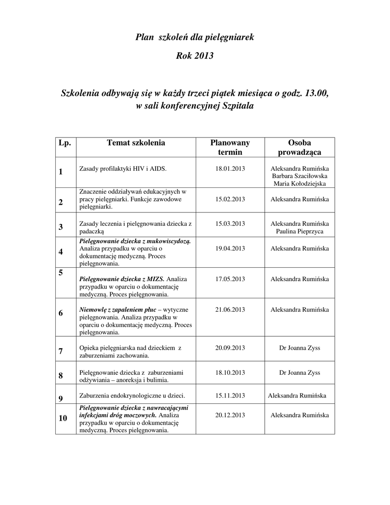 Plan szkoleń dla pielęgniarek Rok 2013 Szkolenia odbywają się w