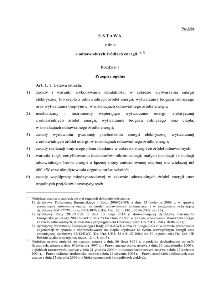 Projekt U S T AWA z dnia o odnawialnych źródłach energii 1), 2) Rozdział 1 Przepisy ogólne Art. 1. 1. Ustawa określa: 1) zasady i warunki wykonywania działalności w zakresie wytwarzania energii elektrycznej lub ciepła z odnawialnych źródeł energii, wytwarzania biogazu rolniczego oraz wytwarzania biopłynów, w instalacjach odnawialnego źródła energii; 2) mechanizmy i instrumenty z odnawialnych źródeł wspierające wytwarzanie energii elektrycznej energii, wytwarzanie biogazu rolniczego oraz ciepła, w instalacjach odnawialnego źródła energii; 3) zasady wydawania gwarancji pochodzenia energii elektrycznej wytwarzanej z odnawialnych źródeł energii w instalacjach odnawialnego źródła energii; 4) zasady realizacji krajowego planu działania w zakresie energii ze źródeł odnawialnych; 5) warunki i tryb certyfikowania instalatorów mikroinstalacji, małych instalacji i instalacji odnawialnego źródła energii o łącznej mocy zainstalowanej cieplnej nie większej niż 600 kW oraz akredytowania organizatorów szkoleń; 6) zasady współpracy międzynarodowej w zakresie odnawialnych źródeł energii oraz wspólnych projektów inwestycyjnych. 1) 2) Niniejsza ustawa w zakresie swojej regulacji dokonuje wdrożenia: 1) dyrektywy Parlamentu Europejskiego i Rady 2009/28/WE z dnia 23 kwietnia 2009 r. w sprawie promowania stosowania energii ze źródeł odnawialnych zmieniającej i w następstwie uchylającej dyrektywy 2001/77/WE oraz 2003/30/WE (Dz. Urz. UE L 140 z 05.06.2009, str. 16); 2) dyrektywy Rady 2013/18/UE z dnia 13 maja 2013 r. dostosowującej dyrektywę Parlamentu Europejskiego i Rady 2009/28/WE z dnia 23 kwietnia 2009 r. w sprawie promowania stosowania energii ze źródeł odnawialnych, w związku z przystąpieniem Chorwacji (Dz. Urz. UE L 158 z 10.06.2013); 3) dyrektywy Parlamentu Europejskiego i Rady 2004/8/WE z dnia 11 lutego 2004 r. w sprawie promowania kogeneracji w oparciu o zapotrzebowanie na ciepło użytkowe na rynku wewnętrznym energii oraz zmieniającej dyrektywę 92/42/EWG (Dz. Urz. UE L 52 z 21.02.2004, str. 50, z późn. zm.; Dz. Urz. UE Polskie wydanie specjalne, rozdz. 12, t. 3, str. 3). Niniejszą ustawą zmienia się ustawy: ustawę z dnia 26 lipca 1991 r. o podatku dochodowym od osób fizycznych, ustawę z dnia 10 kwietnia 1997 r. – Prawo energetyczne, ustawę z dnia 26 października 2000 r. o giełdach towarowych, ustawę z dnia 21 grudnia 2000 r. o dozorze technicznym, ustawę z dnia 27 kwietnia 2001 r. – Prawo ochrony środowiska, ustawę z dnia 29 stycznia 2004 r. – Prawo zamówień publicznych oraz ustawę z dnia 25 sierpnia 2006 r. o biokomponentach i biopaliwach ciekłych. –2– 2. Do poświadczenia spełnienia przez biopłyny kryteriów zrównoważonego rozwoju stosuje się przepisy ustawy z dnia 25 sierpnia 2006 r. o biokomponentach i biopaliwach ciekłych (Dz. U. z 2013 r. poz. 1164 oraz z 2014 r. poz. 457). 3. Przepisów ustawy nie stosuje się do biokomponentów, paliw ciekłych i biopaliw ciekłych zużywanych w transporcie, w rozumieniu ustawy wymienionej w ust. 2, z wyłączeniem przepisów rozdziału 6. 4. Do przyłączenia instalacji odnawialnego źródła energii do sieci stosuje się przepisy ustawy z dnia 10 kwietnia 1997 r. – Prawo energetyczne (Dz. U. z 2012 r. poz. 1059, z późn. zm.3)). Art. 2. Użyte w ustawie określenia oznaczają: 1) biogaz – gaz uzyskany z biomasy, w szczególności z instalacji przeróbki odpadów zwierzęcych lub roślinnych, oczyszczalni ścieków oraz składowisk odpadów; 2) biogaz rolniczy – gaz otrzymywany w procesie fermentacji metanowej surowców rolniczych, produktów ubocznych rolnictwa, płynnych lub stałych odchodów zwierzęcych, produktów ubocznych, odpadów lub pozostałości z przetwórstwa produktów pochodzenia rolniczego lub biomasy leśnej, z wyłączeniem biogazu pozyskanego z surowców pochodzących z oczyszczalni ścieków oraz składowisk odpadów; 3) biomasa – stałe lub ciekłe substancje pochodzenia roślinnego lub zwierzęcego, które ulegają biodegradacji, pochodzące z produktów, odpadów i pozostałości z produkcji rolnej i leśnej oraz przemysłu przetwarzającego ich produkty, oraz ziarna zbóż niespełniające wymagań jakościowych dla zbóż w zakupie interwencyjnym określonych w art. 7 rozporządzenia Komisji (WE) nr 1272/2009 z dnia 11 grudnia 2009 r. ustanawiającego wspólne szczegółowe zasady wykonania rozporządzenia Rady (WE) nr 1234/2007 w odniesieniu do zakupu i sprzedaży produktów rolnych w ramach interwencji publicznej (Dz. Urz. UE L 349 z 29.12.2009, str. 1, z późn. zm.) i ziarna zbóż, które nie podlegają zakupowi interwencyjnemu, a także ulegająca biodegradacji część odpadów przemysłowych i komunalnych, w tym odpadów z instalacji do przetwarzania odpadów oraz odpadów z uzdatniania wody i oczyszczania ścieków, w szczególności osadów ściekowych; 3) Zmiany tekstu jednolitego wymienionej ustawy zostały ogłoszone w Dz. U. z 2013 r. poz. 984 i 1238 oraz z 2014 r. poz. 457 i 490. –3– 4) biopłyny – ciekłe paliwa dla celów energetycznych innych niż w transporcie, w tym do wytwarzania energii elektrycznej lub ciepła, wytworzone z biomasy lub ziaren zbóż pełnowartościowych, wykorzystywane w instalacjach spełniających wymagania w zakresie standardów emisyjnych, o ile takie standardy zostały określone na podstawie przepisów o ochronie środowiska; 5) drewno pełnowartościowe – drewno spełniające wymagania jakościowe wymienione w normach określających wymagania i badania dla drewna wielkowymiarowego liściastego, drewna wielkowymiarowego iglastego oraz drewna średniowymiarowego dla grup oznaczonych jako S1, S2 i S3, oraz materiał drzewny powstały w wyniku procesu celowego rozdrobnienia tego drewna; 6) dystrybucja – dystrybucję w rozumieniu ustawy – Prawo energetyczne; 7) dedykowana instalacja spalania biomasy – instalację odnawialnego źródła energii, w której są spal