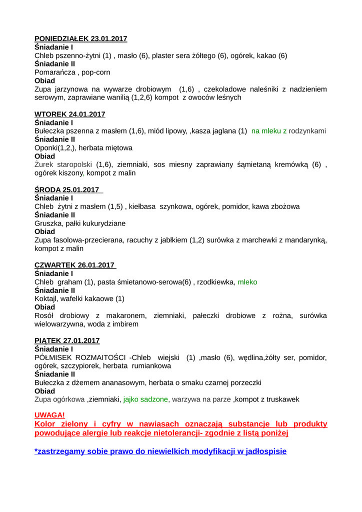 PONIEDZIAŁEK 23.01.2017 Śniadanie I Chleb pszenno-żytni (1) , masło (6), plaster sera żółtego (6), ogórek, kakao (6) Śniadanie II Pomarańcza , pop-corn Obiad Zupa jarzynowa na wywarze drobiowym (1,6) , czekoladowe naleśniki z nadzieniem serowym, zaprawiane wanilią (1,2,6) kompot z owoców leśnych WTOREK 24.01.2017 Śniadanie I Bułeczka pszenna z masłem (1,6), miód lipowy, ,kasza jaglana (1) na mleku z rodzynkami Śniadanie II Oponki(1,2,), herbata miętowa Obiad Żurek staropolski (1,6), ziemniaki, sos miesny zaprawiany śąmietaną kremówką (6) , ogórek kiszony, kompot z malin ŚRODA 25.01.2017 Śniadanie I Chleb żytni z masłem (1,5) , kiełbasa szynkowa, ogórek, pomidor, kawa zbożowa Śniadanie II Gruszka, pałki kukurydziane Obiad Zupa fasolowa-przecierana, racuchy z jabłkiem (1,2) surówka z marchewki z mandarynką, kompot z malin CZWARTEK 26.01.2017 Śniadanie I Chleb graham (1), pasta śmietanowo-serowa(6) , rzodkiewka, mleko Śniadanie II Koktajl, wafelki kakaowe (1) Obiad Rosół drobiowy z makaronem, ziemniaki, pałeczki drobiowe z rożna, surówka wielowarzywna, woda z imbirem PIĄTEK 27.01.2017 Śniadanie I PÓŁMISEK ROZMAITOŚCI -Chleb wiejski (1) ,masło (6), wędlina,żółty ser, pomidor, ogórek, szczypiorek, herbata rumiankowa Śniadanie II Bułeczka z dżemem ananasowym, herbata o smaku czarnej porzeczki Obiad Zupa ogórkowa ,ziemniaki, jajko sadzone, warzywa na parze ,kompot z truskawek UWAGA! Kolor zielony i cyfry w nawiasach oznaczają substancje lub produkty powodujące alergie lub reakcje nietolerancji- zgodnie z listą poniżej *zastrzegamy sobie prawo do niewielkich modyfikacji w jadłospisie