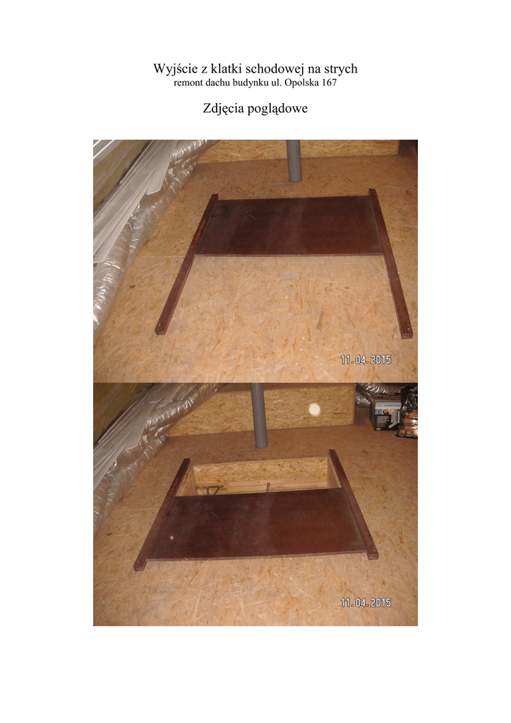 Wyjście z klatki schodowej na strych remont dachu budynku ul. Opolska 167 Zdjęcia poglądowe