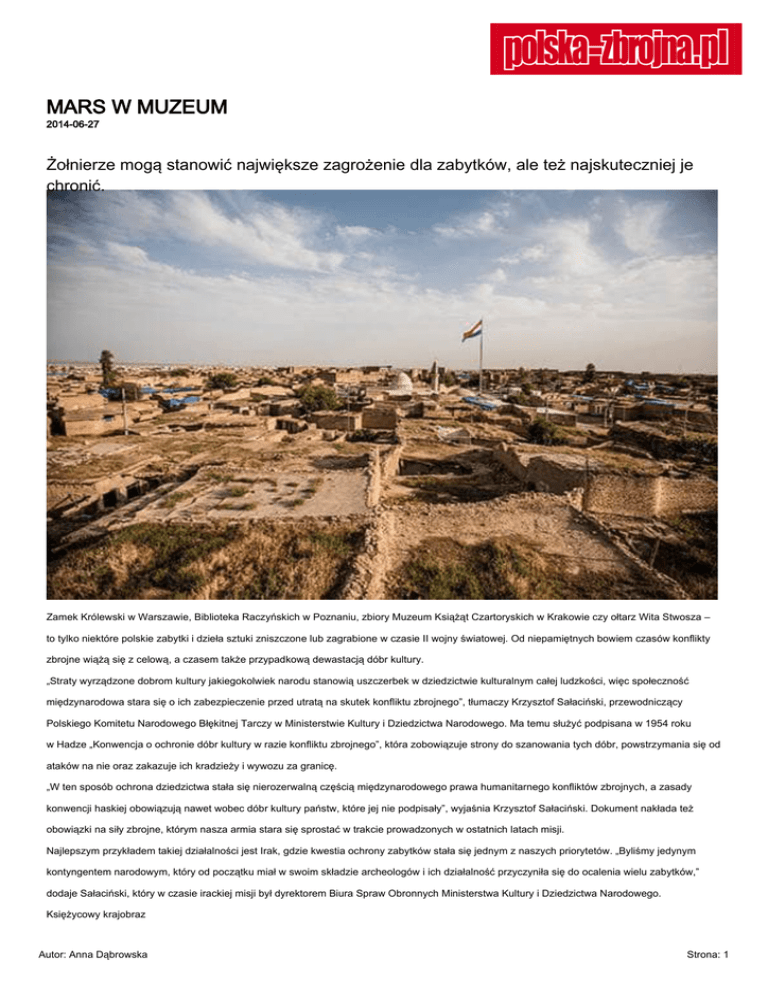 MARS W MUZEUM 2014-06-27 Żołnierze mogą stanowić największe zagrożenie dla zabytków, ale też najskuteczniej je chronić. Zamek Królewski w Warszawie, Biblioteka Raczyńskich w Poznaniu, zbiory Muzeum Książąt Czartoryskich w Krakowie czy ołtarz Wita Stwosza – to tylko niektóre polskie zabytki i dzieła sztuki zniszczone lub zagrabione w czasie II wojny światowej. Od niepamiętnych bowiem czasów konflikty zbrojne wiążą się z celową, a czasem także przypadkową dewastacją dóbr kultury. „Straty wyrządzone dobrom kultury jakiegokolwiek narodu stanowią uszczerbek w dziedzictwie kulturalnym całej ludzkości, więc społeczność międzynarodowa stara się o ich zabezpieczenie przed utratą na skutek konfliktu zbrojnego”, tłumaczy Krzysztof Sałaciński, przewodniczący Polskiego Komitetu Narodowego Błękitnej Tarczy w Ministerstwie Kultury i Dziedzictwa Narodowego. Ma temu służyć podpisana w 1954 roku w Hadze „Konwencja o ochronie dóbr kultury w razie konfliktu zbrojnego”, która zobowiązuje strony do szanowania tych dóbr, powstrzymania się od ataków na nie oraz zakazuje ich kradzieży i wywozu za granicę. „W ten sposób ochrona dziedzictwa stała się nierozerwalną częścią międzynarodowego prawa humanitarnego konfliktów zbrojnych, a zasady konwencji haskiej obowiązują nawet wobec dóbr kultury państw, które jej nie podpisały”, wyjaśnia Krzysztof Sałaciński. Dokument nakłada też obowiązki na siły zbrojne, którym nasza armia stara się sprostać w trakcie prowadzonych w ostatnich latach misji. Najlepszym przykładem takiej działalności jest Irak, gdzie kwestia ochrony zabytków stała się jednym z naszych priorytetów. „Byliśmy jedynym kontyngentem narodowym, który od początku miał w swoim składzie archeologów i ich działalność przyczyniła się do ocalenia wielu zabytków,” dodaje Sałaciński, który w czasie irackiej misji był dyrektorem Biura Spraw Obronnych Ministerstwa Kultury i Dziedzictwa Narodowego. Księżycowy krajobraz Autor: Anna Dąbrowska Strona: 1 Uważany za jedną z kolebek cywilizacji Irak obfituje w zabytkowe obiekty, których nie oszczędzały konflikty, przetaczające się przez ostatnie lata przez ten kraj. W trakcie wojny w 1991 roku alianci zbombardowali zabytki, w których sąsiedztwie Irakijczycy ulokowali swoje instalacje obronne. Bandy rabusiów złupiły kilkanaście dużych stanowisk archeologicznych, między innymi w Niniwie, Nimrudzie czy Chursabadzie. Splądrowali także parę regionalnych muzeów archeologicznych. Podczas drugiej wojny w rejonie Zatoki Perskiej, rozpoczętej 20 marca 2003 roku, bombardowania zniszczyły muzeum w Mosulu i Tikrit. Kiedy padł reżim Saddama Husajna, w pozbawionym kontroli państwie rozpoczęło się rabowanie muzeum narodowego Iraku. Siły amerykańskie koncentrowały się na ochronie obiektów ważnych z punktu widzenia militarnego i na muzea nie wystarczyło im już oddziałów. Zniknęły wówczas eksponaty ze złota, gliniane tabliczki z pismem klinowym, figurki z kości słoniowej. „Ponad 18 tys. eksponatów zostało zniszczonych lub uszkodzonych, 11 tys. zaginęło. Część z nich powróciła na miejsce dzięki współpracy UNESCO, Interpolu, służb celnych i granicznych wielu państw”, napisał w jednym ze swoich artykułów Marek Lemiesz, archeolog z Poznania, który w latach 2003–2004 był ekspertem do spraw ochrony dziedzictwa kulturowego przy polskim kontyngencie w Iraku. Rozrzucone po terenie kraju tysiące stanowisk archeologicznych stały się łatwym łupem dla rabusiów. Dobrze zorganizowane, uzbrojone i wyposażone bandy rozkopywały ruiny w poszukiwaniu skarbów. „Przelatując nad Irakiem, widziało się krajobraz przypominający miejscami księżycowe kratery”, opowiada Sałaciński. „To setki wykopów rabunkowych pokrywających ruiny sumeryjskich miast, których władze nie były w stanie upilnować”. Najgłośniej było jednak o wydarzeniach w Babilonie. Amerykańska armia po wkroczeniu do miasta założyła wśród tamtejszych starożytnych ruin Camp Alpha. Wojskowi zniwelowali fragment zabudowy pod lądowisko śmigłowców, wkopali w ziemię zbiorniki paliwa i wykonali rowy zabezpieczające bramy wjazdowe. Później baza stała się główną siedzibą polskiego kontyngentu. Raport babiloński Problem ochrony przez naszych żołnierzy zabytków w Iraku okazał się szerszy. Centralno-południowa strefa stabilizacyjna, za którą odpowiedzialność przejęło dowództwo Wielonarodowej Dywizji Centrum-Południe, współtworzonej przez polski kontyngent, obejmowała początkowo pięć prowincji: Karbalę, Nadżaf, Babil, Diwaniję i Wasit. Na tym terenie znajduje się około 1500 zarejestrowanych stanowisk archeologicznych, w tym wczesnośredniowieczna twierdza w Uchajdirze, średniowieczne miasto Wasicie i unikatowy zespół sakralny w Kifl. W Polsce ochroną zagrożonych zniszczeniem irackich dóbr kultury zajęło się Biuro Spraw Obronnych Ministerstwa Kultury i Dziedzictwa Narodowego. W lipcu 2003 roku powstała „Koncepcja udziału Rzeczypospolitej Polskiej w odbudowie i restrukturyzacji Iraku”. Od pierwszej zmiany polscy archeolodzy w ramach zespołu cywilnych specjalistów ds. ochrony dóbr kultury zostali włączeni w prace PKW. Przez pięć lat stacjonowania w Iraku w Grupie Współpracy Cywilno-Wojskowej (CIMIC) działało dziesięciu naszych naukowców. Ich pierwszym zadaniem było zapobieżenie dalszej dewastacji terenu Babilonu. Powstały zasieki, zamykające dostęp do większości obiektów zabytkowych, uruchomiono monitoring stanowisk, rowy obronne zastąpiono betonowymi ściankami. Ograniczono do minimum prace ziemne i budowlane na tym terenie, a każda z nich musiała być konsultowana z archeologami. „Dwukrotnie wstrzymaliśmy rozbudowę lądowiska dla śmigłowców. Nie zezwoliliśmy też na kopanie kanałów irygacyjnych”, pisał Marek Lemiesz. Pod koniec 2004 roku dowództwo kon