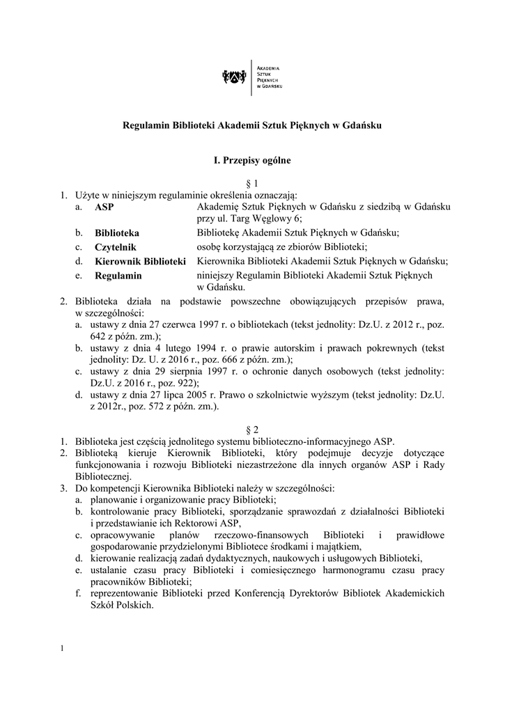 Regulamin Biblioteki Akademii Sztuk Pięknych w Gdańsku I. Przepisy ogólne §1 1. Użyte w niniejszym regulaminie określenia oznaczają: a. ASP Akademię Sztuk Pięknych w Gdańsku z siedzibą w Gdańsku przy ul. Targ Węglowy 6; b. Biblioteka Bibliotekę Akademii Sztuk Pięknych w Gdańsku; c. Czytelnik osobę korzystającą ze zbiorów Biblioteki; d. Kierownik Biblioteki Kierownika Biblioteki Akademii Sztuk Pięknych w Gdańsku; e. Regulamin niniejszy Regulamin Biblioteki Akademii Sztuk Pięknych w Gdańsku. 2. Biblioteka działa na podstawie powszechne obowiązujących przepisów prawa, w szczególności: a. ustawy z dnia 27 czerwca 1997 r. o bibliotekach (tekst jednolity: Dz.U. z 2012 r., poz. 642 z późn. zm.); b. ustawy z dnia 4 lutego 1994 r. o prawie autorskim i prawach pokrewnych (tekst jednolity: Dz. U. z 2016 r., poz. 666 z późn. zm.); c. ustawy z dnia 29 sierpnia 1997 r. o ochronie danych osobowych (tekst jednolity: Dz.U. z 2016 r., poz. 922); d. ustawy z dnia 27 lipca 2005 r. Prawo o szkolnictwie wyższym (tekst jednolity: Dz.U. z 2012r., poz. 572 z późn. zm.). §2 1. Biblioteka jest częścią jednolitego systemu biblioteczno-informacyjnego ASP. 2. Biblioteką kieruje Kierownik Biblioteki, który podejmuje decyzje dotyczące funkcjonowania i rozwoju Biblioteki niezastrzeżone dla innych organów ASP i Rady Bibliotecznej. 3. Do kompetencji Kierownika Biblioteki należy w szczególności: a. planowanie i organizowanie pracy Biblioteki; b. kontrolowanie pracy Biblioteki, sporządzanie sprawozdań z działalności Biblioteki i przedstawianie ich Rektorowi ASP, c. opracowywanie planów rzeczowo-finansowych Biblioteki i prawidłowe gospodarowanie przydzielonymi Bibliotece środkami i majątkiem, d. kierowanie realizacją zadań dydaktycznych, naukowych i usługowych Biblioteki, e. ustalanie czasu pracy Biblioteki i comiesięcznego harmonogramu czasu pracy pracowników Biblioteki; f. reprezentowanie Biblioteki przed Konferencją Dyrektorów Bibliotek Akademickich Szkół Polskich. 1 §3 1. Do zadań Biblioteki należy: a. gromadzenie, opracowywanie, przechowywanie i ochrona materiałów bibliotecznych; b. obsługa Czytelników, przede wszystkim udostępnianie zbiorów oraz prowadzenie działalności informacyjnej. 2. Biblioteka prowadzi działalność informacyjną oraz przeprowadza kwerendy tematyczne w kraju i zagranicą w następujących zakresach: a. informacji bibliograficznej; b. informacji bibliotecznej; c. informacji katalogowej; d. informacji dokumentacyjnej; e. informacji tekstowej; f. informacji rzeczowej; g. upowszechniania wydawnictw. §4 Biblioteka udostępnia swoje zbiory: 1. prezencyjnie – w czytelni; 2. na zewnątrz – w wypożyczalni oraz poprzez wypożyczenia międzybiblioteczne - na podstawie odrębnych porozumień, przy czym w przypadku zaliczenia zbiorów Biblioteki lub ich części do narodowego zasobu bibliotecznego zbiory te udostępniane są wyłącznie do celów naukowych i ekspozycyjnych innym bibliotekom lub innym podmiotom zapewniającym właściwe warunki ich zabezpieczenia; udostępnienie tych zbiorów wymaga każdorazowej zgody Kierownika Biblioteki. §5 Ze zbiorów Biblioteki mogą korzystać: 1. pracownicy ASP, studenci i doktoranci ASP, słuchacze studiów podyplomowych; 2. studenci uczestniczący w międzynarodowych programach wymiany i współpracy programu LLP/ERASMUS; 3. pracownicy naukowi związani umową cywilnoprawną z ASP; 4. osoby prawne, w szczególności biblioteki, instytucje kultury, muzea, uczelnie wyższe - poprzez wypożyczenia międzybiblioteczne; 5. inne osoby fizyczne mające pełną zdolność do czynności prawnych, z zastrzeżeniem, że mogą one korzystać ze zbiorów Biblioteki w ramach czytelni lub w indywidualnych przypadkach na podstawie decyzji Kierownika Biblioteki wypożyczyć materiały biblioteczne na zewnątrz po uiszczeniu kaucji. §6 1. Korzystanie ze zbiorów Biblioteki jest bezpłatne, z zastrzeżeniem ust. 2 niniejszego paragrafu. 2. Biblioteka może pobierać opłaty: a. w formie kaucji - za wypożyczone na zewnątrz materiały biblioteczne; b. za niezwrócenie w terminie wypożyczonych materiałów bibliotecznych; c. za uszkodzenie, zniszczenie lub niezwrócenie materiałów bibliotecznych. 3. Wysokość opłat, o których mowa w ust. 2 lit. a) i c), ustala Kierownik Biblioteki. 4. Wysokość opłat, o których mowa w ust. 2 lit. b), ustala Rektor ASP w formie zarządzenia. 5. Kaucję, o której mowa w ust. 2 lit. a), pobiera się w przypadku: 2 a. wypożyczenia materiałów bibliotecznych osobom, o którym mowa w § 5 pkt 5 Regulaminu; b. wypożyczenia - w drodze wyjątku na podstawie decyzji Kierownika Biblioteki materiałów bibliotecznych, o których mowa w § 21 Regulaminu, z zastrzeżeniem, że materiały biblioteczne, o których mowa w § 21 Regulaminu, mogą zostać wypożyczone wyłącznie pracownikom ASP lub pracownikom naukowym związanym umową cywilnoprawną z ASP; c. decyzji Kierownika Biblioteki podjętej w indywidualnych przypadkach, w szczególności gdy jest to uzasadnione ze względu na rodzaj, charakter lub wartość wypożyczanych materiałów bibliotecznych. §7 1. Czas pracy Biblioteki ustala Kierownik Biblioteki w porozumieniu z przełożonym. 2. Czas pracy Biblioteki podany jest do wiadomości na stronie internetowej ASP oraz na zewnątrz Biblioteki. 3. Biblioteka jest zamknięta dla Czytelników we wszystkie soboty, a także w niedziele i inne dni ustawowo wolne od pracy oraz w sierpniu (przerwa wakacyjna). 4. O zmianie czasu pracy Biblioteki albo o czasowym zawieszeniu lub ograniczeniu dostępu do Biblioteki zawiadamia Kierownik Biblioteki poprzez zamieszczenie informacji na stronie internetowej ASP oraz na zewnątrz Biblioteki. §8 Osoba zamierzająca skorzystać z Biblioteki zobowiązana jest zapoznać się z niniejszym Regulaminem i przestrzegać jego postanowień. Wzór deklaracji Czytelnika stanowi załącznik nr 1 do niniejszego Regulaminu. II. Zasady korzystani