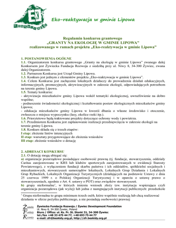 Eko-reaktywacja w gminie Lipowa Regulamin konkursu grantowego „GRANTY NA EKOLOGIĘ W GMINIE LIPOWA” realizowanego w ramach projektu „Eko-reaktywacja w gminie Lipowa” 1. POSTANOWIENIA OGÓLNE 1.1. Organizatorem konkursu grantowego „Granty na ekologię w gminie Lipowa” zwanego dalej Konkursem jest Żywiecka Fundacja Rozwoju z siedzibą przy ul. Niwy 8, 34-300 Żywiec, zwana dalej Organizatorem. 1.2. Partnerem Konkursu jest Urząd Gminy Lipowa. 1.3. Konkurs jest jednym z elementów projektu „Eko-reaktywacja w gminie Lipowa”. 1.4. Celem Konkursu jest zachęcenie lokalnych działaczy do prowadzenia działań edukacyjnych, informacyjnych, promocyjnych, aktywizacyjnych w zakresie ekologii, odpowiadających potrzebom na terenie gminy Lipowa. 1.5. Tematy konkursu: - aktywizacja mieszkańców gminy Lipowa wokół tematyki ekologicznej, uwrażliwienie na dobro wspólne; - podnoszenie świadomości ekologicznej i kształtowanie postaw ekologicznych mieszkańców gminy Lipowa; - edukacja mieszkańców gminy Lipowa w kwestii dbania o własne środowisko i otoczenie, zwłaszcza o miejsca wypoczynku (lasy, okolice rzeki itp.). 1.6. Priorytetowo będą traktowane projekty dotyczące ochrony wody i powietrza. 1.7. Przedmiotem Konkursu jest zaplanowanie realizacji przedsięwzięcia w zakresie ekologii na terenie gminy Lipowa. 1.8. Konkurs składa się z trzech etapów: I etap: złożenie listów intencyjnych II etap: warsztaty przygotowujące do złożenia wniosków III etap: złożenie wniosków o dotację 2. ADRESACI KONKURSU 2.1. O dotację mogą ubiegać się: a) organizacje pozarządowe posiadające osobowość prawną (tj. fundacje, stowarzyszenia, oddziały Caritas zarejestrowane w KRS lub klubów sportowych zarejestrowanych w ewidencji Starosty Powiatowego), z wyłączeniem fundacji skarbu państwa i ich oddziałów, spółdzielni socjalnych i mieszkaniowych, stowarzyszeń samorządów lokalnych, Lokalnych Grup Działania i Lokalnych Grup Rybackich, Lokalnych Organizacji Turystycznych (działających na podstawie Ustawy z dnia 25 czerwca 1999 r. o Polskiej Organizacji Turystycznej i w oparciu o ustawę prawo o stowarzyszeniach, zgodnie z Art. 4. ustawy o POT) oraz związków stowarzyszeń. b) grupy nieformalne1, w których imieniu wniosek złoży tzw. instytucja wspierająca czyli organizacja pozarządowa (jak wyżej) lub jedna z następujących instytucji publicznych: przedszkole 1 Grupa nieformalna to grupa minimum trzech osób, które wspólnie realizują lub chcą realizować działania w sferze pożytku publicznego, a nie posiadają osobowości prawnej Żywiecka Fundacja Rozwoju / Żywiec Development Foundation Ul. Niwy 8, 34-300 Żywiec, Poland Biuro / Office: ul. Ks. Pr. St. Słonki 31, 34-300 Żywiec tel./fax +48 33 475 44 77, +48 693 75 44 77 e-mail: [email protected], http://zfr.beskidy.org.pl Eko-reaktywacja w gminie Lipowa publiczne, szkoła publiczna, instytucja kultury, biblioteka publiczna, ośrodek pomocy społecznej, Lokalne Grupy Działania, Lokalne Grupy Rybackie i Lokalne Organizacje Turystyczne. Instytucje te muszą posiadać osobowość prawną lub dysponować stosownym pełnomocnictwem od organu, któremu podlegają, do reprezentowania go w zakresie umożliwiającym przeprowadzenie planowanych działań, podpisanie umowy oraz rozliczenie projektu. c) grupy nieformalne, występujące z wnioskiem samodzielnie, jako tzw. Inicjatywa Dla Gminy Lipowa. Grupa nieformalna, ma możliwość porozumienia się z działającą na jej terenie instytucją lub organizacją i za jej pośrednictwem złożenia wniosku do konkursu. W sytuacji, w której takie rozwiązanie nie jest możliwe, grupa nieformalna w ramach Inicjatywy Dla Gminy Lipowa może złożyć wniosek bezpośrednio do Żywieckiej Fundacji Rozwoju. W przypadku przyznania dofinansowania przez Komisję Grantową Konkursu, projekt jest realizowany przez wnioskującą grupę nieformalną (Realizatora), natomiast środki przyznane w ramach grantu są wydatkowane bezpośrednio przez Żywiecką Fundację Rozwoju. Przy realizacji Inicjatywy Dla Gminy Lipowa Żywiecka Fundacja Rozwoju nie przekazuje Realizatorowi projektu żadnych środków, lecz ponosi wszelkie koszty jej realizacji do wysokości przyznanego dofinansowania, zgodnie z budżetem projektu. Realizatorzy projektu podejmują działania zgodne z opisem projektu. Gwarancją zobowiązań realizatorów projektu i Żywieckiej Fundacji Rozwoju jest umowa cywilnoprawna zawierana pomiędzy obiema stronami, której częścią jest opis projektu oraz jego budżet. 2.2. Do konkursu można składać nieograniczoną liczbę wniosków (zarówno przez wnioskodawców2, jak i realizatorów3), jednak jeden realizator będzie mógł dostać dofinansowanie na realizację najwyżej jednego projektu. 2.3. W konkursie mogą wziąć udział te organizacje i instytucje lub grupy, które mają siedzibę w gminie Lipowa oraz planują prowadzić działania na terenie gminy Lipowa. 3. PULA ŚRODKÓW NA DOTACJE I WYSOKOŚĆ DOTACJI 3.1. Łączna pula środków przewidzianych na dotacje w ramach konkursu wynosi 15 000 zł. 3.2. Maksymalna kwota dotacji, o którą można ubiegać się w ramach konkursu, wynosi 3 tys. zł, minimalna nie jest określona. 3.3. Uczestnicy konkursu mogą się starać o dofinansowanie maksymalnie 90% całkowitego kosztu realizacji przedsięwzięcia. Muszą zapewnić finansowy lub niefinansowy wkład własny (rzeczowy, usługowy, wolontariat) wynoszący minimum 10% całkowitego kosztu przedsięwzięcia. 4. OKRES REALIZACJI PROJEKTÓW Dotacje zostaną przyznane na projekty trwające minimalnie 2, a maksymalnie 5 miesięcy w okresie od 1 czerwca do 31 października 2012. 2 organizacja lub instytucja posiadająca osobowość prawną, aplikująca w imieniu grupy nieformalnej lub w imieniu własnym 3 grupa nieformalna, która będzie realizować projekt Żywiecka Fundacja Rozwoju / Żywiec Development Foundation Ul. Niwy 8, 34-300 Żywiec, Poland Biuro / Office: ul. Ks. 