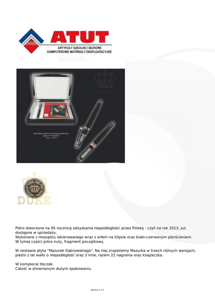 Pióro stworzone na 95 rocznicę odzyskania niepodległości przez Polskę - czyli na rok 2013, już dostępne w sprzedaży. Wykonane z mosiądzu lakierowanego wraz z orłem na klipsie oraz biało-czerwonym pierścieniem. W tylnej części pióra nuty, fragment początkowy. W zestawie płyta "Mazurek Dąbrowskiego". Na niej znajdziemy Mazurka w trzech różnych wersjach, pieśni z lat walki o niepodległość oraz 3 inne, razem 22 nagrania oraz książeczka. W komplecie tłoczek. Całość w drewnianym dużym opakowaniu. Strona 1 z 2 Strona 2 z 2