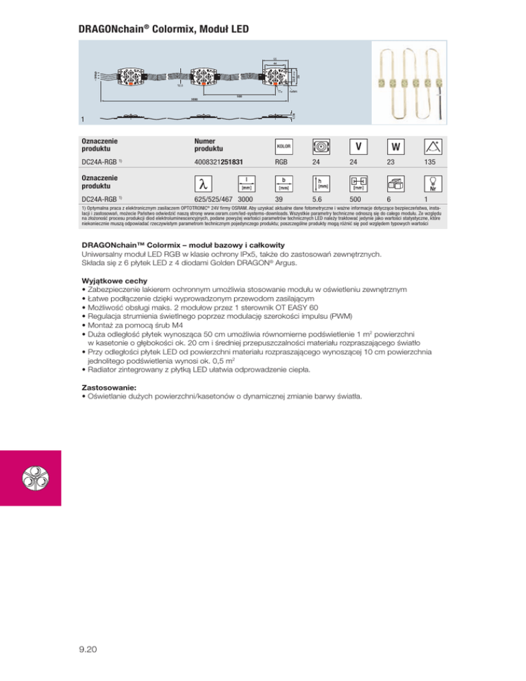 DRAGONchain® Colormix, Moduł LED 1 Oznaczenie produktu DC24A-RGB Numer produktu 1) KOLOR 4008321251831 RGB 24 24 23 135 625/525/467 3000 39 5.6 500 6 1 Oznaczenie produktu DC24A-RGB 1) 1) Optymalna praca z elektronicznym zasilaczem OPTOTRONIC® 24V firmy OSRAM. Aby uzyskać aktualne dane fotometryczne i ważne informacje dotyczące bezpieczeństwa, instalacji i zastosowań, możecie Państwo odwiedzić naszą stronę www.osram.com/led-systems-downloads. Wszystkie parametry techniczne odnoszą się do całego modułu. Ze względu na złożoność procesu produkcji diod elektroluminescencyjnych, podane powyżej wartości parametrów technicznych LED należy traktować jedynie jako wartości statystyczne, które niekoniecznie muszą odpowiadać rzeczywistym parametrom technicznym pojedynczego produktu; poszczególne produkty mogą różnić się pod względem typowych wartości DRAGONchain™ Colormix – moduł bazowy i całkowity Uniwersalny moduł LED RGB w klasie ochrony IPx5, także do zastosowań zewnętrznych. Składa się z 6 płytek LED z 4 diodami Golden DRAGON® Argus. Wyjątkowe cechy • Zabezpieczenie lakierem ochronnym umożliwia stosowanie modułu w oświetleniu zewnętrznym • Łatwe podłączenie dzięki wyprowadzonym przewodom zasilającym • Możliwość obsługi maks. 2 modułow przez 1 sterownik OT EASY 60 • Regulacja strumienia świetlnego poprzez modulację szerokości impulsu (PWM) • Montaż za pomocą śrub M4 • Duża odległość płytek wynosząca 50 cm umożliwia równomierne podświetlenie 1 m2 powierzchni w kasetonie o głębokości ok. 20 cm i średniej przepuszczalności materiału rozpraszającego światło • Przy odległości płytek LED od powierzchni materiału rozpraszającego wynoszącej 10 cm powierzchnia jednolitego podświetlenia wynosi ok. 0,5 m2 • Radiator zintegrowany z płytką LED ułatwia odprowadzenie ciepła. Zastosowanie: •Oświetlanie dużych powierzchni/kasetonów o dynamicznej zmianie barwy światła. 9.20 DRAGONchain® Colormix, System 1 Oznaczenie produktu DC24A-RGB-H Numer produktu 1) KOLOR 4008321254658 RGB 24 24 23 135 625/525/467 3000 64 24 500 6 1 Oznaczenie produktu DC24A-RGB-H 1) 1) Optymalna praca z elektronicznym zasilaczem OPTOTRONIC® 24V firmy OSRAM. Aby uzyskać aktualne dane fotometryczne i ważne informacje dotyczące bezpieczeństwa, instalacji i zastosowań, możecie Państwo odwiedzić naszą stronę www.osram.com/led-systems-downloads. Wszystkie parametry techniczne odnoszą się do całego modułu. Ze względu na złożoność procesu produkcji diod elektroluminescencyjnych, podane powyżej wartości parametrów technicznych LED należy traktować jedynie jako wartości statystyczne, które niekoniecznie muszą odpowiadać rzeczywistym parametrom technicznym pojedynczego produktu; poszczególne produkty mogą różnić się pod względem typowych wartości DRAGONchain™ Colormix – moduł bazowy i całkowity Uniwersalny moduł LED RGB w klasie ochrony IPx5, także do zastosowań zewnętrznych. Składa się z 6 płytek LED z 4 diodami Golden DRAGON® Argus. Wyjątkowe cechy • Zabezpieczenie lakierem ochronnym umożliwia stosowanie modułu w oświetleniu zewnętrznym • Łatwe podłączenie dzięki wyprowadzonym przewodom zasilającym • Możliwość obsługi maks. 2 modułów przez 1 sterownik OT EASY 60 • Regulacja strumienia świetlnego poprzez modulację szerokości impulsu (PWM) • Montaż za pomocą śrub M4 • Duża odległość płytek wynosząca 50 cm umożliwia równomierne podświetlenie 1 m2 powierzchni w kasetonie o głębokości ok. 20 cm i średniej przepuszczalności materiału rozpraszającego światło • Przy odległości płytek LED od powierzchni materiału rozpraszającego wynoszącej 10 cm powierzchnia jednolitego podświetlenia wynosi ok. 0,5 m2 • Radiator zintegrowany z płytką LED ułatwia odprowadzenie ciepła. Zastosowanie: • Oświetlanie dużych powierzchni/kasetonów o dynamicznej zmianie barwy światła 9.21