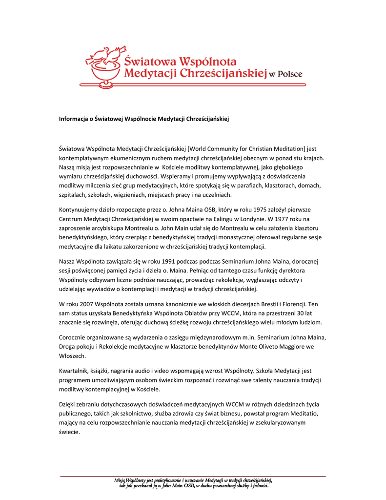 Informacja o Światowej Wspólnocie Medytacji Chrześcijańskiej Światowa Wspólnota Medytacji Chrześcijańskiej [World Community for Christian Meditation] jest kontemplatywnym ekumenicznym ruchem medytacji chrześcijańskiej obecnym w ponad stu krajach. Naszą misją jest rozpowszechnianie w Kościele modlitwy kontemplatywnej, jako głębokiego wymiaru chrześcijańskiej duchowości. Wspieramy i promujemy wypływającą z doświadczenia modlitwy milczenia sieć grup medytacyjnych, które spotykają się w parafiach, klasztorach, domach, szpitalach, szkołach, więzieniach, miejscach pracy i na uczelniach. Kontynuujemy dzieło rozpoczęte przez o. Johna Maina OSB, który w roku 1975 założył pierwsze Centrum Medytacji Chrześcijańskiej w swoim opactwie na Ealingu w Londynie. W 1977 roku na zaproszenie arcybiskupa Montrealu o. John Main udał się do Montrealu w celu założenia klasztoru benedyktyńskiego, który czerpiąc z benedyktyńskiej tradycji monastycznej oferował regularne sesje medytacyjne dla laikatu zakorzenione w chrześcijańskiej tradycji kontemplacji. Nasza Wspólnota zawiązała się w roku 1991 podczas podczas Seminarium Johna Maina, dorocznej sesji poświęconej pamięci życia i dzieła o. Maina. Pełniąc od tamtego czasu funkcję dyrektora Wspólnoty odbywam liczne podróże nauczając, prowadząc rekolekcje, wygłaszając odczyty i udzielając wywiadów o kontemplacji i medytacji w tradycji chrześcijańskiej. W roku 2007 Wspólnota została uznana kanonicznie we włoskich diecezjach Brestii i Florencji. Ten sam status uzyskała Benedyktyńska Wspólnota Oblatów przy WCCM, która na przestrzeni 30 lat znacznie się rozwinęła, oferując duchową ścieżkę rozwoju chrześcijańskiego wielu młodym ludziom. Corocznie organizowane są wydarzenia o zasięgu międzynarodowym m.in. Seminarium Johna Maina, Droga pokoju i Rekolekcje medytacyjne w klasztorze benedyktynów Monte Oliveto Maggiore we Włoszech. Kwartalnik, książki, nagrania audio i video wspomagają wzrost Wspólnoty. Szkoła Medytacji jest programem umożliwiającym osobom świeckim rozpoznać i rozwinąć swe talenty nauczania tradycji modlitwy kontemplacyjnej w Kościele. Dzięki zebraniu dotychczasowych doświadczeń medytacyjnych WCCM w różnych dziedzinach życia publicznego, takich jak szkolnictwo, służba zdrowia czy świat biznesu, powstał program Meditatio, mający na celu rozpowszechnianie nauczania medytacji chrześcijańskiej w zsekularyzowanym świecie. Najnowszym bardzo ważnym etapem w rozwoju WCCM jest rozpoczęcie nauczania Medytacji Chrześcijańskiej w szkołach katolickich. Pod patronatem biskupa Michaela Putney´a powstał w tym zakresie pionierski projekt w diecezji Townsville w Australii. W ślad za doświadczeniami ze szkół australijskich odbyły się w 2010 r. w Wielkiej Brytanii i Irlandii seminaria i warsztaty medytacji dla nauczycieli. Inicjatywa ta zaowocowała podjęciem przez wiele szkół w Wielkiej Brytanii programów pilotażowych medytacji z dziećmi i młodzieżą. Podobne seminaria miały miejsce na Filipinach, w Indonezji i Singapurze. W Polsce takie forum odbyło się 31.01.2013 roku w Warszawie. Na uniwersytecie Georgetown w Waszyngtonie WCCM prowadzi Centrum Medytacji i Dialogu Międzyreligijnego im. Johna Maina OSB. Na zaproszenie biskupów i przeorów różnych zgromadzeń zakonnych Światowa Wspólnota Medytacji Chrześcijańskiej aktywnie współpracuje w nauczaniu Medytacji Chrześcijańskiej w wielu diecezjach, w zgromadzeniach i instytucjach na całym świecie. Uznanie, jakim WCCM cieszy się wśród znaczących przedstawicieli Kościoła Katolickiego, oddaje lista patronów Wspólnoty. Są wśród nich kardynałowie George Pell (Sydney), John Tong Hon (Hong Kong), Walter Kasper (Niemcy) i Sean Brady (Irlandia), arcybiskup Vincent Nichols (Londyn) oraz biskup Michael Putney (Australia). Międzynarodową stroną internetową WCCM jest www.wccm.org. W Polsce wspieramy tworzenie się grup Medytacji Chrześcijańskiej, spotykamy się podczas corocznych rekolekcji Meditatio, Szkoły Medytacji i sesji w dialogu międzykulturowym. Prowadzimy stronę internetową www.wccm.pl. Jesteśmy przekonani, że rozpowszechnianie kontemplatywnej strony modlitwy, pogłębia życie modlitewne Kościoła poprzez integrację jego dwóch ewangelicznych aspektów działalności i kontemplacji – Marty i Marii. Pracą naszą kieruje zasada głębokiego szacunku i współpracy z duchowieństwem i wspólnotą świeckich Kościoła dla szerzenia przesłania Dobrej Nowiny. Nasz wkład jest ze swej natury kontemplatywny, czyli patrzymy na nasze zaangażowanie w kategoriach łagodnego, stopniowego i wspólnotowego dzieła. Laurence Freeman OSB Dyrektor The World Community for Christian Meditation zakonnik Oliwetańskiej Kongregacji Benedyktyńskiej