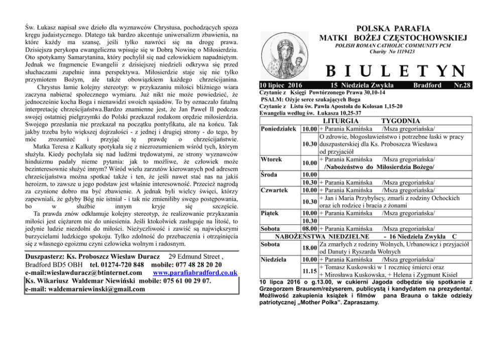 Św. Łukasz napisał swe dzieło dla wyznawców Chrystusa, pochodzących spoza kręgu judaistycznego. Dlatego tak bardzo akcentuje uniwersalizm zbawienia, na które każdy ma szansę, jeśli tylko nawróci się na drogę prawa. Dzisiejsza perykopa ewangeliczna wpisuje się w Dobrą Nowinę o Miłosierdziu. Oto spotykamy Samarytanina, który pochylił się nad człowiekiem napadniętym. Jednak we fragmencie Ewangelii z dzisiejszej niedzieli odkrywa się przed słuchaczami zupełnie inna perspektywa. Miłosierdzie staje się nie tylko przymiotem Bożym, ale także obowiązkiem każdego chrześcijanina. Chrystus łamie kolejny stereotyp: w przykazaniu miłości bliźniego wiara zaczyna nabierać społecznego wymiaru. Już nikt nie może powiedzieć, że jednocześnie kocha Boga i nienawidzi swoich sąsiadów. To by oznaczało fatalną interpretację chrześcijaństwa.Bardzo znamienne jest, że Jan Paweł II podczas swojej ostatniej pielgrzymki do Polski przekazał rodakom orędzie miłosierdzia. Swojego przesłania nie przekazał na początku pontyfikatu, ale na końcu. Tak jakby trzeba było większej dojrzałości - z jednej i drugiej strony - do tego, by móc zrozumieć i przyjąć tę prawdę o chrześcijaństwie. Matka Teresa z Kalkuty spotykała się z niezrozumieniem wśród tych, którym służyła. Kiedy pochylała się nad ludźmi trędowatymi, ze strony wyznawców hinduizmu padały nieme pytania: jak to możliwe, że człowiek może bezinteresownie służyć innym? Wśród wielu zarzutów kierowanych pod adresem chrześcijaństwa można spotkać także i ten, że jeśli nawet stać nas na jakiś heroizm, to zawsze u jego podstaw jest właśnie interesowność. Przecież nagrodą za czynione dobro ma być zbawienie. A jednak byli wielcy święci, którzy zapewniali, że gdyby Bóg nie istniał - i tak nie zmieniliby swego postępowania, bo w służbie innym kryje się szczęście. Ta prawda znów odkłamuje kolejny stereotyp, że realizowanie przykazania miłości jest ciężarem nie do uniesienia. Jeśli ktokolwiek zasługuje na litość, to jedynie ludzie niezdolni do miłości. Nieżyczliwość i zawiść są największymi burzycielami ludzkiego spokoju. Tylko zdolność do przebaczenia i otrząśnięcia się z własnego egoizmu czyni człowieka wolnym i radosnym. Duszpasterz: Ks. Proboszcz Wiesław Duracz 29 Edmund Street , Bradford BD5 OBH tel. 01274-720 848 mobile: 077 48 28 20 20 e-mail:[email protected] www.parafiabradford.co.uk Ks. Wikariusz Waldemar Niewiński mobile: 075 61 00 29 07. e-mail: [email protected] POLSKA PARAFIA MATKI BOŻEJ CZĘSTOCHOWSKIEJ POLISH ROMAN CATHOLIC COMMUNITY PCM Charity No 1119423 B I U L E T YN 10 lipiec 2016 15 Niedziela Zwykła Bradford Nr.28 Czytanie z Księgi Powtórzonego Prawa 30,10-14 PSALM: Ożyje serce szukających Boga Czytanie z Listu św. Pawła Apostoła do Kolosan 1,15-20 Ewangelia według św. Łukasza 10,25-37 LITURGIA TYGODNIA Poniedziałek 10.00 + Parania Kamińska /Msza gregoriańska/ O zdrowie, błogosławieństwo i potrzebne łaski w pracy 10.30 duszpasterskiej dla Ks. Proboszcza Wiesława od przyjaciół Wtorek + Parania Kamińska /Msza gregoriańska/ 10.00 /Nabożeństwo do Miłosierdzia Bożego/ Środa 10.00 10.30 + Parania Kamińska /Msza gregoriańska/ Czwartek 10.00 + Parania Kamińska /Msza gregoriańska/ + Jan i Maria Przybylscy, zmarli z rodziny Ochockich 10.30 oraz ich rodzice i bracia z żonami Piątek 10.00 + Parania Kamińska /Msza gregoriańska/ 10.30 Sobota 08.00 + Parania Kamińska /Msza gregoriańska/ NABOŻEŃSTWA NIEDZIELNE - 16 Niedziela Zwykła C Sobota Za zmarłych z rodziny Wolnych, Urbanowicz i przyjaciół 18.00 od Danuty i Ryszarda Wolnych Niedziela 10.00 + Parania Kamińska /Msza gregoriańska/ + Tomasz Kuskowski w 1 rocznicę śmierci oraz 11.15 + Mirosława Kuskowska, + Helena i Zygmunt Kisiel 10 lipca 2016 o g.13.00, w cukierni Jagoda odbędzie się spotkanie z Grzegorzem Braunem/reżyserem, publicystą i kandydatem na prezydenta/. Możliwość zakupienia książek i filmów pana Brauna o także odzieży patriotycznej „Mother Polka”. Zapraszamy. Lektorzy – Sobota 16.07.2016 g.18.00 – R. Dziama Niedziela 17.07.2016 g. 10.00 - K. Musztafa g.11.15 - Pierścińscy Dyżur przedstawiciela PRD Sali św. Brata Alberta, sobota i niedziela 16-17.07.2016 – M.E. Kączkowscy OFIARY Na potrzeby parafii – £ Na kwiaty – £ Taca dla parafii – 03.07.2016 - £ Gift Aid 05.06.2016 - £ 79.50 Jeżeli ktoś z Parafian pragnie złożyć ofiarę czekiem/na dowolny cel parafialny/, prosimy go wypisać na –P.C.M. BRADFORD. Zwracamy się w imieniu Parafialnej Rady Duszpasterskiej do wszystkich Parafian z serdeczną prośbą o złożenie raz w roku minimalnej sumy £ 30 na potrzeby naszej parafii. Wszystkim ofiarodawcom składamy serdeczne podziękowanie za złożone ofiary na nasze cele parafialne. Bóg zapłać. *** OGŁOSZENIA DUSZPASTERSKIE *** 1. Jezus przypomina dziś w Ewangelii o największym przykazaniu − przykazaniu miłości oraz w prosty sposób wyjaśnia, jak należy je wypełniać. W każdym człowieku należy dostrzegać brata, który może potrzebować naszej pomocy. Już za 10 dni będziemy mieli okazję zaoferować chrześcijańską gościnność i życzliwość wobec młodych, którzy przybędą do naszego kraju na wspólne spotkanie i modlitwę. 2. W poniedziałek przypada święto Świętego Benedykta, opata i patrona Europy. Zapraszamy do wspólnej modlitwy za kontynent europejski, by Europejczycy nie odwracali się od swoich chrześcijańskich korzeni i chcieli budować swoją przyszłość na wartościach płynących z Ewangelii. 3. W sobotę, 16 lipca przypada wspomnienie NMP z Góry Karmel. Góra Karmel znana jest nam ze Starego Testamentu. Jest miejscem obrony wiary w jedynego Boga przez proroka Eliasza.W średniowieczu powstał na niej zakon karmelitański. Z tym dniem i z rodziną karmelitańską zakonną wiąże się również tradycja noszenia szkaplerza. Matka Boża 
