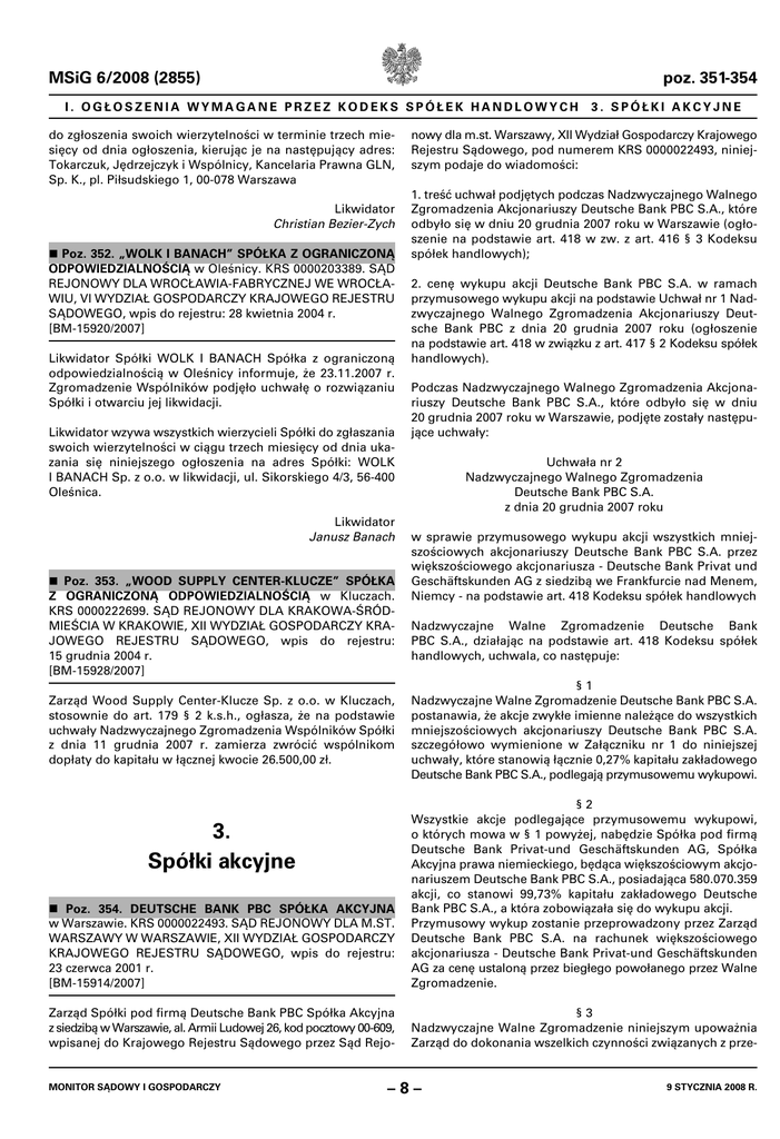 MSiG 6/2008 (2855) poz. 351-354 I. OGŁOSZENIA WYMAGANE PRZEZ KODEKS SPÓŁEK HANDLOWYCH do zgłoszenia swoich wierzytelności w terminie trzech miesięcy od dnia ogłoszenia, kierując je na następujący adres: Tokarczuk, Jędrzejczyk i Wspólnicy, Kancelaria Prawna GLN, Sp. K., pl. Piłsudskiego 1, 00-078 Warszawa Likwidator Christian Bezier-Zych Poz. 352. „WOLK I BANACH” SPÓŁKA Z OGRANICZONĄ ODPOWIEDZIALNOŚCIĄ w Oleśnicy. KRS 0000203389. SĄD REJONOWY DLA WROCŁAWIA-FABRYCZNEJ WE WROCŁAWIU, VI WYDZIAŁ GOSPODARCZY KRAJOWEGO REJESTRU SĄDOWEGO, wpis do rejestru: 28 kwietnia 2004 r. [BM-15920/2007] Likwidator Spółki WOLK I BANACH Spółka z ograniczoną odpowiedzialnością w Oleśnicy informuje, że 23.11.2007 r. Zgromadzenie Wspólników podjęło uchwałę o rozwiązaniu Spółki i otwarciu jej likwidacji. Likwidator wzywa wszystkich wierzycieli Spółki do zgłaszania swoich wierzytelności w ciągu trzech miesięcy od dnia ukazania się niniejszego ogłoszenia na adres Spółki: WOLK I BANACH Sp. z o.o. w likwidacji, ul. Sikorskiego 4/3, 56-400 Oleśnica. Likwidator Janusz Banach Poz. 353. „WOOD SUPPLY CENTER-KLUCZE” SPÓŁKA Z OGRANICZONĄ ODPOWIEDZIALNOŚCIĄ w Kluczach. KRS 0000222699. SĄD REJONOWY DLA KRAKOWA-ŚRÓDMIEŚCIA W KRAKOWIE, XII WYDZIAŁ GOSPODARCZY KRAJOWEGO REJESTRU SĄDOWEGO, wpis do rejestru: 15 grudnia 2004 r. [BM-15928/2007] Zarząd Wood Supply Center-Klucze Sp. z o.o. w Kluczach, stosownie do art. 179 § 2 k.s.h., ogłasza, że na podstawie uchwały Nadzwyczajnego Zgromadzenia Wspólników Spółki z dnia 11 grudnia 2007 r. zamierza zwrócić wspólnikom dopłaty do kapitału w łącznej kwocie 26.500,00 zł. 3. SPÓŁKI AKCYJNE nowy dla m.st. Warszawy, XII Wydział Gospodarczy Krajowego Rejestru Sądowego, pod numerem KRS 0000022493, niniejszym podaje do wiadomości: 1. treść uchwał podjętych podczas Nadzwyczajnego Walnego Zgromadzenia Akcjonariuszy Deutsche Bank PBC S.A., które odbyło się w dniu 20 grudnia 2007 roku w Warszawie (ogłoszenie na podstawie art. 418 w zw. z art. 416 § 3 Kodeksu spółek handlowych); 2. cenę wykupu akcji Deutsche Bank PBC S.A. w ramach przymusowego wykupu akcji na podstawie Uchwał nr 1 Nadzwyczajnego Walnego Zgromadzenia Akcjonariuszy Deutsche Bank PBC z dnia 20 grudnia 2007 roku (ogłoszenie na podstawie art. 418 w związku z art. 417 § 2 Kodeksu spółek handlowych). Podczas Nadzwyczajnego Walnego Zgromadzenia Akcjonariuszy Deutsche Bank PBC S.A., które odbyło się w dniu 20 grudnia 2007 roku w Warszawie, podjęte zostały następujące uchwały: Uchwała nr 2 Nadzwyczajnego Walnego Zgromadzenia Deutsche Bank PBC S.A. z dnia 20 grudnia 2007 roku w sprawie przymusowego wykupu akcji wszystkich mniejszościowych akcjonariuszy Deutsche Bank PBC S.A. przez większościowego akcjonariusza - Deutsche Bank Privat und Geschäftskunden AG z siedzibą we Frankfurcie nad Menem, Niemcy - na podstawie art. 418 Kodeksu spółek handlowych Nadzwyczajne Walne Zgromadzenie Deutsche Bank PBC S.A., działając na podstawie art. 418 Kodeksu spółek handlowych, uchwala, co następuje: §1 Nadzwyczajne Walne Zgromadzenie Deutsche Bank PBC S.A. postanawia, że akcje zwykłe imienne należące do wszystkich mniejszościowych akcjonariuszy Deutsche Bank PBC S.A. szczegółowo wymienione w Załączniku nr 1 do niniejszej uchwały, które stanowią łącznie 0,27% kapitału zakładowego Deutsche Bank PBC S.A., podlegają przymusowemu wykupowi. Poz. 354. DEUTSCHE BANK PBC SPÓŁKA AKCYJNA w Warszawie. KRS 0000022493. SĄD REJONOWY DLA M.ST. WARSZAWY W WARSZAWIE, XII WYDZIAŁ GOSPODARCZY KRAJOWEGO REJESTRU SĄDOWEGO, wpis do rejestru: 23 czerwca 2001 r. [BM-15914/2007] §2 Wszystkie akcje podlegające przymusowemu wykupowi, o których mowa w § 1 powyżej, nabędzie Spółka pod firmą Deutsche Bank Privat-und Geschäftskunden AG, Spółka Akcyjna prawa niemieckiego, będąca większościowym akcjonariuszem Deutsche Bank PBC S.A., posiadająca 580.070.359 akcji, co stanowi 99,73% kapitału zakładowego Deutsche Bank PBC S.A., a która zobowiązała się do wykupu akcji. Przymusowy wykup zostanie przeprowadzony przez Zarząd Deutsche Bank PBC S.A. na rachunek większościowego akcjonariusza - Deutsche Bank Privat-und Geschäftskunden AG za cenę ustaloną przez biegłego powołanego przez Walne Zgromadzenie. Zarząd Spółki pod firmą Deutsche Bank PBC Spółka Akcyjna z siedzibą w Warszawie, al. Armii Ludowej 26, kod pocztowy 00-609, wpisanej do Krajowego Rejestru Sądowego przez Sąd Rejo- §3 Nadzwyczajne Walne Zgromadzenie niniejszym upoważnia Zarząd do dokonania wszelkich czynności związanych z prze- 3. Spółki akcyjne MONITOR SĄDOWY I GOSPODARCZY –8– 9 STYCZNIA 2008 R. MSiG 6/2008 (2855) poz. 354 I. OGŁOSZENIA WYMAGANE PRZEZ KODEKS SPÓŁEK HANDLOWYCH 1 2 3 II 184 463 481 184 464 380 900 II 184 546 397 184 546 507 111 II 184 603 842 184 603 863 22 II 184 304 653 184 304 702 50 Ilość akcji II 184 100 397 184 100 702 306 4 II 184 551 756 184 551 763 8 110 II 184 603 864 184 605 863 2000 1842 II 184 464 381 184 464 387 7 prowadzeniem przymusowego wykupu akcji oraz zobowiązuje Zarząd Deutsche Bank PBC S.A. do ogłoszenia podjętej uchwały w „Monitorze Sądowym i Gospodarczym”. Załącznik nr 1 do uchwały: Seria Od numeru Do numeru 1 2 3 II 184 461 767 184 461 876 3. SPÓŁKI AKCYJNE 4 II 184 291 451 184 293 292 II 184 461 877 184 461 926 50 II 184 304 703 184 305 302 600 II 184 304 173 184 304 272 100 II 181 772 126 181 772 145 20 II 184 194 523 184 200 614 6092 II 184 305 323 184 305 396 74 II 183 853 837 183 855 236 1400 II 184 305 397 184 305 496 100 II 184 674 388 184 675 387 1000 II 184 305 497 184 307 496 2000 II 184 705 308 184 711 586 6279 II 184 551 764 184 551 826 63 183 874 398 183 875 247 850 II 184 550 826 184 551 090 265 II II 184 551 091 184 551 140 50 II 182 926 380 182 930 794 4415 184 551 827 184 551 903 77 II 184 596 587 184 602 721 6135 II II 181 650 649 181 656 648 6000 II 184 551