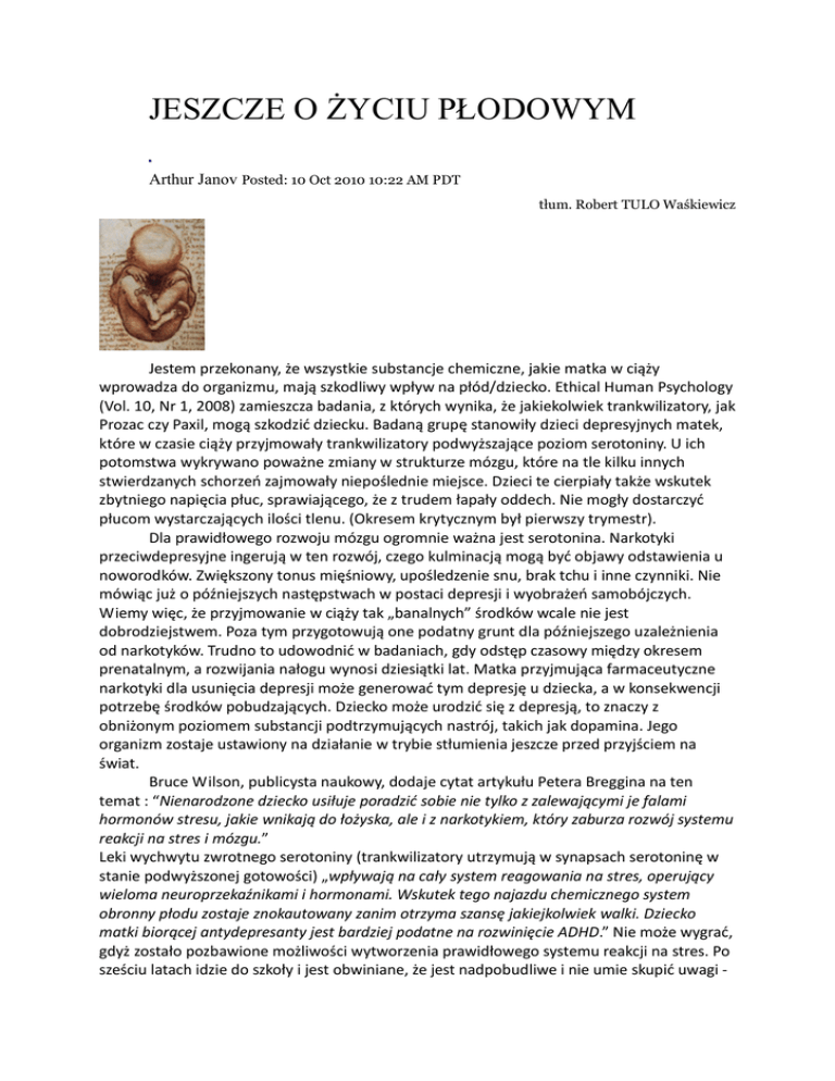 JESZCZE O YCIU PèODOWYM Arthur Janov Posted: 10 Oct 2010 10:22 AM PDT tøum. Robert TULO Wa kiewicz Jestem przekonany, e wszystkie substancje chemiczne, jakie matka w ci y wprowadza do organizmu, maj szkodliwy wpøyw na pøód/dziecko. Ethical Human Psychology (Vol. 10, Nr 1, 2008) zamieszcza badania, z których wynika, e jakiekolwiek trankwilizatory, jak Prozac czy Paxil, mog szkodzi dziecku. Badan grup stanowiøy dzieci depresyjnych matek, które w czasie ci y przyjmowaøy trankwilizatory podwy szaj ce poziom serotoniny. U ich potomstwa wykrywano powa ne zmiany w strukturze mózgu, które na tle kilku innych stwierdzanych schorze zajmowaøy niepo lednie miejsce. Dzieci te cierpiaøy tak e wskutek zbytniego napi cia pøuc, sprawiaj cego, e z trudem øapaøy oddech. Nie mogøy dostarczy pøucom wystarczaj cych ilo ci tlenu. (Okresem krytycznym byø pierwszy trymestr). Dla prawidøowego rozwoju mózgu ogromnie wa na jest serotonina. Narkotyki przeciwdepresyjne ingeruj w ten rozwój, czego kulminacj mog by objawy odstawienia u noworodków. Zwi kszony tonus mi niowy, upo ledzenie snu, brak tchu i inne czynniki. Nie mówi c ju o pó niejszych nast pstwach w postaci depresji i wyobra e samobójczych. Wiemy wi c, e przyjmowanie w ci y tak „banalnych” rodków wcale nie jest dobrodziejstwem. Poza tym przygotowuj one podatny grunt dla pó niejszego uzale nienia od narkotyków. Trudno to udowodni w badaniach, gdy odst p czasowy mi dzy okresem prenatalnym, a rozwijania naøogu wynosi dziesi tki lat. Matka przyjmuj ca farmaceutyczne narkotyki dla usuni cia depresji mo e generowa tym depresj u dziecka, a w konsekwencji potrzeb rodków pobudzaj cych. Dziecko mo e urodzi si z depresj , to znaczy z obni onym poziomem substancji podtrzymuj cych nastrój, takich jak dopamina. Jego organizm zostaje ustawiony na dziaøanie w trybie støumienia jeszcze przed przyj ciem na wiat. Bruce Wilson, publicysta naukowy, dodaje cytat artykuøu Petera Breggina na ten temat : “Nienarodzone dziecko usiøuje poradzi sobie nie tylko z zalewaj cymi je falami hormonów stresu, jakie wnikaj do øo yska, ale i z narkotykiem, który zaburza rozwój systemu reakcji na stres i mózgu.” Leki wychwytu zwrotnego serotoniny (trankwilizatory utrzymuj w synapsach serotonin w stanie podwy szonej gotowo ci) „wpøywaj na caøy system reagowania na stres, operuj cy wieloma neuroprzeka nikami i hormonami. Wskutek tego najazdu chemicznego system obronny pøodu zostaje znokautowany zanim otrzyma szans jakiejkolwiek walki. Dziecko matki bior cej antydepresanty jest bardziej podatne na rozwini cie ADHD.” Nie mo e wygra , gdy zostaøo pozbawione mo liwo ci wytworzenia prawidøowego systemu reakcji na stres. Po sze ciu latach idzie do szkoøy i jest obwiniane, e jest nadpobudliwe i nie umie skupi uwagi - ADD. A potem nast puje jeszcze gorsze – zostaje wysøane do psychologów, aby wykryli, co z nim jest nie tak, a ci znowu podaj mu narkotyki. Aj, AJ, Aj! Dziecko jest zdane na nie, gdy w psychologicznym arsenale rodków nie ma miejsca na teorie wpøywu ycia pøodowego, które umo liwiøyby leczenie bez narkotyków. W wietle wiedzy, jak mamy i jak tu w skrócie przytaczam, jest niemal kryminaøem nie przyjmowa do wiadomo ci kluczowej roli najwcze niejszych okresów rozwojowych dla zdrowia i dobrostanu psychicznego. Oznacza to pozbawianie pacjentów jakiejkolwiek szansy na odzyskanie stabilno ci, na dobry zwi zek w yciu, a tak e na to, by w dziewi dziesi tym roku ycia ich serca wci dobrze funkcjonowaøy. Mamy a nadto dowodów, e farmaceutyczne narkotyki przyjmowane przez matki w ci y przekøadaj si na pó niejsze choroby serca u dzieci. (Zob.: Robert Whitaker. The Anatomy of an Epidemic. Robert Whitaker.org)