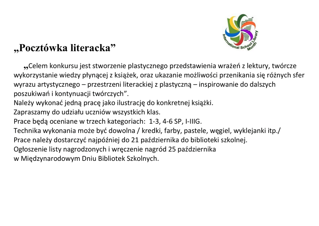 „Pocztówka literacka” „Celem konkursu jest stworzenie plastycznego przedstawienia wrażeo z lektury, twórcze wykorzystanie wiedzy płynącej z książek, oraz ukazanie możliwości przenikania się różnych sfer wyrazu artystycznego – przestrzeni literackiej z plastyczną – inspirowanie do dalszych poszukiwao i kontynuacji twórczych”. Należy wykonad jedną pracę jako ilustrację do konkretnej książki. Zapraszamy do udziału uczniów wszystkich klas. Prace będą oceniane w trzech kategoriach: 1-3, 4-6 SP, I-IIIG. Technika wykonania może byd dowolna / kredki, farby, pastele, węgiel, wyklejanki itp./ Prace należy dostarczyd najpóźniej do 21 października do biblioteki szkolnej. Ogłoszenie listy nagrodzonych i wręczenie nagród 25 października w Międzynarodowym Dniu Bibliotek Szkolnych.
