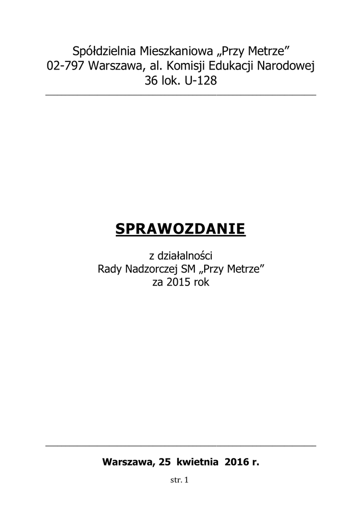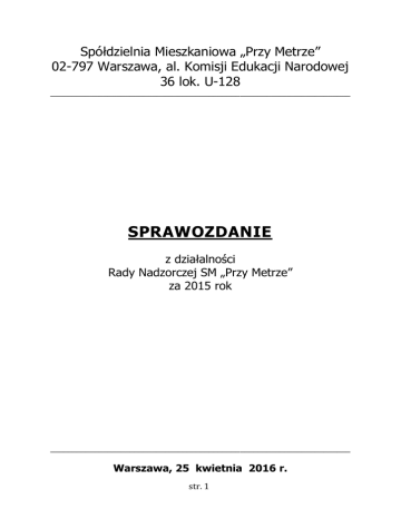 Spółdzielnia Mieszkaniowa „Przy Metrze” 02-797 Warszawa, al. Komisji Edukacji Narodowej 36 lok. U-128 ____________________________________________________________________ SPRAWOZDANIE z działalności Rady Nadzorczej SM „Przy Metrze” za 2015 rok ____________________________________________________________________ Warszawa, 25 kwietnia 2016 r. str. 1 I. Wprowadzenie 1. Rok 2015 był kolejnym rokiem działalności Rady Nadzorczej VIII Kadencji, wybranej przez Zebranie Przedstawicieli 15 czerwca 2013 r. Skład Rady Nadzorczej przedstawiał się następująco: Przewodniczący RN: Zastępca Przewodniczącego RN: Sekretarz RN: Członkowie RN: Marek Wojtalewicz, Agnieszka Tomaszewska - Ostrowska, Lucyna Kołnierzak, Maria Czarnecka, Henryk Klitenik, Marek Patrzykont, Jadwiga Piotrowska, Krzysztof Szarecki, Edyta Wargocka. 2. Niniejsze sprawozdanie Rady Nadzorczej opiera się na protokołach posiedzeń i wykazach decyzji Rady Nadzorczej VIII kadencji z 2015 roku. 3. Sprawozdanie zawiera: Omówienie realizacji celów i założeń pracy Rady Nadzorczej na 2015 rok, Informację o Zarządzie Spółdzielni, Prezentację wybranych i istotnych zagadnień z 2015 roku, istotnych z punktu widzenia Rady Nadzorczej, Cele i założenia pracy Rady Nadzorczej na 2016 rok. 4. Sprawozdanie zamyka wykaz decyzji i uchwał Rady Nadzorczej, które dają pełny obraz prowadzonej działalności w 2015 r. Rada Nadzorcza składa podziękowania wszystkim członkom SM „Przy Metrze”, którzy swoją aktywnością przyczynili się do poprawy jakości funkcjonowania naszej Spółdzielni. II. Zarząd SM „Przy Metrze” 1. W 2015 roku skład Zarządu przedstawiał się następująco: Prezes Zarządu Zastępca Prezesa ds. Technicznych Zastępca Prezesa ds. Organizacyjno-Prawnych str. 2 Marek Pykało Michał Wojtasiewicz Grzegorz Janas 2. W toku realizacji swoich zadań Rada Nadzorcza ściśle współpracowała z Zarządem Spółdzielni, którego członkowie uczestniczyli we wszystkich posiedzeniach Rady Nadzorczej. Sprawy zgłaszane przez członków Rady Nadzorczej Zarządowi były w większości realizowane na bieżąco. 3. Członkowie RN byli powiadamiani i zapraszani na wszystkie przetargi oraz uczestniczyli jako obserwatorzy w wielu przetargach organizowanych przez Zarząd Spółdzielni. 4. Co kwartał Rada Nadzorcza ustalała wysokość premii dla członków Zarządu. Ocena pracy członków Zarządu skutkowała przyznawaniem premii w odpowiedniej wysokości - średnia wysokość premii dla członków Zarządu w 2015 r. to 15,31 % (zgodnie z Regulaminem Wynagradzania Zarządu Rada Nadzorcza może przyznawać poszczególnym członkom Zarządu premie w wysokości od 1% do 30%). Dla poszczególnych członków Zarządu średnie premie w 2015 roku były następujące: Prezes Zarządu Zastępca Prezesa ds. Technicznych Zastępca Prezesa ds. Organizacyjno- Prawnych Marek Pykało Michał Wojtasiewicz 11,40% 20,15% Grzegorz Janas 14,40% 5. Podkreślić należy, że mimo różnic w ocenie niektórych problemów i sposobów ich rozwiązania współpraca Rady Nadzorczej z Zarządem układała się pozytywnie. Rada Nadzorcza konsekwentnie podejmowała merytoryczną współpracę z Zarządem, skutkującą rozwiązywaniem tych problemów. III. Realizacja celów i założeń pracy Rady Nadzorczej w 2015 r. W roku 2015 Rada Nadzorcza nadzorowała pracę Zarządu, w szczególności zajmowała się następującymi zagadnieniami: 1. Opracowaniem założeń do spójnego systemu finansowej sprawozdawczości zarządczej. Rada Nadzorcza w 2015 roku, w porozumieniu z Zarządem, współpracowała w modyfikacji informacji zarządczej dotyczącej spółdzielni. Wprowadzono w 2015 roku dodatkowe bieżące raporty o pracach Zarządu. Raporty te dały pełniejszy dostęp do wielu informacji o działaniach prowadzonych przez Spółdzielnię, co ułatwiło i poszerzyło nadzór i kontrolę RN nad działalnością Spółdzielni oraz nad pracą Zarządu. W stosunku do lat ubiegłych uległy zdecydowanie znaczącej poprawie opracowania Planu finansowo-gospodarczego, Planu Remontów oraz raporty str. 3 o ich realizacji w ciągu roku, a także prezentacja innych informacji zarządczych. 2. Nadzór nad stanem technicznym budynków oraz racjonalnym planowaniem prac remontowych. Na podstawie zaprezentowanego przez Zarząd szczegółowego Planu Remontów mogliśmy nadzorować postęp prac w zakresie: - wymiany naświetli i wind, remontu balkonów oraz modernizacji budynków w zakresie gospodarki cieplnej, - niwelowania barier architektonicznych, - modernizacji placów zabaw i terenów zielonych, - konserwacji infrastruktury technicznej (systemy p. poż., wentylacyjne, itp.) - prac modernizacyjnych placów zabaw oraz terenów zielonych. Nowy Regulamin przetargów umożliwił uzyskanie bardzo atrakcyjnych stawek za wykonywane prace remontowe, a szczegółowy harmonogram prac w ramach Planu Remontów umożliwił prawidłową kontrolę i nadzór nad terminową realizacją prac oraz na uzyskanie dodatkowych dochodów z tytułu kar umownych w przypadku przekroczenia terminu realizacji prac, a także na zwiększenie zakresu robót przy utrzymaniu takich samych planowanych kosztów remontów. 3. W ramach realizacji założeń na 2015r Rada Nadzorcza podjęła uchwały w zakresie wewnątrzspółdzielczych regulaminów. Dokonano zmian lub przyjęto nowe regulaminy: Uchwała 10/15 z dnia 12.01.15r Uchwała 13/15 z dnia 23.02.15r Uchwała 14/15 z dnia 16.03.15r Uchwała 17/15 z dnia 20.04.15r Uchwała 181/15 z dnia 28.05.15r Uchwała 184/15 z dnia 15.06.15r Przyjęcie Regulaminu wynajmu powierzchni reklamowych na budynkach i terenach SM „Przy Metrze” Wprowadzenie Regulaminu Rozliczania kosztów energii cieplnej do celów ogrzewania i podgrzania wody w zasobach SM „Przy Metrze” Wprowadzenie zmian do Regulaminu użytkowania lokali, garaży oraz porządku domowego w budynkach SM „Przy Metrze”. (dot. ogródków przydomowych). Przyjęcie Regulaminu ochron