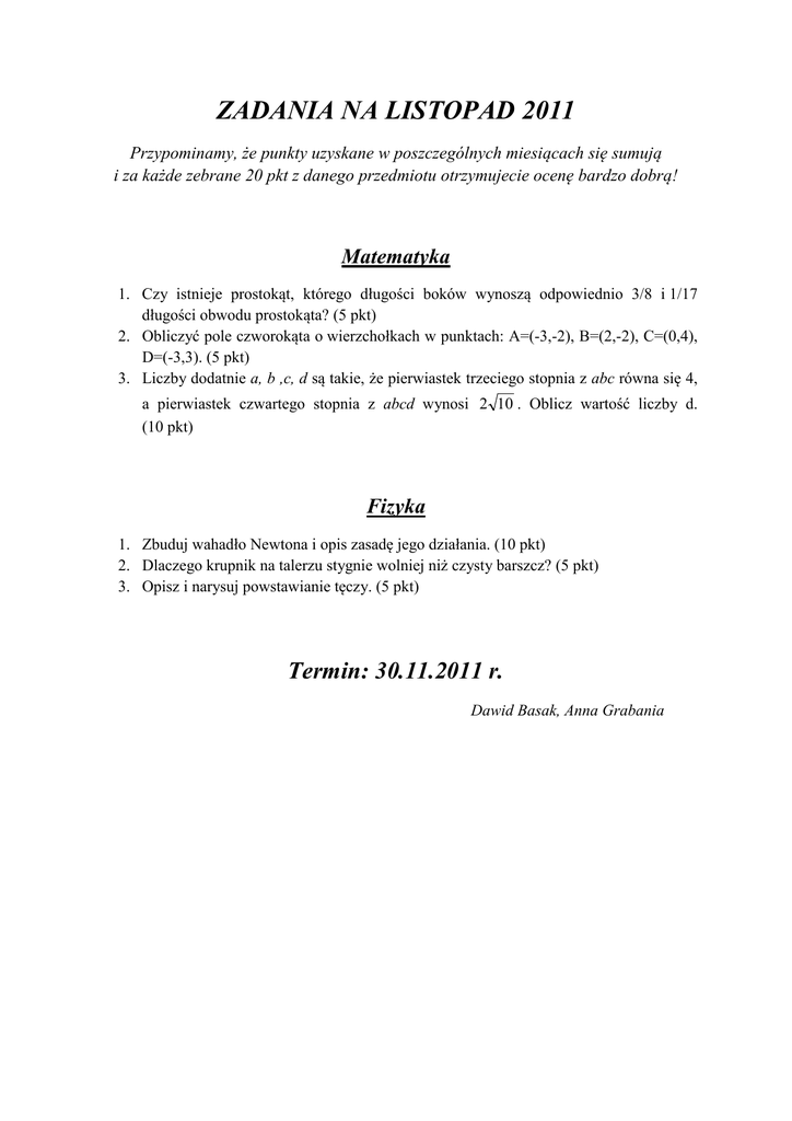 ZADANIA NA LISTOPAD 2011 Przypominamy, że punkty uzyskane w poszczególnych miesiącach się sumują i za każde zebrane 20 pkt z danego przedmiotu otrzymujecie ocenę bardzo dobrą! Matematyka 1. Czy istnieje prostokąt, którego długości boków wynoszą odpowiednio 3/8 i 1/17 długości obwodu prostokąta? (5 pkt) 2. Obliczyć pole czworokąta o wierzchołkach w punktach: A=(-3,-2), B=(2,-2), C=(0,4), D=(-3,3). (5 pkt) 3. Liczby dodatnie a, b ,c, d są takie, że pierwiastek trzeciego stopnia z abc równa się 4, a pierwiastek czwartego stopnia z abcd wynosi 2 10 . Oblicz wartość liczby d. (10 pkt) Fizyka 1. Zbuduj wahadło Newtona i opis zasadę jego działania. (10 pkt) 2. Dlaczego krupnik na talerzu stygnie wolniej niż czysty barszcz? (5 pkt) 3. Opisz i narysuj powstawianie tęczy. (5 pkt) Termin: 30.11.2011 r. Dawid Basak, Anna Grabania