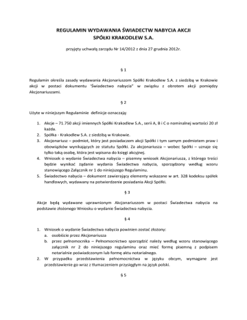 REGULAMIN WYDAWANIA ŚWIADECTW NABYCIA AKCJI SPÓŁKI KRAKODLEW S.A. przyjęty uchwałą zarządu Nr 14/2012 z dnia 27 grudnia 2012r. §1 Regulamin określa zasady wydawania Akcjonariuszom Spółki Krakodlew S.A. z siedzibą w Krakowie akcji w postaci dokumentu ‘Świadectwo nabycia” w związku z obrotem akcji pomiędzy Akcjonariuszami. §2 Użyte w niniejszym Regulaminie definicje oznaczają: 1. Akcje – 71.750 akcji imiennych Spółki Krakodlew S.A., serii A, B i C o nominalnej wartości 20 zł każda. 2. Spółka - Krakodlew S.A. z siedzibą w Krakowie. 3. Akcjonariusz – podmiot, który jest posiadaczem akcji Spółki i tym samym podmiotem praw i obowiązków wynikających ze statutu Spółki. Za akcjonariusza – wobec Spółki – uznaje się tylko taką osobę, która jest wpisana do księgi akcyjnej. 4. Wniosek o wydanie Świadectwa nabycia – pisemny wniosek Akcjonariusza, z którego treści będzie wynikać żądanie wydania Świadectwa nabycia, sporządzony według wzoru stanowiącego Załącznik nr 1 do niniejszego Regulaminu. 5. Świadectwo nabycia – dokument zawierający elementy wskazane w art. 328 kodeksu spółek handlowych, wydawany na potwierdzenie posiadania Akcji Spółki. §3 Akcje będą wydawane uprawnionym Akcjonariuszom w postaci Świadectwa nabycia na podstawie złożonego Wniosku o wydanie Świadectwa nabycia. §4 1. Wniosek o wydanie Świadectwa nabycia powinien zostać złożony: a. osobiście przez Akcjonariusza b. przez pełnomocnika – Pełnomocnictwo sporządzić należy według wzoru stanowiącego załącznik nr 2 do niniejszego regulaminu oraz mieć formę pisemną z podpisem notarialnie poświadczonym lub formę aktu notarialnego. 2. W przypadku przedstawienia pełnomocnictwa w języku obcym, wymagane jest przedstawienie go wraz z tłumaczeniem przysięgłym na język polski. §5 1. Wydawanie przez Spółkę dokumentu „Świadectwo nabycia” odbywać się będzie w terminie jednego tygodnia od daty doręczenia Spółce wniosku o wydanie Świadectwa nabycia, w siedzibie Spółki przy ul. Ujastek 1, 30-969 Kraków, w sekretariacie Spółki w godzinach 9.00 – 12.00 przez osobę upoważnioną przez Zarząd Spółki. 2. Wydanie dokumentu „Świadectwo nabycia” następuje po okazaniu przez uprawnionego Akcjonariusza: a. Dowodu tożsamości (w przypadku osób fizycznych), b. W przypadku podmiotów innych niż osoby fizyczne – po okazaniu aktualnego odpisu z właściwego rejestru potwierdzającego upoważnienie osoby fizycznej (osób fizycznych) do reprezentowania Akcjonariusza oraz okazaniu przez osobę fizyczną (osoby fizyczne) uprawnione do reprezentacji Akcjonariusza dowodu (dowodów) tożsamości. Odpis z właściwego rejestru, o którym mowa w poprzednim zdaniu powinien zostać okazany w oryginale lub kopii, potwierdzonej za zgodność z oryginałem przez notariusza. 3. Wydanie dokumentu „Świadectwo nabycia” pełnomocnikowi następuje po złożeniu w Spółce oryginału pełnomocnictwa oraz po okazaniu: a. Dowodu tożsamości, b. Odpisu z właściwego rejestru potwierdzającego upoważnienie osoby fizycznej (osób fizycznych) udzielającej (udzielających) pełnomocnictwa do reprezentowania Akcjonariusza nie będącego osobą fizyczną, c. W przypadku pełnomocnika nie będącego osobą fizyczną aktualnego odpisu z właściwego rejestru potwierdzającego upoważnienie osoby fizycznej (osób fizycznych) do reprezentowania pełnomocnika oraz okazaniu przez osobę fizyczną (osoby fizyczne) uprawnione do reprezentacji pełnomocnika dowodu (dowodów) tożsamości. Odpis z właściwego rejestru, o którym mowa w poprzednim zdaniu powinien zostać okazany w oryginale lub kopii, potwierdzonej za zgodność z oryginałem przez notariusza. 4. Odbiór dokumentu „Świadectwo nabycia” Akcjonariusz lub jego pełnomocnik potwierdza własnoręcznym podpisem na odwrocie karty z księgi akcyjnej, którego Świadectwo nabycia dotyczy. 5. Wszelkie pełnomocnictwa wymienione z niniejszym paragrafie muszą posiadać formę aktu notarialnego. §6 1. Dokumenty „Świadectwo nabycia”, które nie zostaną wydane z powodu braku stosownego wniosku o wydanie Świadectwa nabycia lub innego powodu leżącego po stronie Akcjonariusza, zostaną zdeponowane w sekretariacie Spółki. 2. Akcjonariusz może podjąć zdeponowane dokumenty „Świadectwo nabycia” w każdym czasie, pod warunkiem dopełnienia procedury związanej z ich wydaniem, opisanej w niniejszym Regulaminie. §7 Niniejszy Regulamin wchodzi w życie z dniem 27 grudnia 2012r. i będzie stosowany do odwołania. Załącznik nr 1 Do REGULAMINU WYDAWANIA ŚWIADECTW NABYCIA SPÓŁKI KRAKODLEW S.A. ……………………………………………… (Imię i nazwisko Akcjonariusza) ………………………………………………. (Adres zamieszkania lub siedziba) Zarząd Spółki Krakodlew S.A. Ul. Ujastek 1 30-969 Kraków WNIOSEK O wydanie dokumentu „Świadectwo nabycia” Działając w imieniu własnym/ w imieniu ……………………………,załączając udzielone pełnomocnictwo (jeżeli działa pełnomocnik) wraz z odpisem z właściwego rejestru (dla podmiotów nie będących osobami fizycznymi) wnoszę o wydanie dokumentu Świadectwo nabycia Akcji Spółki Krakodlew S.A. z siedzibą w Krakowie. ……………………………………….. (data i podpis) Załączniki: 1. Pełnomocnictwo (jeżeli wniosek składany jest przez pełnomocnika) Załącznik nr 2 Do REGULAMINU WYDAWANIA ŚWIADECTW NABYCIA SPÓŁKI KRAKODLEW S.A. PEŁNOMOCNICTWO Pan/Pani……………………………………………………………….. zam. W ………………………….. przy ul. ……………………. PESEL: ………………………………….. nr dowodu osobistego ………………………… wydanego przez ……………………………………………….., jako Akcjonariusz Spółki Krakodlew S.A. z siedzibą w Krakowie, upoważnia Panią/Pana ………………