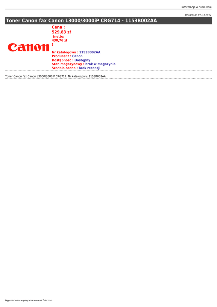 Informacje o produkcie Utworzono 07-03-2017 Toner Canon fax Canon L3000/3000iP CRG714 - 1153B002AA Cena : 529,83 zł (netto: 430,76 zł ) Nr katalogowy : 1153B002AA Producent : Canon Dostępność : Dostępny Stan magazynowy : brak w magazynie Średnia ocena : brak recenzji Toner Canon fax Canon L3000/3000iP CRG714. Nr katalogowy: 1153B002AA Wygenerowano w programie www.oscGold.com