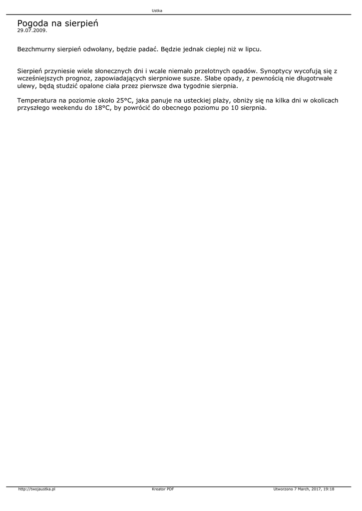 Ustka Pogoda na sierpień 29.07.2009. Bezchmurny sierpień odwołany, będzie padać. Będzie jednak cieplej niż w lipcu. Sierpień przyniesie wiele słonecznych dni i wcale niemało przelotnych opadów. Synoptycy wycofują się z wcześniejszych prognoz, zapowiadających sierpniowe susze. Słabe opady, z pewnością nie długotrwałe ulewy, będą studzić opalone ciała przez pierwsze dwa tygodnie sierpnia. Temperatura na poziomie około 25°C, jaka panuje na usteckiej plaży, obniży się na kilka dni w okolicach przyszłego weekendu do 18°C, by powrócić do obecnego poziomu po 10 sierpnia. http://twojaustka.pl Kreator PDF Utworzono 7 March, 2017, 19:18