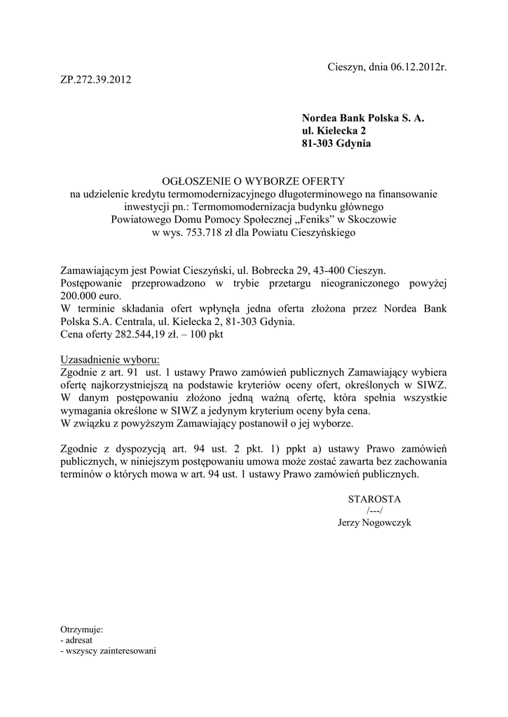Cieszyn, dnia 06.12.2012r. ZP.272.39.2012 Nordea Bank Polska S. A. ul. Kielecka 2 81-303 Gdynia OGŁOSZENIE O WYBORZE OFERTY na udzielenie kredytu termomodernizacyjnego długoterminowego na finansowanie inwestycji pn.: Termomomodernizacja budynku głównego Powiatowego Domu Pomocy Społecznej „Feniks” w Skoczowie w wys. 753.718 zł dla Powiatu Cieszyńskiego Zamawiającym jest Powiat Cieszyński, ul. Bobrecka 29, 43-400 Cieszyn. Postępowanie przeprowadzono w trybie przetargu nieograniczonego powyżej 200.000 euro. W terminie składania ofert wpłynęła jedna oferta złożona przez Nordea Bank Polska S.A. Centrala, ul. Kielecka 2, 81-303 Gdynia. Cena oferty 282.544,19 zł. – 100 pkt Uzasadnienie wyboru: Zgodnie z art. 91 ust. 1 ustawy Prawo zamówień publicznych Zamawiający wybiera ofertę najkorzystniejszą na podstawie kryteriów oceny ofert, określonych w SIWZ. W danym postępowaniu złożono jedną ważną ofertę, która spełnia wszystkie wymagania określone w SIWZ a jedynym kryterium oceny była cena. W związku z powyższym Zamawiający postanowił o jej wyborze. Zgodnie z dyspozycją art. 94 ust. 2 pkt. 1) ppkt a) ustawy Prawo zamówień publicznych, w niniejszym postępowaniu umowa może zostać zawarta bez zachowania terminów o których mowa w art. 94 ust. 1 ustawy Prawo zamówień publicznych. STAROSTA /---/ Jerzy Nogowczyk Członkowie Komisji Przetargowej: - Józef Waschut - Jacek Wiśniewski - Bogumiła Walica - Gabriela Sztuchlik Otrzymuje: - adresat - wszyscy zainteresowani