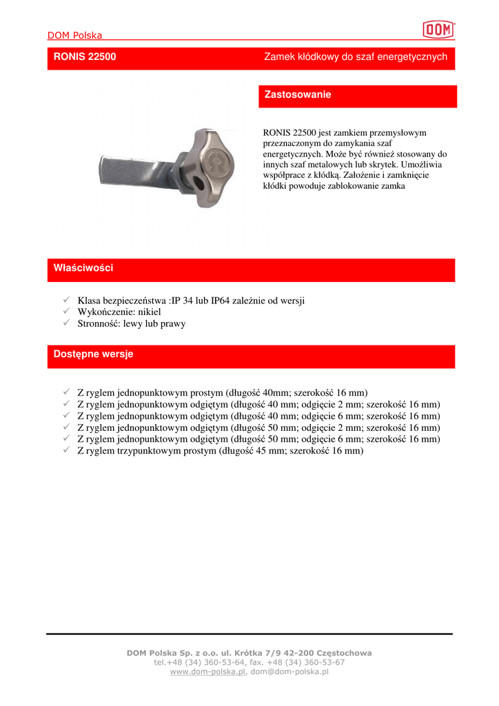 DOM Polska RONIS 22500 Zamek kłódkowy do szaf energetycznych Zastosowanie RONIS 22500 jest zamkiem przemysłowym przeznaczonym do zamykania szaf energetycznych. Może być również stosowany do innych szaf metalowych lub skrytek. Umożliwia współprace z kłódką. Założenie i zamknięcie kłódki powoduje zablokowanie zamka Właściwości Klasa bezpieczeństwa :IP 34 lub IP64 zależnie od wersji Wykończenie: nikiel Stronność: lewy lub prawy Dostępne wersje Z ryglem jednopunktowym prostym (długość 40mm; szerokość 16 mm) Z ryglem jednopunktowym odgiętym (długość 40 mm; odgięcie 2 mm; szerokość 16 mm) Z ryglem jednopunktowym odgiętym (długość 40 mm; odgięcie 6 mm; szerokość 16 mm) Z ryglem jednopunktowym odgiętym (długość 50 mm; odgięcie 2 mm; szerokość 16 mm) Z ryglem jednopunktowym odgiętym (długość 50 mm; odgięcie 6 mm; szerokość 16 mm) Z ryglem trzypunktowym prostym (długość 45 mm; szerokość 16 mm) DOM Polska Sp. z o.o. ul. Krótka 7/9 42-200 Częstochowa tel.+48 (34) 360-53-64, fax. +48 (34) 360-53-67 www.dom-polska.pl, [email protected] DOM Polska RONIS 22500 Zamek kłódkowy do szaf energetycznych Wymiary Otwór typ 1 Otwór typ 2 Otwór typ 3 Otwór typ 4 DOM Polska Sp. z o.o. ul. Krótka 7/9 42-200 Częstochowa tel.+48 (34) 360-53-64, fax. +48 (34) 360-53-67 www.dom-polska.pl, [email protected]