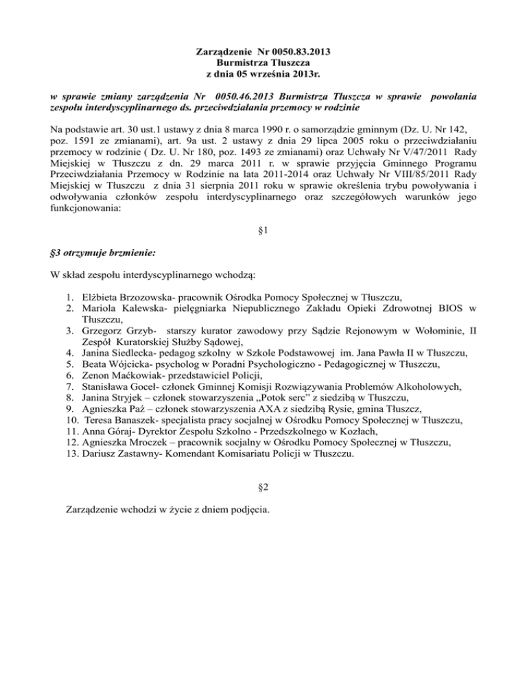 Zarządzenie Nr 0050.83.2013 Burmistrza Tłuszcza z dnia 05 września 2013r. w sprawie zmiany zarządzenia Nr 0050.46.2013 Burmistrza Tłuszcza w sprawie powołania zespołu interdyscyplinarnego ds. przeciwdziałania przemocy w rodzinie Na podstawie art. 30 ust.1 ustawy z dnia 8 marca 1990 r. o samorządzie gminnym (Dz. U. Nr 142, poz. 1591 ze zmianami), art. 9a ust. 2 ustawy z dnia 29 lipca 2005 roku o przeciwdziałaniu przemocy w rodzinie ( Dz. U. Nr 180, poz. 1493 ze zmianami) oraz Uchwały Nr V/47/2011 Rady Miejskiej w Tłuszczu z dn. 29 marca 2011 r. w sprawie przyjęcia Gminnego Programu Przeciwdziałania Przemocy w Rodzinie na lata 2011-2014 oraz Uchwały Nr VIII/85/2011 Rady Miejskiej w Tłuszczu z dnia 31 sierpnia 2011 roku w sprawie określenia trybu powoływania i odwoływania członków zespołu interdyscyplinarnego oraz szczegółowych warunków jego funkcjonowania: §1 §3 otrzymuje brzmienie: W skład zespołu interdyscyplinarnego wchodzą: 1. Elżbieta Brzozowska- pracownik Ośrodka Pomocy Społecznej w Tłuszczu, 2. Mariola Kalewska- pielęgniarka Niepublicznego Zakładu Opieki Zdrowotnej BIOS w Tłuszczu, 3. Grzegorz Grzyb- starszy kurator zawodowy przy Sądzie Rejonowym w Wołominie, II Zespół Kuratorskiej Służby Sądowej, 4. Janina Siedlecka- pedagog szkolny w Szkole Podstawowej im. Jana Pawła II w Tłuszczu, 5. Beata Wójcicka- psycholog w Poradni Psychologiczno - Pedagogicznej w Tłuszczu, 6. Zenon Maćkowiak- przedstawiciel Policji, 7. Stanisława Goceł- członek Gminnej Komisji Rozwiązywania Problemów Alkoholowych, 8. Janina Stryjek – członek stowarzyszenia „Potok serc” z siedzibą w Tłuszczu, 9. Agnieszka Paź – członek stowarzyszenia AXA z siedzibą Rysie, gmina Tłuszcz, 10. Teresa Banaszek- specjalista pracy socjalnej w Ośrodku Pomocy Społecznej w Tłuszczu, 11. Anna Góraj- Dyrektor Zespołu Szkolno - Przedszkolnego w Kozłach, 12. Agnieszka Mroczek – pracownik socjalny w Ośrodku Pomocy Społecznej w Tłuszczu, 13. Dariusz Zastawny- Komendant Komisariatu Policji w Tłuszczu. §2 Zarządzenie wchodzi w życie z dniem podjęcia. UZASADNIENIE do Zarządzenia Burmistrza Tłuszcza Nr 0050.131.201 z dnia 30 października 2012 r. Zgodnie z art. 6 ust. 1 i ust. 2 pkt. 4 ustawy z dnia 29 lipca 2005 r. o przeciwdziałaniu przemocy w rodzinie (Dz. U. Nr 180, poz. 1493 z późn. zm.), gminy zobowiązane są do tworzenia zespołów interdyscyplinarnych m.in. ds. przeciwdziałania przemocy w rodzinie. W związku z powyższym w dniu 31 sierpnia 2011 r. Rada Miejska w Tłuszczu podjęła uchwałę Nr VIII/85/2011 w sprawie określenia trybu powołania i odwoływania członków zespołu interdyscyplinarnego oraz szczegółowych warunków jego funkcjonowania. W myśl ww. przepisów. zespół interdyscyplinarny tworzy Burmistrz, powołując do niego przedstawicieli: jednostek organizacyjnych pomocy społecznej, gminnej komisji rozwiązywania problemów alkoholowych, Policji, Oświaty, ochrony zdrowia i organizacji pozarządowych. Jednocześnie Zespół ma za zadanie m.in.: diagnozowanie problemu przemocy w rodzinie, następnie podejmowanie działań w środowisku zagrożonym przemocą w celach zapobiegawczych bądź podejmowanie interwencji w środowisku dotkniętym patologią. W celu realizacji powyższych zadań konieczne jest opracowanie i realizacja indywidualnych planów pomocy i inicjowanie działań w stosunku do osób stosujących przemoc, a następnie monitorowanie sytuacji w tych rodzinach. Dodatkowo do zadań zespołu należy również dokumentowanie podejmowanych działań a także ich efektów. Realizując obowiązki nałożone ww. przepisami ustawy, Burmistrz Tłuszcza, procedując zgodnie z ww. uchwałą Rady Miejskiej powołał nowych członków do zespołu interdyscyplinarnego.
