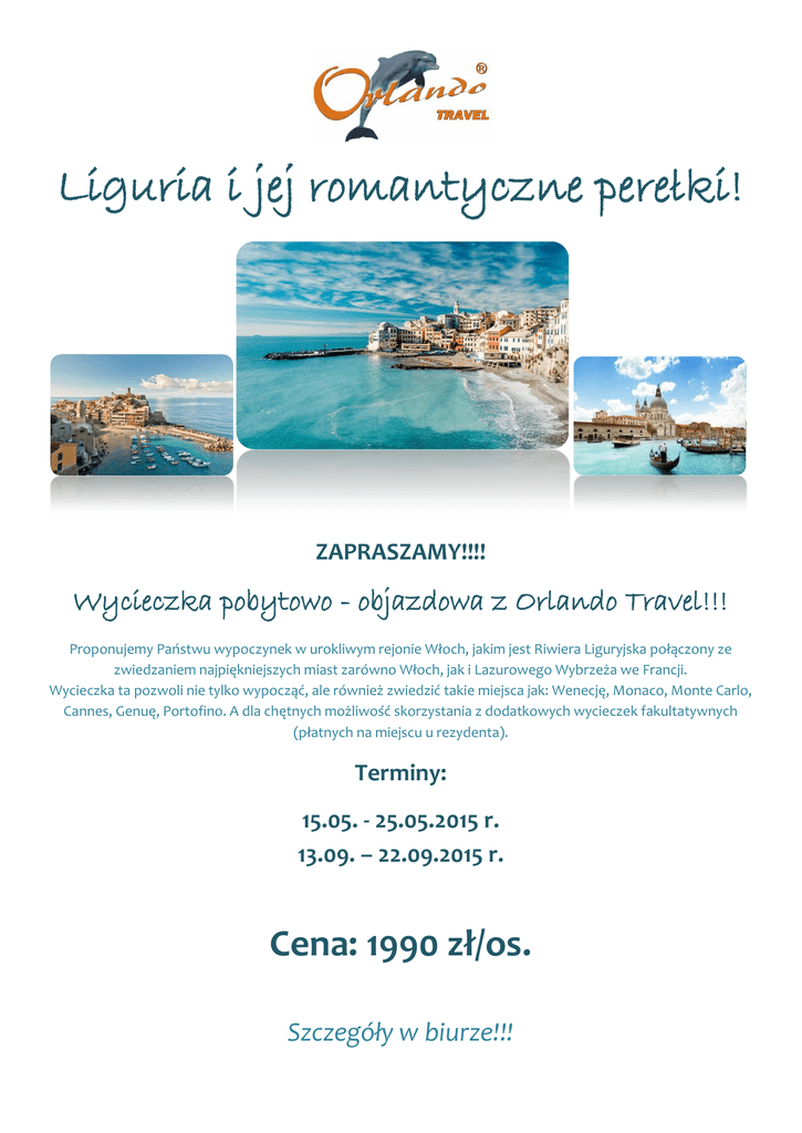 Liguria i jej romantyczne perełki! ZAPRASZAMY!!!! Wycieczka pobytowo - objazdowa z Orlando Travel!!! Proponujemy Państwu wypoczynek w urokliwym rejonie Włoch, jakim jest Riwiera Liguryjska połączony ze zwiedzaniem najpiękniejszych miast zarówno Włoch, jak i Lazurowego Wybrzeża we Francji. Wycieczka ta pozwoli nie tylko wypocząć, ale również zwiedzić takie miejsca jak: Wenecję, Monaco, Monte Carlo, Cannes, Genuę, Portofino. A dla chętnych możliwość skorzystania z dodatkowych wycieczek fakultatywnych (płatnych na miejscu u rezydenta). Terminy: 15.05. - 25.05.2015 r. 13.09. – 22.09.2015 r. Cena: 1990 zł/os. Szczegóły w biurze!!!
