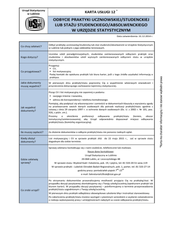 Urząd Statystyczny w Lublinie KARTA USŁUGI 12 * ODBYCIE PRAKTYKI UCZNIOWSKIEJ/STUDENCKIEJ LUB STAŻU STUDENCKIEGO/ABSOLWENCKIEGO W URZĘDZIE STATYSTYCZNYM Data zatwierdzenia: 31.12.2014 r. Co chcę załatwić? Odbyć praktykę uczniowską/studencką lub staż studencki/absolwencki w Urzędzie Statystycznym w Lublinie lub jednym z jego oddziałów terenowych. Kogo dotyczy? Uczniów szkół ponadgimnazjalnych, studentów zainteresowanych odbyciem praktyki oraz studentów i absolwentów szkół wyższych zainteresowanych odbyciem stażu w urzędzie statystycznym. Co przygotować? Przygotuj: CV, list motywacyjny. Podaj kontakt do opiekuna praktyki lub biura karier, jeśli z tego źródła uzyskałeś informację o praktyce. Jakie dokumenty muszę wypełnić? W pierwszym dniu praktyki/stażu poprosimy Cię o wypełnienie właściwych oświadczeń i przyrzeczenia dotyczącego zachowania tajemnicy statystycznej. Pisząc CV i list motywacyjny nie zapomnij o podaniu: swojego imienia i nazwiska, adresu do korespondencji i telefonu kontaktowego. Jak wypełnić dokumenty? Pamiętaj, aby podpisać się własnoręcznie i zamieścić w dokumentach klauzulę o wyrażeniu zgody na przetwarzanie swoich danych osobowych dla potrzeb realizacji praktyki/stażu zgodnie z ustawą z dnia 29 sierpnia 1997 r. o ochronie danych osobowych (Dz. U. z 2002 r. Nr 101, poz. 926, z późn. zm.). Prosimy o określenie preferencji odbywania praktyki/stażu (termin, obszar tematyczny/zainteresowania), aby Urząd odpowiednio dopasował miejsce odbywania praktyki/stażu (komórkę organizacyjną). Ile muszę zapłacić? Za złożenie dokumentów o odbycie praktyki/stażu nie ponosisz żadnych opłat. Kiedy złożyć dokumenty? List motywacyjny i CV w sprawie praktyki złóż do 22 maja 2015 r., zaś w sprawie stażu dogodnym dla siebie terminie. Sprawę załatwisz kontaktując się z nami osobiście, telefonicznie lub mailowo. Nasze dane kontaktowe: Urząd Statystyczny w Lublinie Gdzie załatwię sprawę? 20-068 Lublin, ul. Leszczyńskiego 48 W sprawie stażu: Wydział Kadr i Szkolenia, pok. 19, I piętro, tel: 81 533-20-51 wew.119 W sprawie praktyki : Lubelski Ośrodek Badań Regionalnych, pok. 1, parter, tel. 81 533-27-14 00 00 godziny pracy: poniedziałek-piątek 7 -15 e-mail: [email protected] Co zrobi urząd? Po otrzymaniu dokumentów przeanalizujemy możliwość przyjęcia Cię na praktykę/staż. W przypadku decyzji pozytywnej skontaktujemy się z Twoją szkołą/uczelnią (opiekunem praktyk lub biurem karier). W przypadku decyzji pozytywnej – poinformujemy o terminie przeprowadzenia praktyki/stażu uzgodnionym z Twoją szkołą/uczelnią. W pierwszym dniu praktyki odbędziesz obowiązkowe szkolenie bhp i instruktaż stanowiskowy. Po zakończeniu praktyki/stażu możesz wystąpić z pisemnym wnioskiem o wydanie zaświadczenia o rodzaju wykonywanej pracy i umiejętnościach nabytych w czasie odbywania praktyki/stażu. Urząd Statystyczny w Lublinie KARTA USŁUGI 12 * ODBYCIE PRAKTYKI UCZNIOWSKIEJ/STUDENCKIEJ LUB STAŻU STUDENCKIEGO/ABSOLWENCKIEGO W URZĘDZIE STATYSTYCZNYM Data zatwierdzenia: 31.12.2014 r. Jaki jest czas realizacji? Sprawa zostanie załatwiona w jak najkrótszym, indywidualnie określonym terminie. Jak się odwołać? W tym przypadku nie jest przewidziana droga odwoławcza. Informacje dodatkowe Podstawa prawna Szczegółowy tryb postępowania wynika z zasad obowiązujących w danej szkole/uczelni. Odbycie praktyki/stażu nie obliguje Urzędu do zawarcia umowy o pracę. Jeżeli jesteś osobą doświadczającą trwale lub okresowo trudności w komunikowaniu się, możesz sprawy w Urzędzie załatwić w języku migowym. Zamiar skorzystania z ww. metody komunikowania się przy załatwieniu sprawy zgłoś najpóźniej na 3 dni robocze przed planowanym dniem przybycia do Urzędu. Ustawa z dnia 27.07.2005 r. - Prawo o szkolnictwie wyższym (Dz. U. Nr 164, poz. 1365, z poźn. zm.). Indywidualne umowy/porozumienia zawarte pomiędzy Urzędem, a szkołami/uczelniami, określające szczegółowo obowiązki stron.
