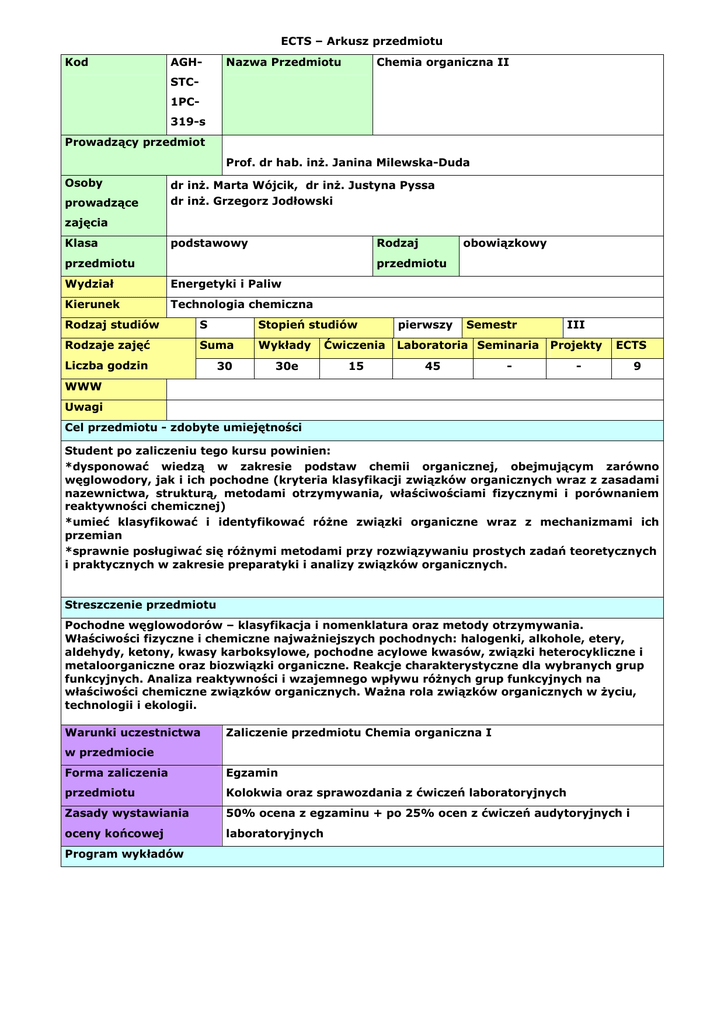 Chemia organiczna II - Wydział Energetyki i Paliw, AGH