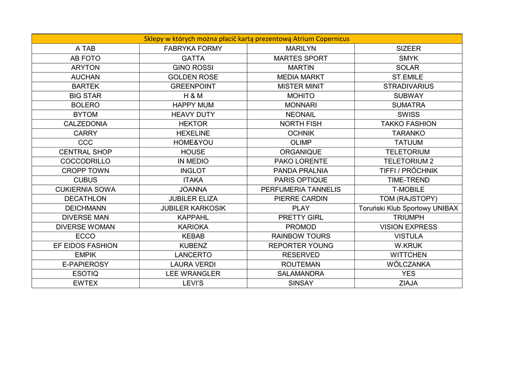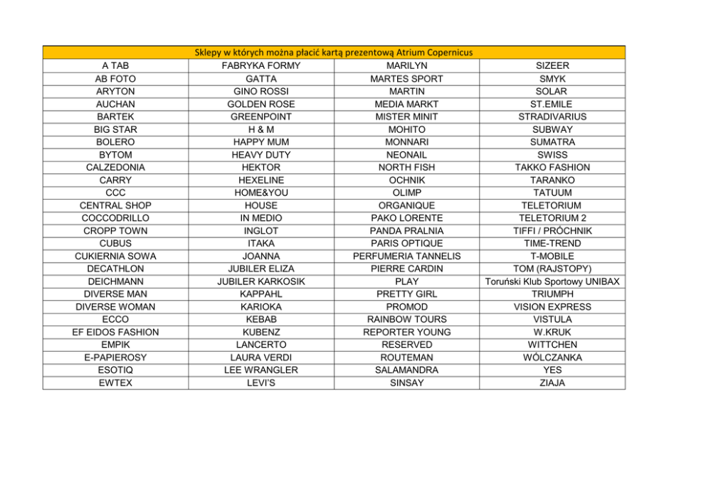 Sklepy w których można płacić kartą prezentową Atrium Copernicus A TAB AB FOTO ARYTON AUCHAN BARTEK BIG STAR BOLERO BYTOM CALZEDONIA CARRY CCC CENTRAL SHOP COCCODRILLO CROPP TOWN CUBUS CUKIERNIA SOWA DECATHLON DEICHMANN DIVERSE MAN DIVERSE WOMAN ECCO EF EIDOS FASHION EMPIK E-PAPIEROSY ESOTIQ EWTEX FABRYKA FORMY GATTA GINO ROSSI GOLDEN ROSE GREENPOINT H&M HAPPY MUM HEAVY DUTY HEKTOR HEXELINE HOME&YOU HOUSE IN MEDIO INGLOT ITAKA JOANNA JUBILER ELIZA JUBILER KARKOSIK KAPPAHL KARIOKA KEBAB KUBENZ LANCERTO LAURA VERDI LEE WRANGLER LEVI’S MARILYN MARTES SPORT MARTIN MEDIA MARKT MISTER MINIT MOHITO MONNARI NEONAIL NORTH FISH OCHNIK OLIMP ORGANIQUE PAKO LORENTE PANDA PRALNIA PARIS OPTIQUE PERFUMERIA TANNELIS PIERRE CARDIN PLAY PRETTY GIRL PROMOD RAINBOW TOURS REPORTER YOUNG RESERVED ROUTEMAN SALAMANDRA SINSAY SIZEER SMYK SOLAR ST.EMILE STRADIVARIUS SUBWAY SUMATRA SWISS TAKKO FASHION TARANKO TATUUM TELETORIUM TELETORIUM 2 TIFFI / PRÓCHNIK TIME-TREND T-MOBILE TOM (RAJSTOPY) Toruński Klub Sportowy UNIBAX TRIUMPH VISION EXPRESS VISTULA W.KRUK WITTCHEN WÓLCZANKA YES ZIAJA