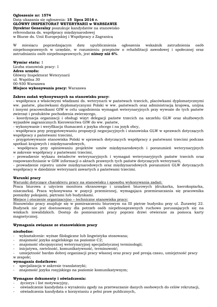 Ogłoszenie nr: 1574 Data ukazania się ogłoszenia: 15 lipca 2016 r. GŁÓWNY INSPEKTORAT WETERYNARII w WARSZAWIE Dyrektor Generalny poszukuje kandydatów na stanowisko referendarza ds. współpracy międzynarodowej w Biurze ds. Unii Europejskiej i Współpracy z Zagranicą W miesiącu poprzedzającym datę upublicznienia ogłoszenia wskaźnik zatrudnienia osób niepełnosprawnych w urzędzie, w rozumieniu przepisów o rehabilitacji zawodowej i społecznej oraz zatrudnianiu osób niepełnosprawnych, jest niższy niż 6%. Wymiar etatu: 1 Liczba stanowisk pracy: 1 Adres urzędu: Główny Inspektorat Weterynarii ul. Wspólna 30 00-930 Warszawa Miejsce wykonywania pracy: Warszawa Zakres zadań wykonywanych na stanowisku pracy: - współpraca z właściwymi władzami ds. weterynarii w państwach trzecich, placówkami dyplomatycznymi ww. państw, placówkami dyplomatycznymi Polski w ww. państwach oraz administracją krajową, unijną i innymi pracownikami GIW w celu uzgodnienia wymagań weterynaryjnych przy wywozie do tych państw zwierząt i produktów pochodzenia zwierzęcego, - koordynacja organizacji i obsługi wizyt delegacji państw trzecich na szczeblu GLW oraz służbowych wyjazdów zagranicznych Kierownictwa GIW do ww. państw, - wykonywanie i weryfikacja tłumaczeń z języka obcego i na język obcy, - współpraca przy przygotowywaniu propozycji negocjacyjnych i stanowiska GLW w sprawach dotyczących współpracy z państwami trzecimi, - przygotowywanie stanowiska Polski w sprawach dotyczących współpracy z państwami trzecimi podczas spotkań krajowych i międzynarodowych, - współpraca przy opiniowaniu projektów umów międzynarodowych i porozumień weterynaryjnych w zakresie współpracy z państwami trzecimi, - prowadzenie wykazu świadectw weterynaryjnych i wymagań weterynaryjnych państw trzecich oraz rozpowszechnianie w GIW informacji o aktach prawnych tych państw dotyczących weterynarii, - prowadzenie rejestru umów międzynarodowych oraz międzynarodowych porozumień GLW dotyczących współpracy w dziedzinie weterynarii zawartych z państwami trzecimi. Warunki pracy Warunki dotyczące charakteru pracy na stanowisku i sposobu wykonywania zadań: Praca biurowa z użyciem monitora ekranowego i urządzeń biurowych (drukarka, kserokopiarka, niszczarka). Praca wykonywana w pozycji przemiennej, wymagająca przemieszczania się pracownika pomiędzy pokojami, piętrami lub budynkami. Miejsce i otoczenie organizacyjno – techniczne stanowiska pracy: Stanowisko pracy znajduje się w pomieszczeniu biurowym na III piętrze budynku przy ul. Żurawiej 22. Budynek nie jest dostosowany dla potrzeb osób niepełnosprawnych ruchowo poruszających się na wózkach inwalidzkich. Dostęp do pomieszczeń pracy poprzez drzwi otwierane za pomocą karty magnetycznej. Wymagania związane ze stanowiskiem pracy niezbędne: - wykształcenie: wyższe filologiczne lub lingwistyka stosowana; - znajomość języka angielskiego na poziomie C2; - znajomość obcojęzycznej weterynaryjnej specjalistycznej terminologii; - inicjatywa, rzetelność, komunikatywność, terminowość; - umiejętność bardzo dobrej organizacji pracy własnej oraz pracy pod presją czasu, umiejętność pracy w zespole; wymagania dodatkowe: - specjalizacja w zakresie translatoryki; - znajomość języka rosyjskiego na poziomie komunikatywnym; Wymagane dokumenty i oświadczenia: życiorys i list motywacyjny, oświadczenie kandydata o wyrażeniu zgody na przetwarzanie danych osobowych do celów rekrutacji, oświadczenia kandydata o korzystaniu z pełni praw publicznych, - oświadczenie kandydata o nieskazaniu prawomocnym wyrokiem za umyślne przestępstwo lub umyślne przestępstwo skarbowe, kopie dokumentów potwierdzających wykształcenie, kopia dokumentu potwierdzającego posiadanie polskiego obywatelstwa lub oświadczenie o posiadaniu obywatelstwa polskiego. Kopie innych dokumentów i oświadczenia: kopia dokumentu potwierdzającego niepełnosprawność – w przypadku kandydatów, którzy zamierzają skorzystać z pierwszeństwa w zatrudnieniu w przypadku, gdy znajdą się w gronie najlepszych kandydatów. Termin składania dokumentów: 25 lipca 2016 r. Miejsce składania dokumentów: Główny Inspektorat Weterynarii, ul. Wspólna 30, 00–930 Warszawa z dopiskiem: „oferta pracy” i numerem ogłoszenia Inne informacje: Rozpoczęcie pracy: 1 października 2016 r. Proponowane wynagrodzenie zasadnicze: ok 3100 zł brutto. Oferty otrzymane lub uzupełniane po terminie nie będą rozpatrywane (decyduje data stempla pocztowego). Dokumenty złożone w aplikacji nie będą zwracane. Kandydaci zakwalifikowani do naboru zostaną powiadomieni telefoniczne lub e-mailem o jego terminie. Po zakończeniu naboru oferty osób niezatrudnionych zostaną zniszczone. Wzór oświadczeń dla kandydata do pobrania ze strony www.wetgiw.gov.pl – zakładka Praca. Dodatkowe informacje: (22) 502-31-74. Autor Data wytworzenia Opublikował Data publikacji Anna Witkowiak 14.07.2016 Józef Brudnowski 15.07.2016