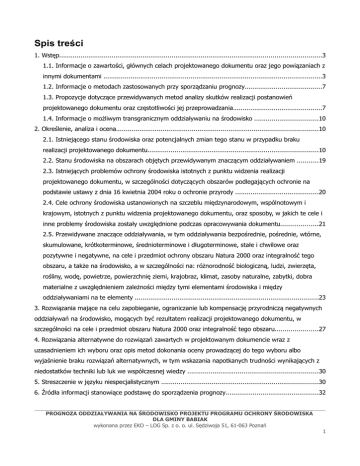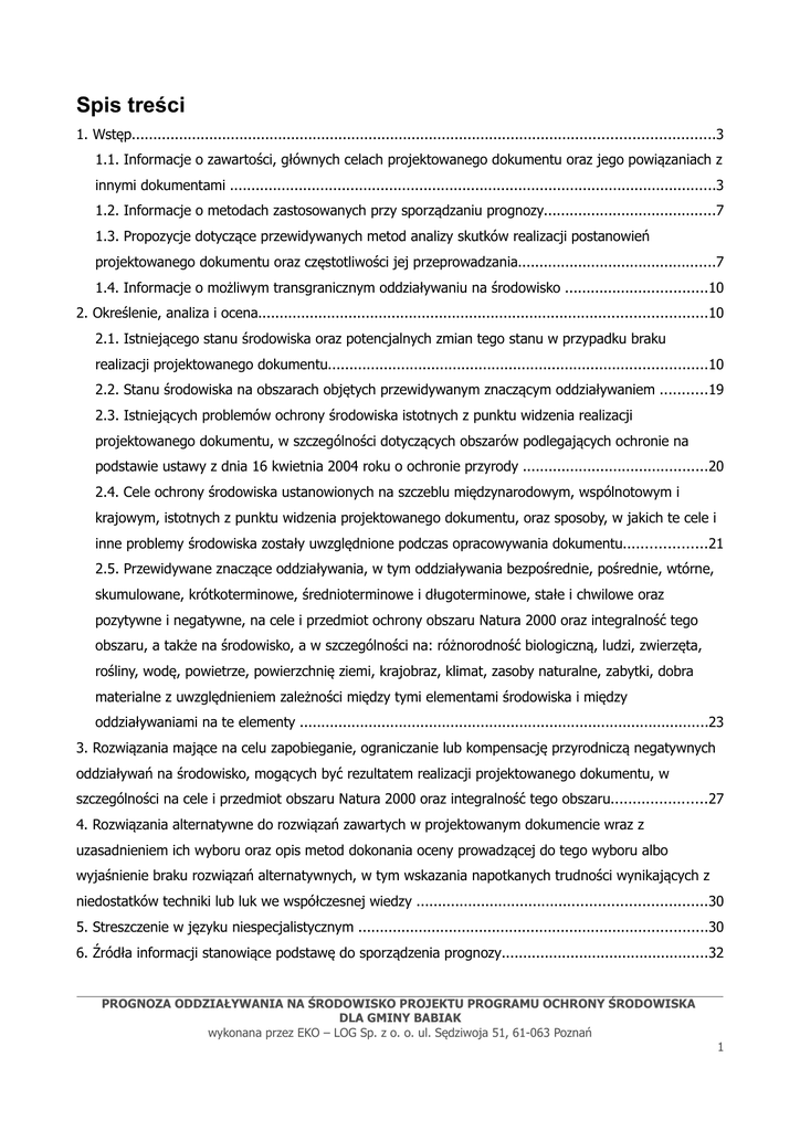 Spis treści 1. Wstęp.......................................................................................................................................3 1.1. Informacje o zawartości, głównych celach projektowanego dokumentu oraz jego powiązaniach z innymi dokumentami .................................................................................................................3 1.2. Informacje o metodach zastosowanych przy sporządzaniu prognozy........................................7 1.3. Propozycje dotyczące przewidywanych metod analizy skutków realizacji postanowień projektowanego dokumentu oraz częstotliwości jej przeprowadzania..............................................7 1.4. Informacje o możliwym transgranicznym oddziaływaniu na środowisko .................................10 2. Określenie, analiza i ocena........................................................................................................10 2.1. Istniejącego stanu środowiska oraz potencjalnych zmian tego stanu w przypadku braku realizacji projektowanego dokumentu........................................................................................10 2.2. Stanu środowiska na obszarach objętych przewidywanym znaczącym oddziaływaniem ...........19 2.3. Istniejących problemów ochrony środowiska istotnych z punktu widzenia realizacji projektowanego dokumentu, w szczególności dotyczących obszarów podlegających ochronie na podstawie ustawy z dnia 16 kwietnia 2004 roku o ochronie przyrody ...........................................20 2.4. Cele ochrony środowiska ustanowionych na szczeblu międzynarodowym, wspólnotowym i krajowym, istotnych z punktu widzenia projektowanego dokumentu, oraz sposoby, w jakich te cele i inne problemy środowiska zostały uwzględnione podczas opracowywania dokumentu...................21 2.5. Przewidywane znaczące oddziaływania, w tym oddziaływania bezpośrednie, pośrednie, wtórne, skumulowane, krótkoterminowe, średnioterminowe i długoterminowe, stałe i chwilowe oraz pozytywne i negatywne, na cele i przedmiot ochrony obszaru Natura 2000 oraz integralność tego obszaru, a także na środowisko, a w szczególności na: różnorodność biologiczną, ludzi, zwierzęta, rośliny, wodę, powietrze, powierzchnię ziemi, krajobraz, klimat, zasoby naturalne, zabytki, dobra materialne z uwzględnieniem zależności między tymi elementami środowiska i między oddziaływaniami na te elementy ...............................................................................................23 3. Rozwiązania mające na celu zapobieganie, ograniczanie lub kompensację przyrodniczą negatywnych oddziaływań na środowisko, mogących być rezultatem realizacji projektowanego dokumentu, w szczególności na cele i przedmiot obszaru Natura 2000 oraz integralność tego obszaru......................27 4. Rozwiązania alternatywne do rozwiązań zawartych w projektowanym dokumencie wraz z uzasadnieniem ich wyboru oraz opis metod dokonania oceny prowadzącej do tego wyboru albo wyjaśnienie braku rozwiązań alternatywnych, w tym wskazania napotkanych trudności wynikających z niedostatków techniki lub luk we współczesnej wiedzy ...................................................................30 5. Streszczenie w języku niespecjalistycznym .................................................................................30 6. Źródła informacji stanowiące podstawę do sporządzenia prognozy................................................32 PROGNOZA ODDZIAŁYWANIA NA ŚRODOWISKO PROJEKTU PROGRAMU OCHRONY ŚRODOWISKA DLA GMINY BABIAK wykonana przez EKO – LOG Sp. z o. o. ul. Sędziwoja 51, 61-063 Poznań 1 7. Spis tabel.................................................................................................................................32 PROGNOZA ODDZIAŁYWANIA NA ŚRODOWISKO PROJEKTU PROGRAMU OCHRONY ŚRODOWISKA DLA GMINY BABIAK wykonana przez EKO – LOG Sp. z o. o. ul. Sędziwoja 51, 61-063 Poznań 2 1. Wstęp 1.1. Informacje o zawartości, głównych celach projektowanego dokumentu oraz jego powiązaniach z innymi dokumentami Stan aktualny środowiska i infrastruktury został przyjęty jako punkt odniesienia Programu Ochrony Środowiska. Program został opracowany w oparciu o informacje uzyskane od przedstawicieli Urzędu Gminy w Babiaku oraz jednostek organizacyjnych, które zajmują się zagadnieniami związanymi z ochroną środowiska, rozwojem infrastruktury oraz edukacją ekologiczną. Do podstawowych zadań należało: • Zgromadzenie, przegląd i ocena wszelkich dostępnych informacji o stanie środowiska Gminy Babiak; • Ustalenie formy i zakresu opracowania; • Określenie metod realizacji Programu oraz jego monitorowanie; • Przygotowanie harmonogramu celów strategicznych i kierunków działań w realizacji Programu Ochrony Środowiska; • Weryfikacja Programu przez przedstawicieli Urzędu Gminy w Babiaku oraz omawianie uwag; Program Ochrony Środowiska został oparty o „Politykę ekologiczną państwa na lata 2009-2012 z perspektywą do roku 2016”, w którym wyznaczono następujące działania priorytetowe na najbliższe 4 lata: • Zakończenie w bieżącym roku prac nad wyznaczaniem obszarów Natura 2000; • Wprowadzenie w życie tzw. zielonych zamówień; • Przyjęcie projektu ustawy o organizmach genetycznie modyfikowanych, zgodnie z prawem UE; • Zamknięcie do końca bieżącego roku składowisk nie spełniających wymogów ochrony środowiska; • Wzmocnienie kadry inspekcji ochrony środowiska, która usprawni ochronę środowiska i pozwoli na kontrolę przestrzegania prawa. Wśród priorytetów polityki ekologicznej znajduje się także ochrona atmosfery i wód, gospodarka odpadami, zwiększenie retencji wody, opracowanie strategii ochrony gleb, modernizacja systemów energetycznych i wspieranie ekoinnowacyjności. Dokument ten składa się z następujących części: • Wstęp – przedstawia podstawę p