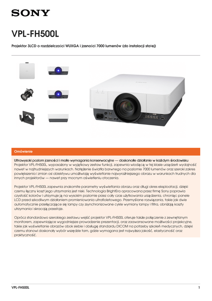 VPL-FH500L Projektor 3LCD o rozdzielczości WUXGA i jasności 7000 lumenów (do instalacji stałej) Omówienie Ultrawysoki poziom jasności i małe wymagania konserwacyjne — doskonałe działanie w każdym środowisku Projektor VPL-FH500L, wyposażony w wyjątkowy zestaw funkcji, zapewnia wiodącą w tej klasie urządzeń wydajność nawet w najtrudniejszych warunkach. Natężenie światła barwnego na poziomie 7000 lumenów oraz szeroki zakres powiększenia i zmian osi obiektywu umożliwiają wyświetlanie najwyraźniejszego obrazu w warunkach trudnych dla innych projektorów — nawet przy mocnym oświetleniu otoczenia. Projektor VPL-FH500L zapewnia znakomite parametry wyświetlania obrazu oraz długi okres eksploatacji, dzięki czemu łączny koszt jego utrzymania jest niski. Technologia BrightEra opracowana przez firmę Sony poprawia czystość kolorów i utrzymuje ją na wysokim poziomie przez cały czas użytkowania urządzenia, chroniąc panele LCD przed szkodliwym działaniem promieniowania ultrafioletowego. Przemyślane rozwiązania, takie jak dwie automatycznie przełączające się lampy czy zsynchronizowane cykle wymiany lampy i filtra, obniżają koszty utrzymania i skracają przestoje. Oprócz standardowo szerokiego zestawu wejść projektor VPL-FH500L oferuje także połączenie z zewnętrznym monitorem, zapewniające wygodniejsze prowadzenie prezentacji, oraz zaawansowane możliwości projekcyjne, takie jak wyświetlanie obrazów obok siebie i obsługę standardu DICOM na potrzeby szkoleń medycznych, dzięki czemu stanowi doskonały wybór wszędzie tam, gdzie wymagana jest najwyższa jakość, elastyczność oraz praktyczność. VPL-FH500L 1 Funkcje • Technologia panelu 3LCD WUXGA BrightEra Technologia panelu BrightEra opracowana przez firmę Sony zapewnia dokładniejsze odwzorowywanie kolorów, większą jasność oraz dłuższy okres eksploatacji przy niższym całkowitym koszcie posiadania. • Ultrawysoka rozdzielczość Rozdzielczość WUXGA (1920x1200) w formacie 16:10 projektora VPL-FH500L zapewnia najlepszą jakość obrazu. • Wyjątkowo wysoka jasność: Natężenie światła kolorowego 7000 lumenów Ultrawysokie natężenie światła kolorowego — 7000 lumenów — projektora VPL-FH500L zapewnia bardzo wyraźny obraz przy mocnym oświetleniu otoczenia, dlatego też projektor ten doskonale nadaje się do większych obiektów. • Szeroki zakres regulacji położenia rzucanego obrazu: +/-113% w pionie, +/-63% w poziomie (zależnie od wybranego obiektywu) Szeroki zakres regulacji położenia rzucanego obrazu umożliwia umieszczenie projektora VPL-FH500L bliżej sufitu bądź przesunięcie go w poziomie w celu ominięcia konstrukcyjnych przeszkód na suficie. • Wymienne obiektywy Projektor VPL-FH500L umożliwia wybór parametrów optycznych przy użyciu obiektywów zgodnych z poprzednimi modelami. • System dwulampowy Wbudowana druga lampa zapewnia automatyczne rozwiązanie zapasowe. Dwie lampy mogą być używane naprzemiennie. • Synchronizacja cykli wymiany lampy i filtra Synchronizacja czasu wymaganej wymiany lampy i filtra redukuje o połowę liczbę wizyt niezbędnych do utrzymania projektora w optymalnym stanie. (Filtry są dostarczane z lampą wymienną). • Wyświetlanie dwóch obrazów z różnych źródeł Ten projektor umożliwia jednoczesne wyświetlanie na jednym ekranie dwóch obrazów z dwóch wejść (RGB i dowolnego innego wejścia), dlatego też nadaje się idealnie do takich zastosowań, jak wideokonferencje i szkolenia medyczne przy użyciu standardu DICOM. • Symulacja standardu DICOM GSDF Projektor VPL-FH500L umożliwia symulację standardu DICOM GSDF (HDMI z sygnałami komputerowymi) zgodną ze specyfikacją GSDF (Grayscale Standard Display Function) norm medycznych DICOM (Digital Imaging and Communication in Medicine). • Szeroki zakres regulacji obrazu Szeroki zakres regulacji obrazu umożliwia instalację projektora w niemal dowolnym miejscu. Podczas wymiany sprzętu instalatorzy prawdopodobnie zechcą wykorzystać dotychczasowe elementy mocujące. W przypadku nowych instalacji przyda się możliwość obejścia przeszkód. • Regulacja z poziomu panelu użytkownika Funkcja regulacji pikseli powoduje przesunięcie całego obrazu lub żądanego zakresu (16 x 10 pikseli w pionie/poziomie), umożliwiając uzyskanie pełnej korekcji kolorów. VPL-FH500L 2 • Dopasowanie kolorów Projektor VPL-FH500L umożliwia dopasowanie jasności i kolorów do oryginalnego obrazu, zapewniając pełną dokładność obrazu wyświetlanego. • Mniejszy niż w poprzednich modelach pobór mocy podczas działania Mniejszy pobór mocy sprzyja ograniczeniu zużycia energii i zmniejszeniu kosztów użytkowania urządzenia. VPL-FH500L 3 Specyfikacja techniczna System wyświetlania • System wyświetlania Trzy panele LCD Urządzenie wyświetlające • Rozmiar efektywnegoobszaru wyświetlania 3 panele LCD BrightEra 0,95" (24,1 mm), proporcja boków: 16:10 • Liczba pikseli 6,912,000 (1920 × 1200 × 3) pikseli Obiektyw projekcyjny • Ostrość Elektryczna/ręczna (zależnie od obiektywu) • Powiększanie — elektrycznie/ręcznie • Zmiana osi obiektywu — elektrycznie/ręcznie Elektryczna/ręczna (zależnie od obiektywu) Elektryczna/ręczna (zależnie od obiektywu) Źródło światła • Typ Wysokociśnieniowa lampa rtęciowa • Moc Typ 330 W • System System dwulampowy Zalecany czas wymiany lampy*1 • Tryb jasności lampy: wysoki 6000 H (w przypadku sekwencyjnego wykorzystania dwóch lamp) • Tryb jasności lampy: standardowy 8000 H (w przypadku sekwencyjnego wykorzystania dwóch lamp) Cykl czyszczenia/wymiany filtra (maks.)*1 • Cykl czyszczenia/wymiany filtra (maks.) W jednym momencie z wymianą lampy Rozmiar ekranu • Rozmiar ekranu 40" – 600" (1,02 m – 15,24 m) (pomiar po przekątnej) (zależnie od obiektywu) Natężenie światła • Tryb jasności lampy: wysoki 7000 lm • Tryb jasności lampy: standardowy 5600 lm Natężenie