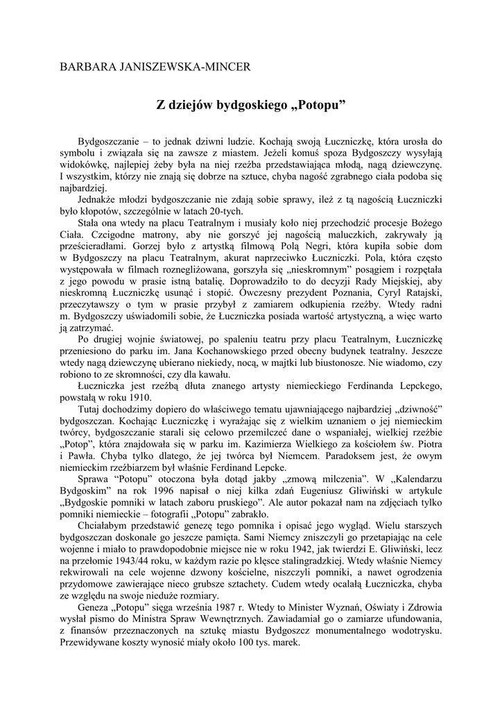 BARBARA JANISZEWSKA-MINCER Z dziejów bydgoskiego „Potopu” Bydgoszczanie – to jednak dziwni ludzie. Kochają swoją Łuczniczkę, która urosła do symbolu i związała się na zawsze z miastem. JeŜeli komuś spoza Bydgoszczy wysyłają widokówkę, najlepiej Ŝeby była na niej rzeźba przedstawiająca młodą, nagą dziewczynę. I wszystkim, którzy nie znają się dobrze na sztuce, chyba nagość zgrabnego ciała podoba się najbardziej. JednakŜe młodzi bydgoszczanie nie zdają sobie sprawy, ileŜ z tą nagością Łuczniczki było kłopotów, szczególnie w latach 20-tych. Stała ona wtedy na placu Teatralnym i musiały koło niej przechodzić procesje BoŜego Ciała. Czcigodne matrony, aby nie gorszyć jej nagością maluczkich, zakrywały ją prześcieradłami. Gorzej było z artystką filmową Polą Negri, która kupiła sobie dom w Bydgoszczy na placu Teatralnym, akurat naprzeciwko Łuczniczki. Pola, która często występowała w filmach roznegliŜowana, gorszyła się „nieskromnym” posągiem i rozpętała z jego powodu w prasie istną batalię. Doprowadziło to do decyzji Rady Miejskiej, aby nieskromną Łuczniczkę usunąć i stopić. Ówczesny prezydent Poznania, Cyryl Ratajski, przeczytawszy o tym w prasie przybył z zamiarem odkupienia rzeźby. Wtedy radni m. Bydgoszczy uświadomili sobie, Ŝe Łuczniczka posiada wartość artystyczną, a więc warto ją zatrzymać. Po drugiej wojnie światowej, po spaleniu teatru przy placu Teatralnym, Łuczniczkę przeniesiono do parku im. Jana Kochanowskiego przed obecny budynek teatralny. Jeszcze wtedy nagą dziewczynę ubierano niekiedy, nocą, w majtki lub biustonosze. Nie wiadomo, czy robiono to ze skromności, czy dla kawału. Łuczniczka jest rzeźbą dłuta znanego artysty niemieckiego Ferdinanda Lepckego, powstałą w roku 1910. Tutaj dochodzimy dopiero do właściwego tematu ujawniającego najbardziej „dziwność” bydgoszczan. Kochając Łuczniczkę i wyraŜając się z wielkim uznaniem o jej niemieckim twórcy, bydgoszczanie starali się celowo przemilczeć dane o wspaniałej, wielkiej rzeźbie „Potop”, która znajdowała się w parku im. Kazimierza Wielkiego za kościołem św. Piotra i Pawła. Chyba tylko dlatego, Ŝe jej twórca był Niemcem. Paradoksem jest, Ŝe owym niemieckim rzeźbiarzem był właśnie Ferdinand Lepcke. Sprawa “Potopu” otoczona była dotąd jakby „zmową milczenia”. W „Kalendarzu Bydgoskim” na rok 1996 napisał o niej kilka zdań Eugeniusz Gliwiński w artykule „Bydgoskie pomniki w latach zaboru pruskiego”. Ale autor pokazał nam na zdjęciach tylko pomniki niemieckie – fotografii „Potopu” zabrakło. Chciałabym przedstawić genezę tego pomnika i opisać jego wygląd. Wielu starszych bydgoszczan doskonale go jeszcze pamięta. Sami Niemcy zniszczyli go przetapiając na cele wojenne i miało to prawdopodobnie miejsce nie w roku 1942, jak twierdzi E. Gliwiński, lecz na przełomie 1943/44 roku, w kaŜdym razie po klęsce stalingradzkiej. Wtedy właśnie Niemcy rekwirowali na cele wojenne dzwony kościelne, niszczyli pomniki, a nawet ogrodzenia przydomowe zawierające nieco grubsze sztachety. Cudem wtedy ocalałą Łuczniczka, chyba ze względu na swoje nieduŜe rozmiary. Geneza „Potopu” sięga września 1987 r. Wtedy to Minister Wyznań, Oświaty i Zdrowia wysłał pismo do Ministra Spraw Wewnętrznych. Zawiadamiał go o zamiarze ufundowania, z finansów przeznaczonych na sztukę miastu Bydgoszcz monumentalnego wodotrysku. Przewidywane koszty wynosić miały około 100 tys. marek. Po otrzymaniu aprobaty Ministra Spraw Wewnętrznych, wysłano odpowiednie pismo do rejencji bydgoskiej. Wiadomość tę przekazano następnie władzom miasta Bydgoszczy. W pismach z Ministerstw sugerowano, Ŝe pomnik winien stanąć na ówczesnym Weltzinplatz (plac Wolności). W sprawie umiejscowienia pomnika – fontanny wywiązała się długa i burzliwa dyskusja, zarówno wśród władz miejskich, jak i samych bydgoszczan. PrzewaŜały sugestie, aŜeby pomnik ustawić koło gmachu teatru. Były jednak i inne propozycje – za odpowiednie na ten cel miejsca uwaŜano Nowy Rynek, plac Poznański, plac Piastowski, plac Wolności, a nawet wyspę Barbary przy moście Gdańskim. Władze miejskie uznały jednak, Ŝe najwłaściwszym miejscem będzie park przy placu Wolności, za kościołem św. Piotra i Pawła. Przeciwny temu pomysłowi był minister finansów, który przypomniał, Ŝe jest to teren naleŜący do rejencji i być moŜe będą tam w przyszłości stały nowe budynki – ponadto miasto musi wykupić od rejencji to miejsce. Jednak juŜ w listopadzie 1897 roku, zapadła ostateczna decyzja co do lokalizacji pomnika. Właśnie na placu Wolności. W styczniu 1898 roku ustalono, Ŝe naleŜy jak najszybciej ogłosić konkurs na pomnik. śeby uczestnicy konkursu mogli zapoznać się z miejscem pomnika i jego otoczeniem, zaczęto porządkować teren. Konkurs ogłoszono w marcu 1898 roku. Określono w nim lokalizację pomnika – fontanny, warunek iŜ musi on być wolno stojący, ze wszystkich stron dostępny, z brązu i Ŝe jego koszty powinny pomieścić się w granicach do 100 tys. marek. Biorący udział w konkursie mieli przekazywać modele i dokładne projekty do 1 listopada 1898 r. Do Królewskiej Akademii Sztuk w Berlinie. Konkurs miał zostać rozstrzygnięty przez Krajową Komisję Sztuki, w skład której wchodzili teŜ dwaj przedstawiciele Bydgoszczy. Komisja przewidywała 3 nagrody za najlepsze projekty w wysokości 3000, 2000 i 1000 marek. Zwycięzcą konkursu został profesor Ferdinand Lepcke, artysta -rzeźbiarz z Berlina. Przedstawił on projekt monumentalnej rzeźby za wodotryskiem, przedstawiającej scenę z potopu biblijnego. Został on uznany za najlepszy i jednogłośnie zatwierdzono jego realizację. Wiadomość o zwycięstwie Lepckego nadeszła oficjalnie do Bydgoszczy w połowie grudnia 1898 r. śeby bydgoszczanie mogli zapoznać się z modelem, przez cały s
