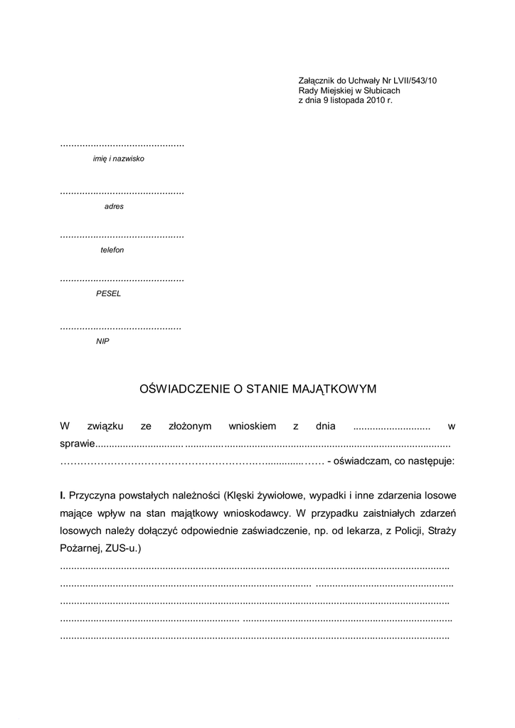 Załącznik do Uchwały Nr LVII/543/10 Rady Miejskiej w Słubicach z dnia 9 listopada 2010 r. ............................................. imię i nazwisko ............................................. adres ............................................. telefon ............................................. PESEL ............................................ NIP OŚWIADCZENIE O STANIE MAJĄTKOWYM W związku ze złożonym wnioskiem z dnia ............................ w sprawie................................ ................................................................................................ ………………………………………………….…..............…… - oświadczam, co następuje: I. Przyczyna powstałych należności (Klęski żywiołowe, wypadki i inne zdarzenia losowe mające wpływ na stan majątkowy wnioskodawcy. W przypadku zaistniałych zdarzeń losowych należy dołączyć odpowiednie zaświadczenie, np. od lekarza, z Policji, Straży Pożarnej, ZUS-u.) ............................................................................................................................................. ........................................................................................... .................................................. ............................................................................................................................................. ................................................................. ............................................................................ ............................................................................................................................................. ....................................... ...................................................................................................... ............................................................................................................................................. II. Sytuacja materialna Strony. 1. Wysokość dochodów własnych netto (proszę właściwe podkreślić i uzupełnić oraz dołączyć stosowne zaświadczenie): a) ze stosunku pracy ......................................................................................................... b) z działalności gospodarczej (proszę podać jej zakres) .................................................. ............................................................................................................................................. c) z gospodarstwa rolnego (proszę podać jego powierzchnię i zakres działalności rolniczej) …………………................................. …............................................................... ..................................................................................... ........................................................ d) pozostałe (proszę właściwe podkreślić i uzupełnić): - renta (inwalidzka gr ........, rodzinna) ………………….............……………….…………… - emerytura ………………………………………………………….............……….................. - prace zlecone ...................................................................................... ............................. - zasiłek dla bezrobotnych ………………………………………............................. ............... - zasiłek z opieki społecznej ………………………………………............................ ............. - alimenty .............................................................................................................. .............. - dodatek mieszkaniowy ………………………………………………………………............... 2. Wysokość dochodów netto osób pozostających we wspólnym gospodarstwie domowym (proszę właściwe podkreślić i uzupełnić oraz dołączyć stosowne zaświadczenia i podać stopień pokrewieństwa): a) ze stosunku pracy ................................................... ...................................................... b) z działalności gospodarczej (proszę podać jej zakres) .................................................. ............................................................................................. ................................................ c) z gospodarstwa rolnego (proszę podać jego powierzchnię i zakres działalności rolniczej) …………………................................. …............................................................... ............................................................................................................................................. d) pozostałe (proszę właściwe podkreślić i uzupełnić): - renta (inwalidzka gr ........, rodzinna) ………………….............……………….…………… - emerytura ………………………………………………………….............……….................. - prace zlecone ...................................................................................... ............................. - zasiłek dla bezrobotnych ………………………………………............................. ............... - zasiłek z opieki społecznej ………………………………………............................ ............. - alimenty .............................................................................................................. .............. - dodatek mieszkaniowy ………………………………………………………………............... 3. Ilość osób pozostających na utrzymaniu Strony, w tym ilość dzieci uczących się (proszę podać płeć, wiek i rodzaj szkoły do których uczęszczają): ......................................... .................................................................................................... .....