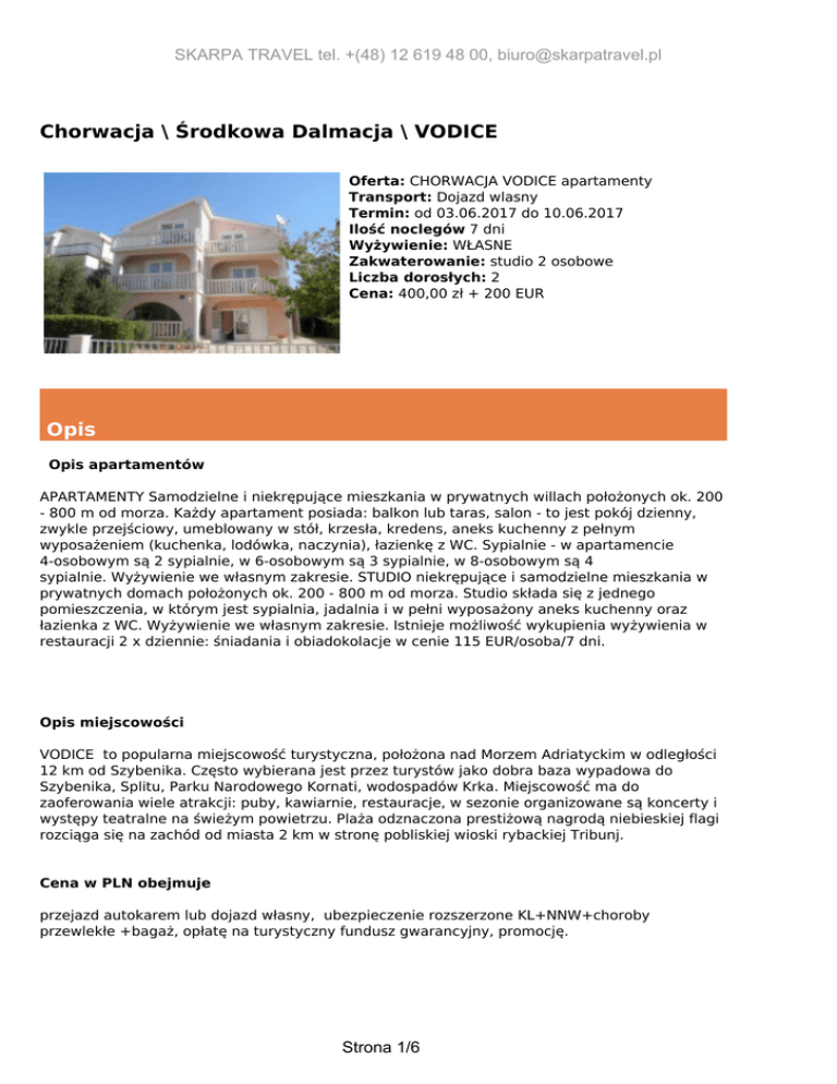 SKARPA TRAVEL tel. +(48) 12 619 48 00, [email protected] Chorwacja \ Środkowa Dalmacja \ VODICE Oferta: CHORWACJA VODICE apartamenty Transport: Dojazd wlasny Termin: od 03.06.2017 do 10.06.2017 Ilość noclegów 7 dni Wyżywienie: WŁASNE Zakwaterowanie: studio 2 osobowe Liczba dorosłych: 2 Cena: 400,00 zł + 200 EUR Opis Opis apartamentów APARTAMENTY Samodzielne i niekrępujące mieszkania w prywatnych willach położonych ok. 200 - 800 m od morza. Każdy apartament posiada: balkon lub taras, salon - to jest pokój dzienny, zwykle przejściowy, umeblowany w stół, krzesła, kredens, aneks kuchenny z pełnym wyposażeniem (kuchenka, lodówka, naczynia), łazienkę z WC. Sypialnie - w apartamencie 4-osobowym są 2 sypialnie, w 6-osobowym są 3 sypialnie, w 8-osobowym są 4 sypialnie. Wyżywienie we własnym zakresie. STUDIO niekrępujące i samodzielne mieszkania w prywatnych domach położonych ok. 200 - 800 m od morza. Studio składa się z jednego pomieszczenia, w którym jest sypialnia, jadalnia i w pełni wyposażony aneks kuchenny oraz łazienka z WC. Wyżywienie we własnym zakresie. Istnieje możliwość wykupienia wyżywienia w restauracji 2 x dziennie: śniadania i obiadokolacje w cenie 115 EUR/osoba/7 dni. Opis miejscowości VODICE to popularna miejscowość turystyczna, położona nad Morzem Adriatyckim w odległości 12 km od Szybenika. Często wybierana jest przez turystów jako dobra baza wypadowa do Szybenika, Splitu, Parku Narodowego Kornati, wodospadów Krka. Miejscowość ma do zaoferowania wiele atrakcji: puby, kawiarnie, restauracje, w sezonie organizowane są koncerty i występy teatralne na świeżym powietrzu. Plaża odznaczona prestiżową nagrodą niebieskiej flagi rozciąga się na zachód od miasta 2 km w stronę pobliskiej wioski rybackiej Tribunj. Cena w PLN obejmuje przejazd autokarem lub dojazd własny, ubezpieczenie rozszerzone KL+NNW+choroby przewlekłe +bagaż, opłatę na turystyczny fundusz gwarancyjny, promocję. Strona 1/6 SKARPA TRAVEL tel. +(48) 12 619 48 00, [email protected] Cena w EUR obejmuje 7 lub 14 noclegów, korzystanie z prądu, wody i pościeli, taksa klimatyczna. Dopłaty 1. Do klimatyzacji 50 EUR /apartament (w apartamencie urządzenie klimatyzacyjne w salonie) konieczna rezerwacja przy zakupie. Zniżki W cenie uwzględniona PROMOCJĘ FIRST MINUTE: przy dojeździe autokarem – 100 zł / osoba przy dojeździe własnym – 50 zł / osoba 1. Dziecko do lat 7 jako dodatkowa osoba w apartamencie bez łóżka płaci 360 zł 2. Osoba na dostawce płaci kwotę w zł + 60 EUR 3. STAŁY KLIENT: obejmuje osoby korzystające trzeci kolejny rok z naszej oferty ! Uwagi organizatora 1.Kwota w złotych płatna jest w Polsce, kwota w EUR płatna w Chorwacji. 2.Przy dojeździe własnym, gdy potrzebna jest faktura na całość i przy zakupie ubezpieczenia od kosztów rezygnacji wtedy obowiązkowo równowartość kwoty w EUR płatna jest w Polsce. Kwota w EUR przeliczana jest na zł wg kursu NBP pieniądz sprzedaż z dnia ostatniej wpłaty. 3.W dniu wykupienia imprezy/ wpłaty zaliczki klient ma możliwość wykupienia dodatkowego ubezpieczenia od kosztów rezygnacji z imprezy zgodnie z Ogólnymi Warunkmi Ubezpieczenia KOSZTÓW IMPREZY TURYSTYCZNEJ w wysokości 3,3% jednak nie później niż 5 dni od dnia podpisania umowy. 4. Wycieczki fakultatywne organizowane są przez lokalne biura podróży. 5.Doba hotelowa rozpoczyna się o godz 14 i kończy o godz 9. 6. Miejsca i godziny odjazdów autokarów podano w rozkładzie jazdy 7. Potrzebny DOWÓD OSOBISTY lub PASZPORT ! Prosze pamiętać również o dokumencie dla dzieci. 8. Dla osób dojeżdżających do Krakowa możemy zarezerwować przednocleg w cenie od 100 zł. Strona 2/6 SKARPA TRAVEL tel. +(48) 12 619 48 00, [email protected] Uwagi przewoźnika 1.Transport na trasach antenowych w Polsce możliwy jest mikrobusem, autokarem klasy turystycznej, samochodem osobowym lub innym przewoźnikiem np. Polskim Busem, Luxbusem, PKP, PKS itp. Ewentualną zmianę godzin odjazdów podamy najpóźniej na 24 godziny przed odjazdem. Trasa połączeń na terenie kraju zależy od zgłoszeń z poszczególnych miast, co może spowodować, ze przejazd nie będzie realizowany najkrótszą z możliwych tras. 2. Na trasach poza granicami Polski transport odbywa się autokarami wyposażonymi w siedzenia uchylne, klimatyzację, toalety, video i nagłośnienie. Przy małej ilości osób, możliwość przewozu uczestników małym autobusem bez WC i mini baru, wtedy toalety na postojach płatne przez przewoźnika. 3. Podane godziny wyjazdów i przyjazdów mogą ulec zmianie z różnych przyczyn np. złe warunki drogowe, atmosferyczne, zwiększanie ruchu na drogach szczególnie w szczycie sezonu letniego i inne. 4. Prosimy o przybycie na miejsce zbiórki najpóźniej 15 minut przed planowaną godziną odjazdu. Miejsca w autokarze są przydzielane w kolejności podpisania umowy, a klienci o miejscach informowani są przez obsługę na miejscu zbiórki. W autokarze obowiązuje całkowity zakaz palenia papierosów oraz spożywania alkoholu. Osoby korzystające z samego przejazdu, powinny obowiązkowo ubezpieczyć się na czas pobytu. Przewoźnik gwarantuje tylko ubezpieczenie na czas przejazdu. Ramowy program imprezy (klasyczny 7 noclegowy) 1 dzień Wyjazd z Polski zgodnie z rozkładem jazdy, przejazd przez Słowację (dla chętnych posiłek za opłatą ok 5 EUR) i Węgry. 2 dzień przyjazd do Chorwacji na miejsce wypoczynku. Zakwaterowanie od godziny 14:00, nocleg. 2 – 8 dzień Wypoczynek, możliwość wykupienia wycieczek fakultatywnych. 9 dzień wykwaterowanie z pokoi do godz. 9:00 czas wolny. wyjazd w drogę powrotną zgodnie z rozkładem jazdy, przejazd przez Chorwację. 10 dzień Przejazd przez Węgry i Słowację (dla chętnych posiłek za opłatą ok. 5 EUR). Orientacyjny przyjazd do Krakowa ok. godz 15. Praktyczne informacje Najblizsza placówka dyplomatyczna:Ambasada RP, Krlezin Gvozd 3, 10000 Zagreb tel. (+385) 14834575,