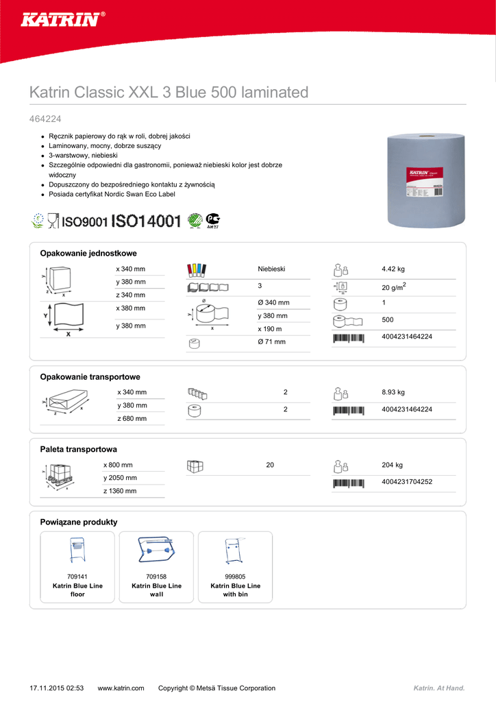 Katrin Classic XXL 3 Blue 500 laminated 464224 l l l l l l Ręcznik papierowy do rąk w roli, dobrej jakości Laminowany, mocny, dobrze suszący 3-warstwowy, niebieski Szczególnie odpowiedni dla gastronomii, ponieważ niebieski kolor jest dobrze widoczny Dopuszczony do bezpośredniego kontaktu z żywnością Posiada certyfikat Nordic Swan Eco Label Opakowanie jednostkowe x 340 mm y 380 mm Niebieski 4.42 kg 3 20 g/m2 Ø 340 mm 1 z 340 mm x 380 mm y 380 mm y 380 mm 500 x 190 m Ø 71 mm 4004231464224 Opakowanie transportowe x 340 mm y 380 mm 2 8.93 kg 2 4004231464224 z 680 mm Paleta transportowa x 800 mm 20 y 2050 mm 204 kg 4004231704252 z 1360 mm Powiązane produkty 709141 Katrin Blue Line floor 17.11.2015 02:53 709158 Katrin Blue Line wall www.katrin.com 999805 Katrin Blue Line with bin Copyright © Metsä Tissue Corporation Katrin. At Hand.