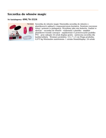 Szczotka do włosów magic Nr katalogowy: 090,76-3324 Szczotka do włosów magic Niezwykła szczotka do włosów o plastikowych ząbkach i ergonomicznym kształcie. Świetnie rozczesze włosy i pomoże w pielęgnacji. Wysyłamy jako mix kolorów. Gadżet w skrócie: - szczotka do włosów - wykonana z plastiku - miękkie plastikowe trzonki czeszące - zapakowane w przezroczyste pudełko PVC - przy zakupie 24 sztuk display gratis - użyteczna szczotka dla każdej kobiety Wymiary produktu: 13 x 7 x 5 cm Waga produtku: 0,075 kg Minimalne zamówienie: 1 sztuka Stand/display: 24 sztuki